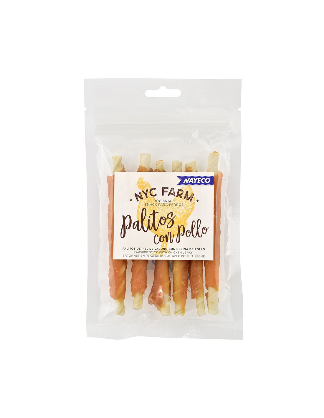 Palitos masticables de piel de vacuno y cecina de pollo para perros. estos deliciosos snacks hechos con ingredientes de alta calidad combinan la textura crujiente de un palito masticable con el sabor jugoso del pollo