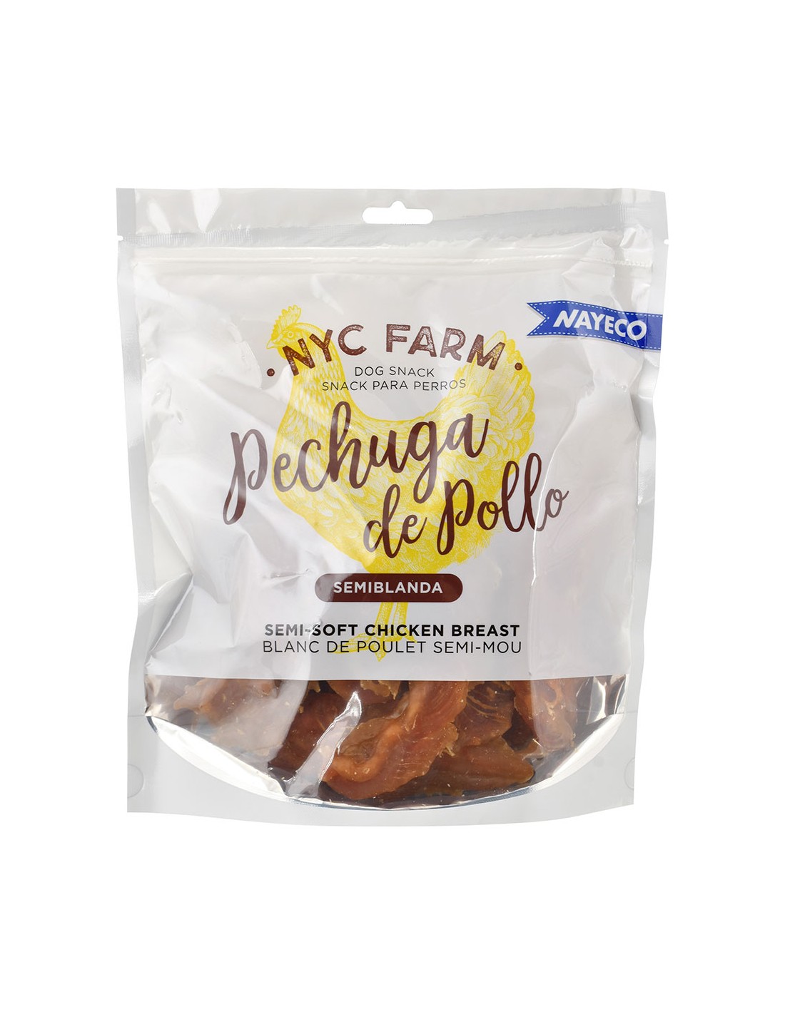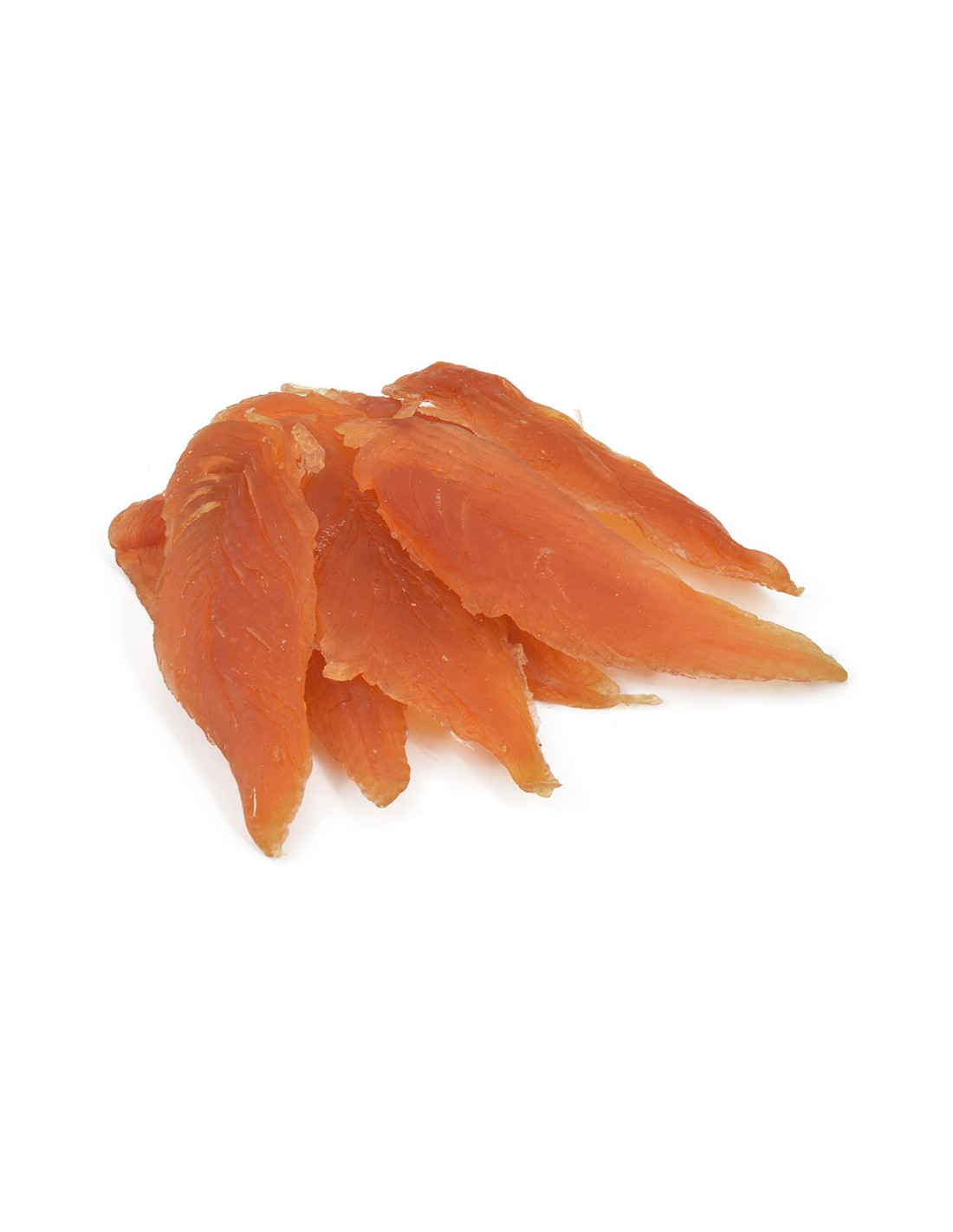 Tiras de pechuga de pollo deshidratado con ingredentes naturales de alta calidad, de textura semiblanda. snack natural con alto contenido en proteinas y bajo en grasas. ayudan al mantenimiento de la higiene bucal. textura agradable y de fácil digestión