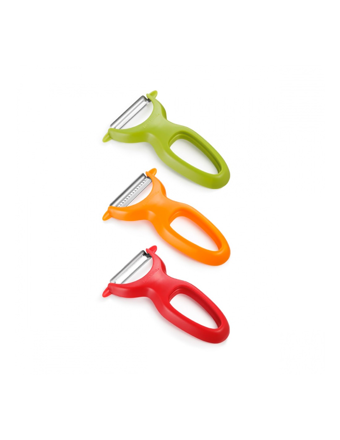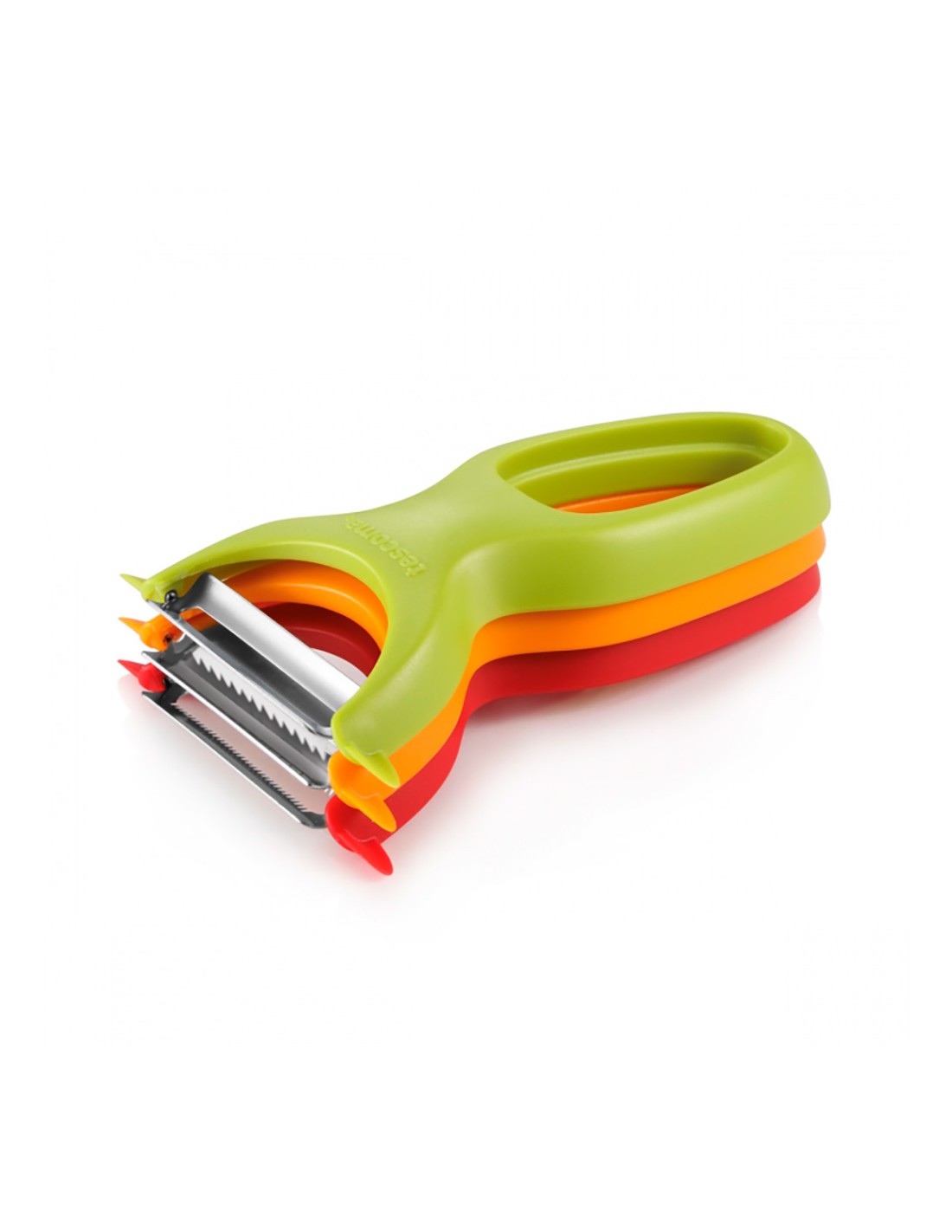 Conjunto de 3 peladores de verduras presto expert con hojas de acero inoxidable con tres formas: recta, serrada y para cortar en juliana. se pueden unir y guardar juntos para ahorrar espacio. apto para lavavajillas