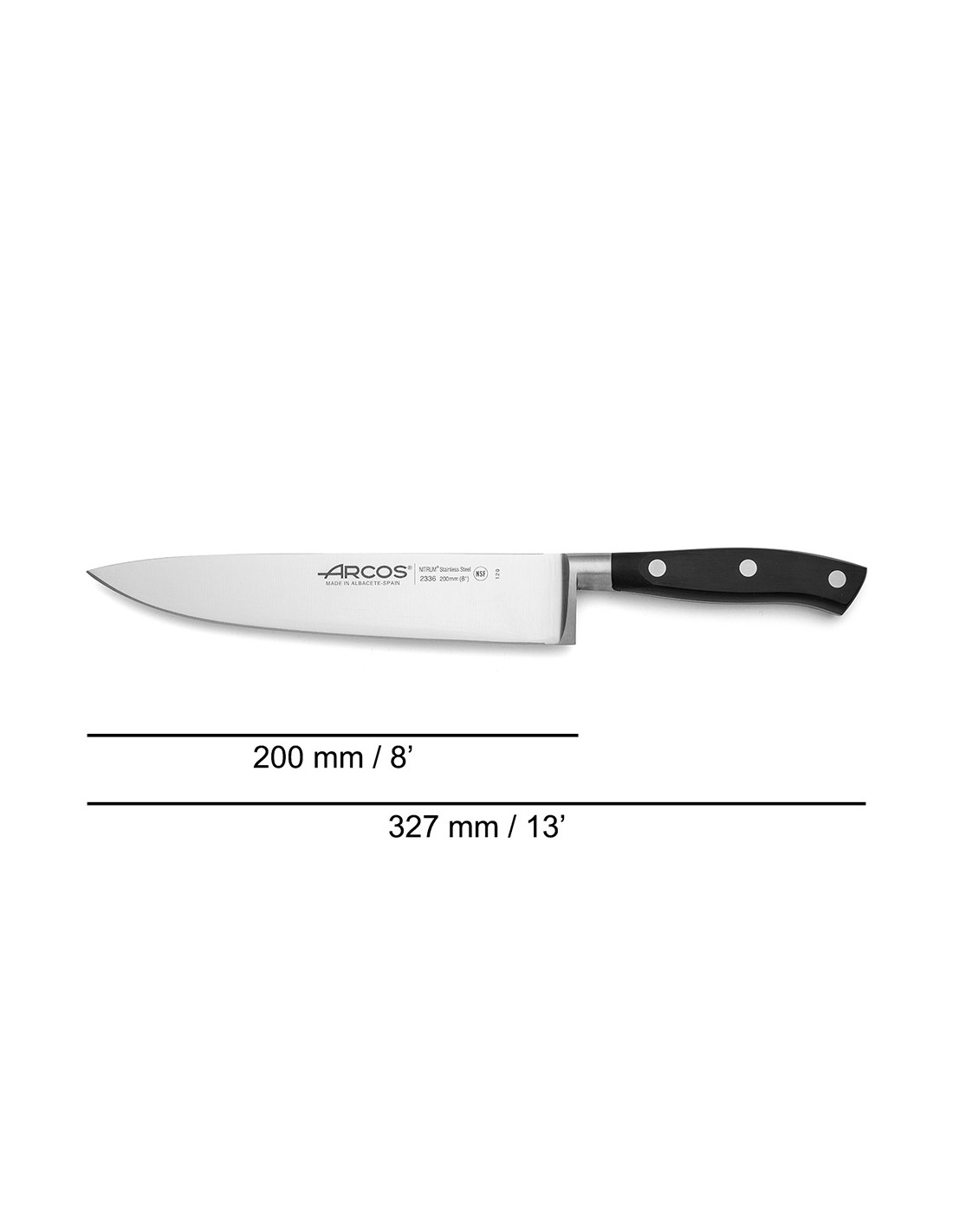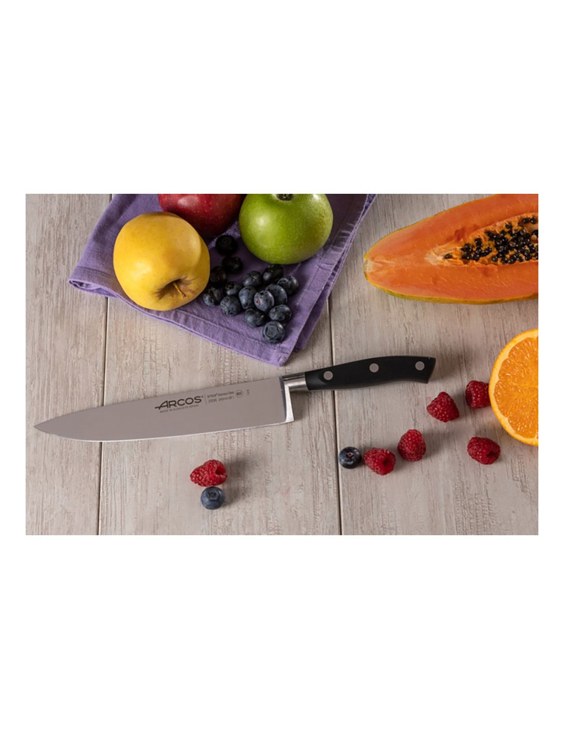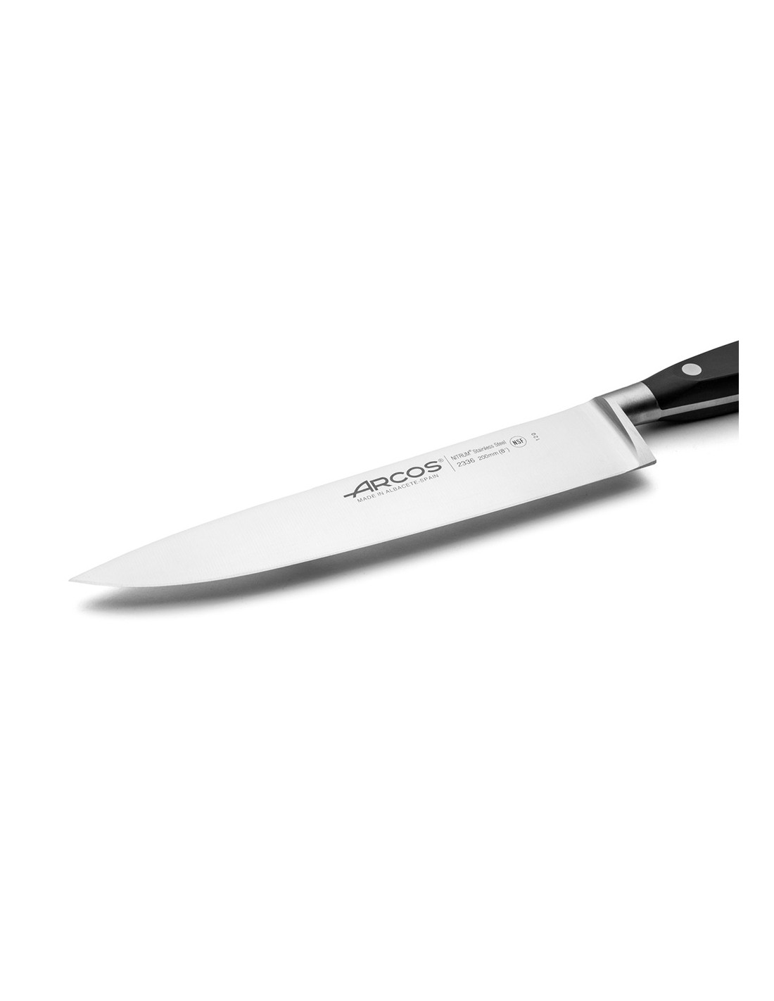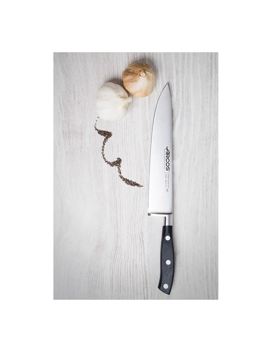 Cuchillo cocinero serie riviera 200 mm. forjado en una sola pieza con acero inoxidable nitrum. mango de polioximetileno y sus remaches de acero inoxidable, que hacen que sea resistente a la corrosión. cuenta con un sistema anti-bacteriano en su mango que reduce en un 99,9 % la presencia de bacterias, hongos o moho