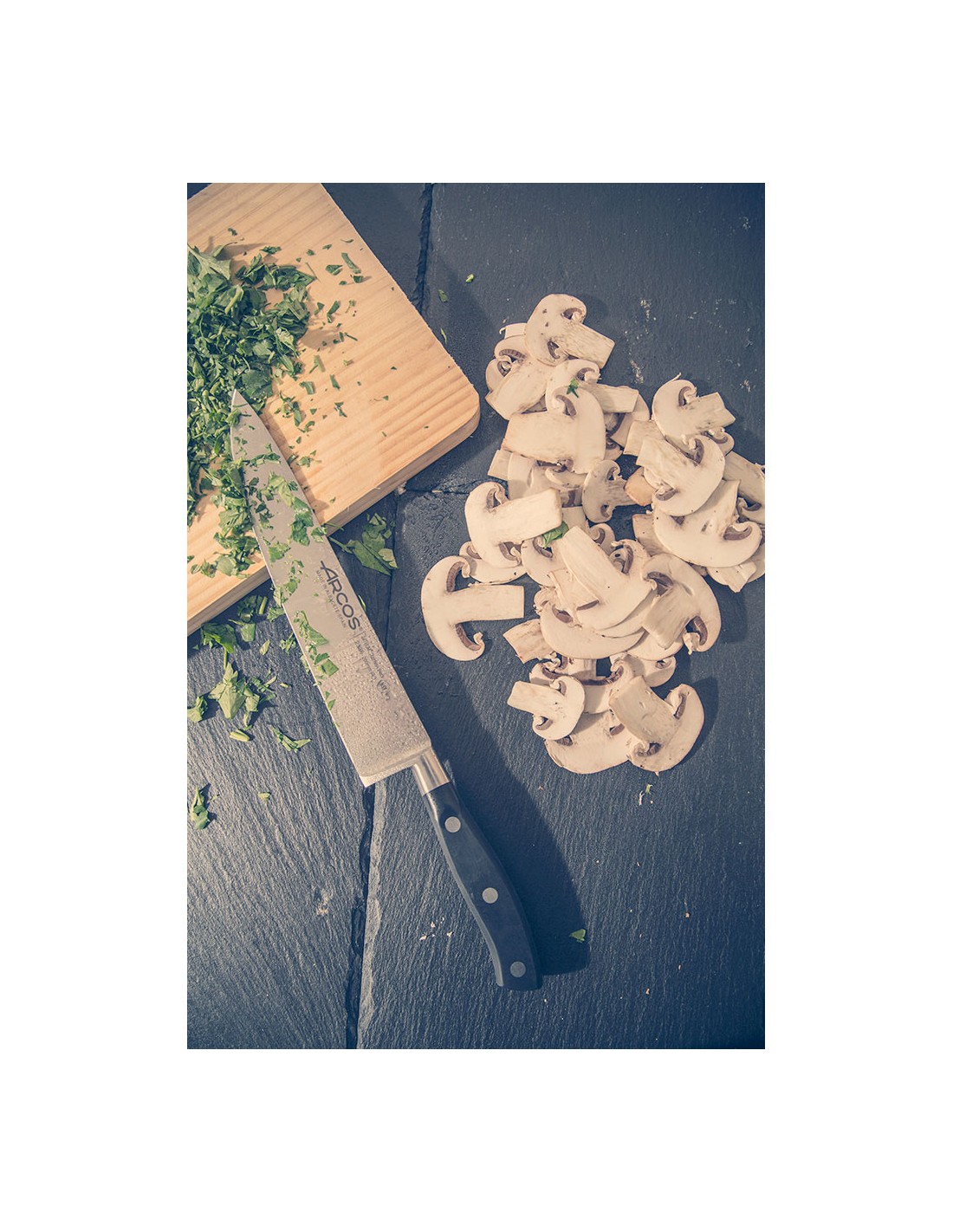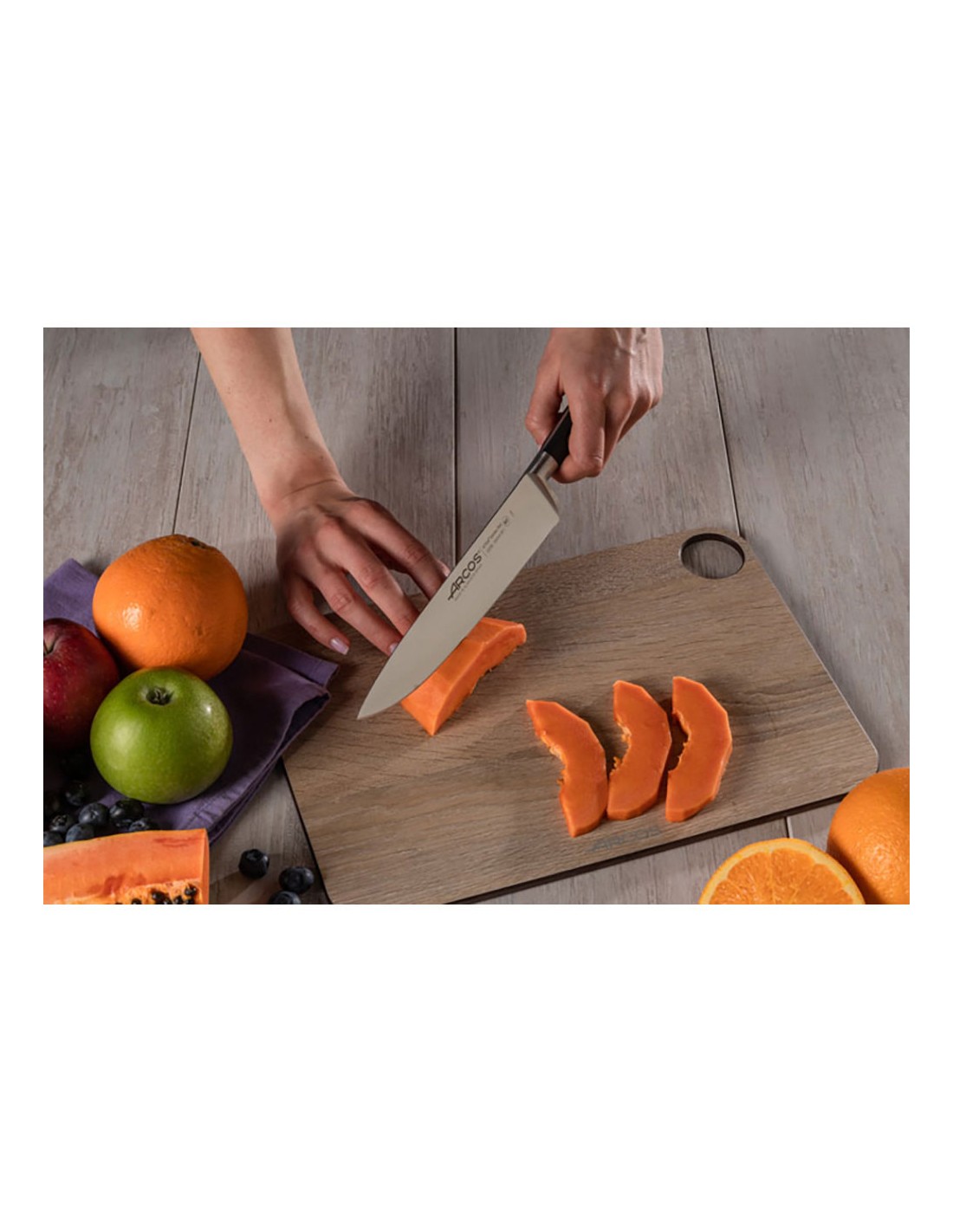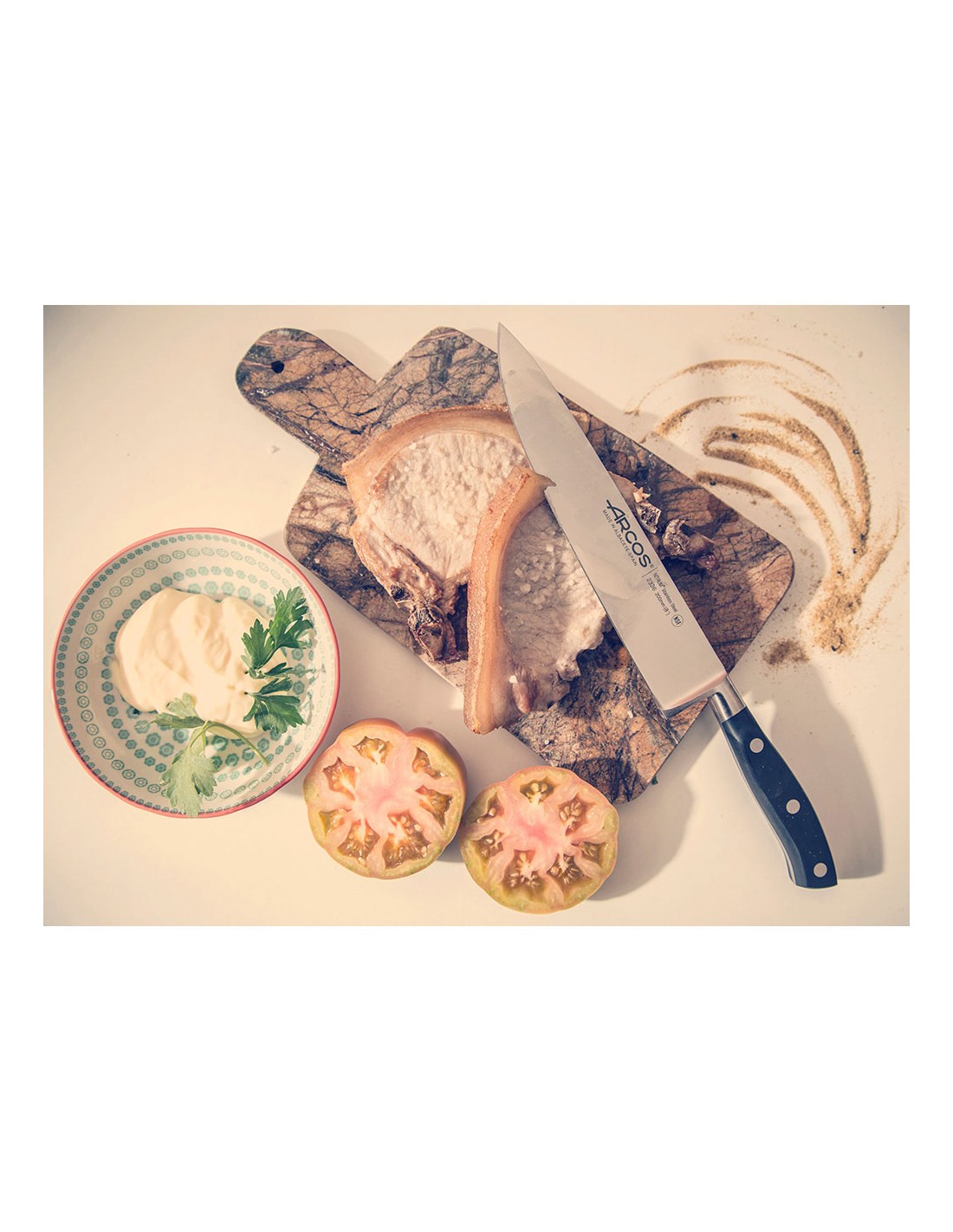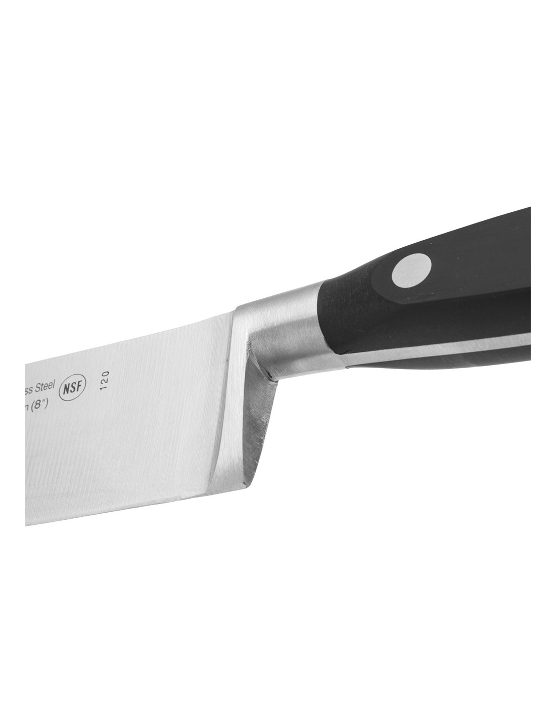 Cuchillo cocinero serie riviera 200 mm. forjado en una sola pieza con acero inoxidable nitrum. mango de polioximetileno y sus remaches de acero inoxidable, que hacen que sea resistente a la corrosión. cuenta con un sistema anti-bacteriano en su mango que reduce en un 99,9 % la presencia de bacterias, hongos o moho