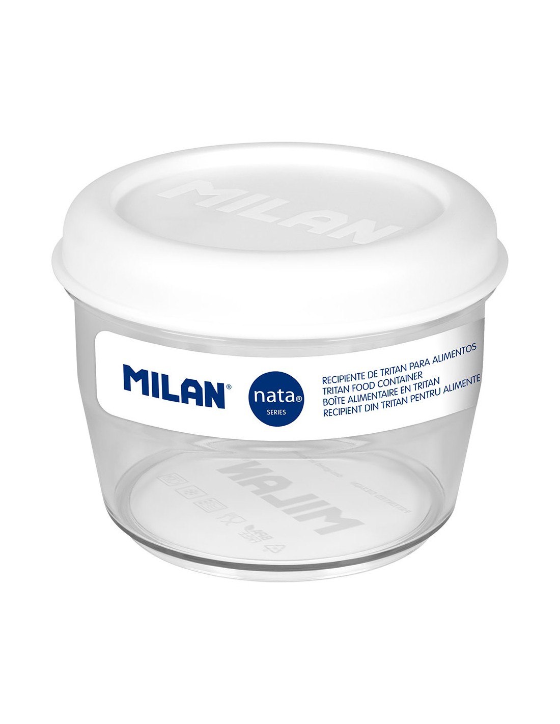 Recipiente redondo transparente de tritán para alimentos. colección milan nata® 624. alta resistencia a la rotura y a temperaturas desde los -20°c hasta los 80°c. libre de bisfenol (bpa free). no transmite olores ni sabores. reciclable. apto para calentar en microondas (máx. 80°c) con la tapa abierta para liberar el vapor. apto para congelador. apto para lavar en el lavavajillas (máx. 80°c). las tapas y los recipientes son fácilmente apilables entre sí. cierre hermético con tapa roscada de plástico de color blanco. material: plástico tritán. medidas: ø12 x 9,2 cm. capacidad: 0,5