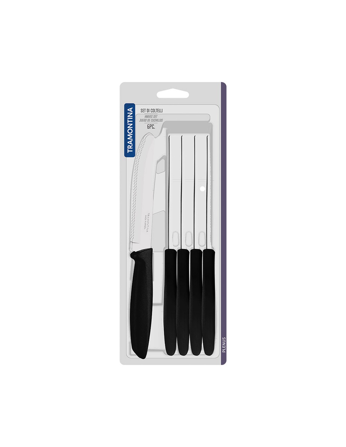 Cuchillos dentados para carne de punta redonda, plenus, hojas de acero inoxidable tratadas térmicamente y mangos de polipropileno en color negro. aptos para lavavajillas, 6 uds