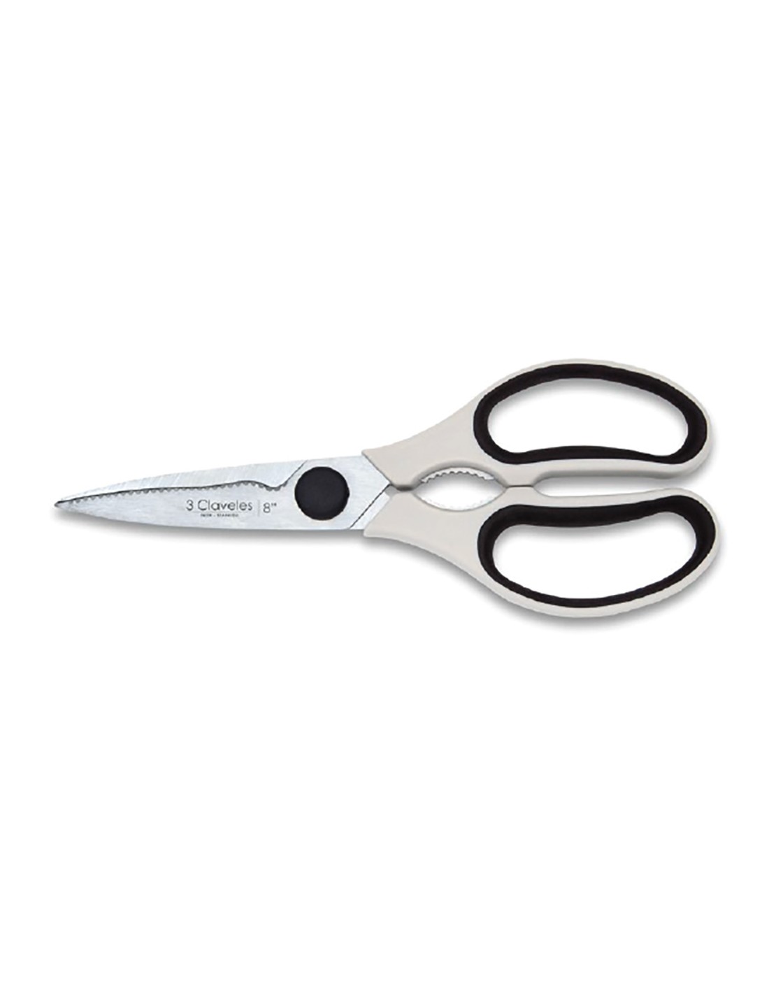 Tijera de cocina de acero inoxidable con mango de polipropileno y diseño ergonómico. hojas fuertes y micro dentadas diseñadas para fijar los alimentos al ser cortados. función cascanueces y decapsulador. desmontable para facilitar la limpieza. dimensiones: 20 cm