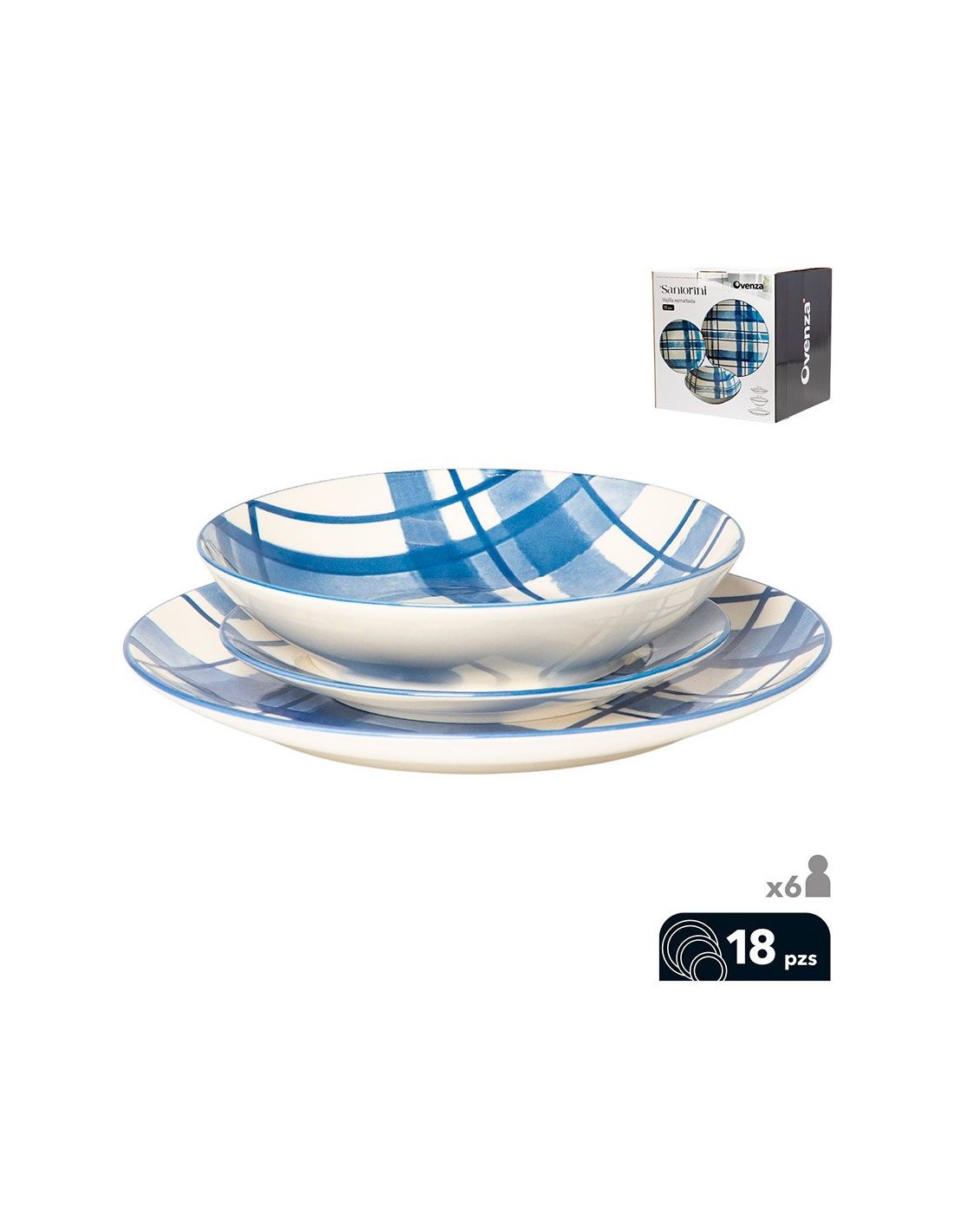 Vajilla esmaltada de 18 piezas, contiene: 6 x plato llano ø26 cm, 6 x plato hondo ø21 cm, 6 x plato postre ø19 cm modelo santorini, color azul apta para microondas y lavavajillas, no apta para horno