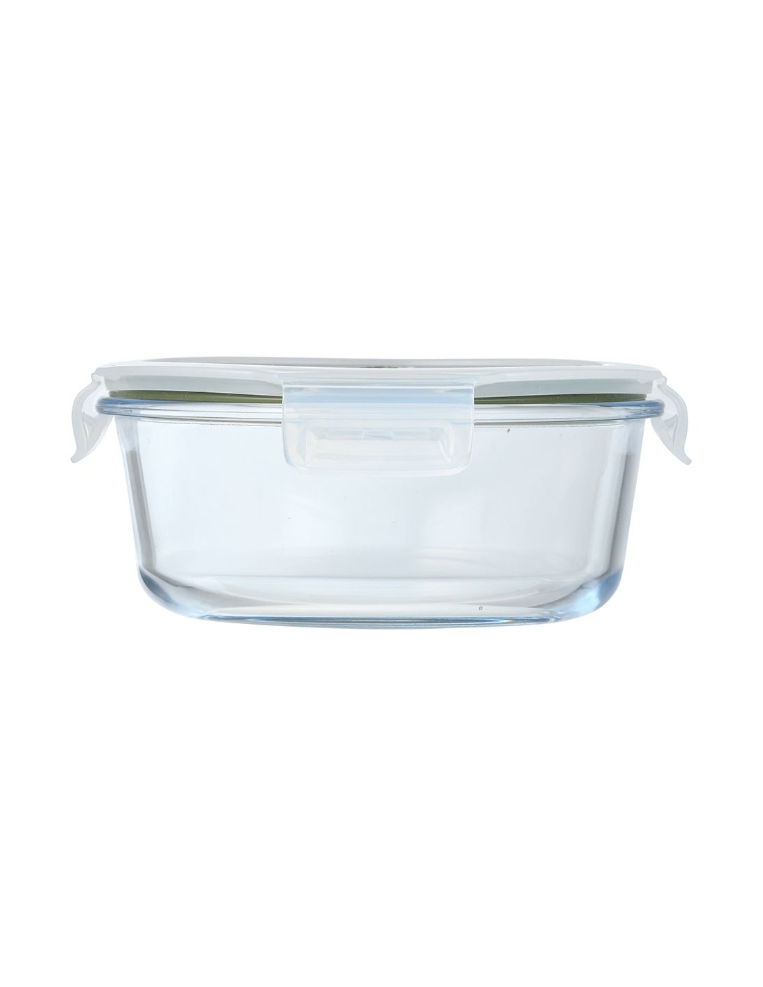 Fiambrera hermética de vidrio de borosilicato redonda, serie experto, tapa de pp transparente y silicona de color verde oliva, con 4 cierres y válvula de descompresión, apilable, apta para congelador, frigorífico y lavavajillas, apta sin la tapa para microondas y horno, 950 ml, ø18,4 x 7,6 cm