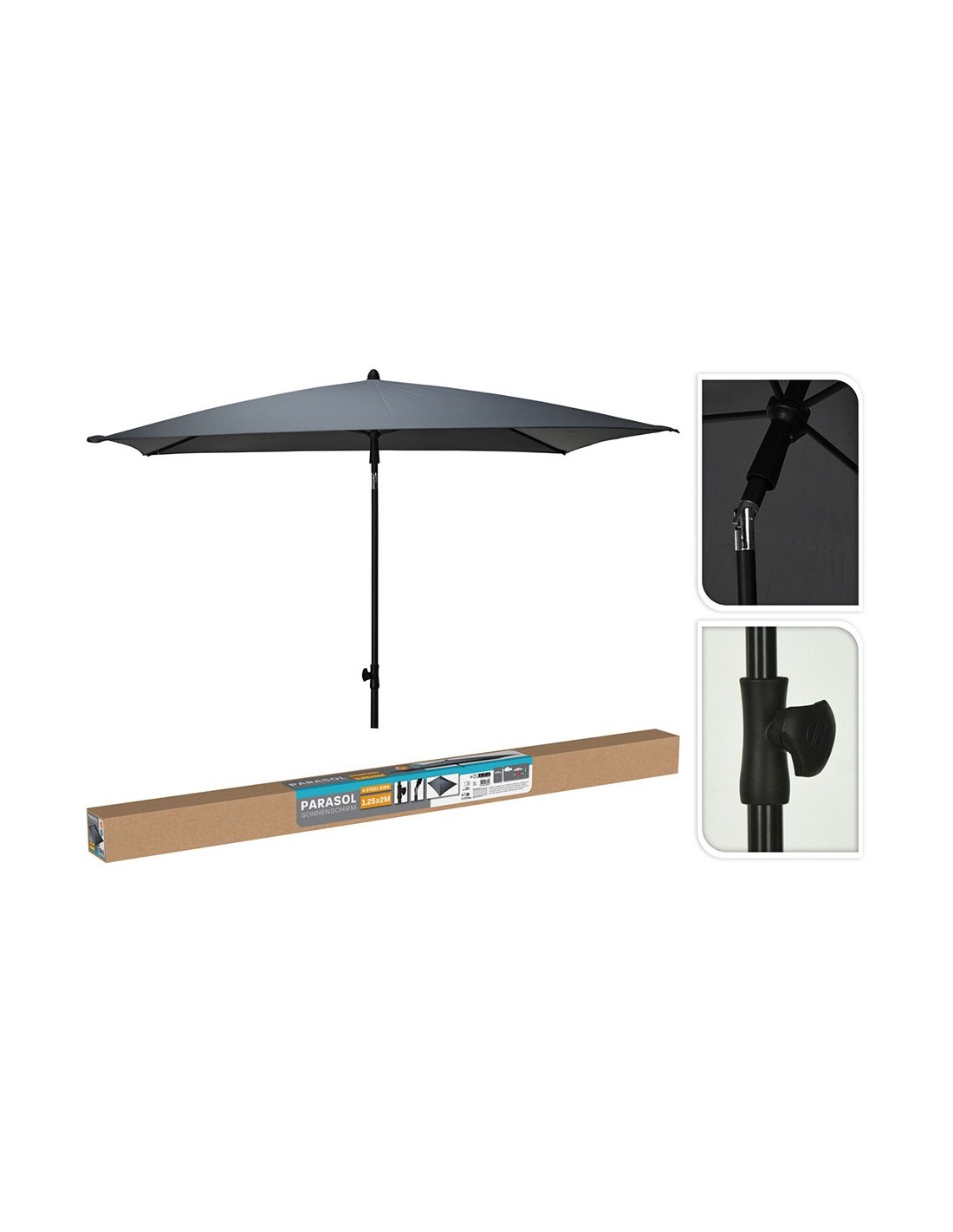 Parasol rectangular 125 x 200 cm color gris inclinable y plegable tejido de poliéster 160 g/m² con protección uv 30+ mástil de acero negro de ø28 - 32 mm, altura regulable hasta 240 cm