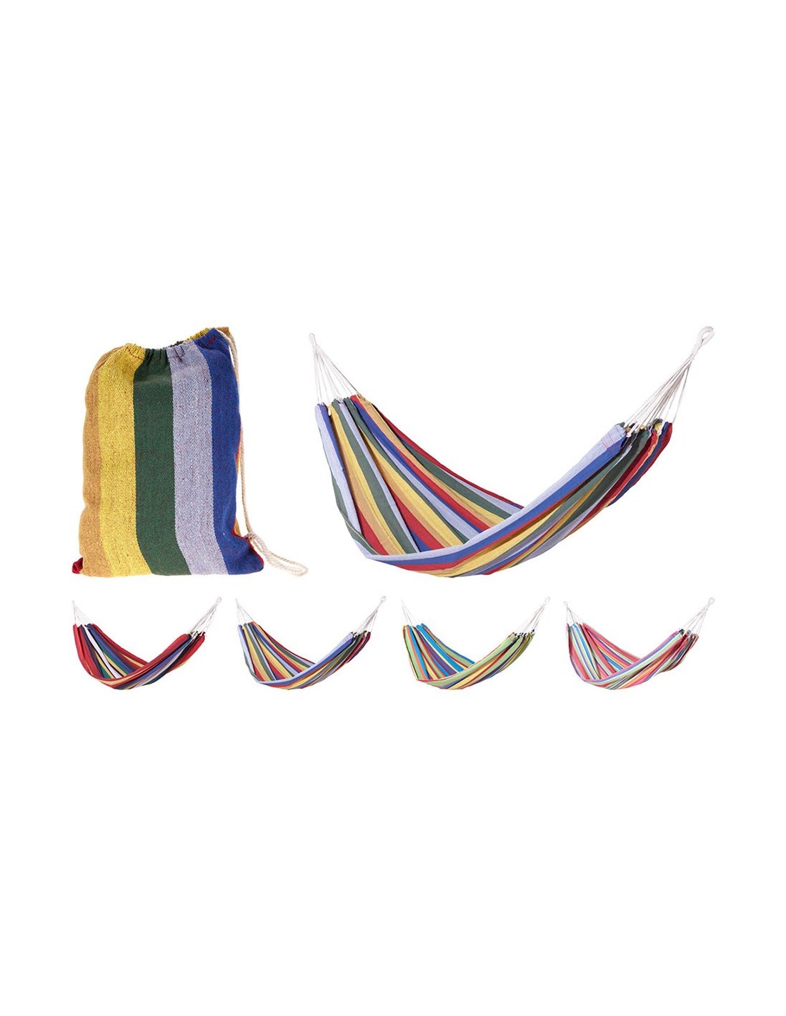 Hamaca de polialgodón, fabricada en 60 % algodón y 40 % poliéster, cuerdas en color crudo, largo total 280 cm, peso máximo soportado 110 kg, incluye bolsa de transporte de la misma tela y hoja de instrucciones, colores surtidos - dimensiones: 200 x 100 cm