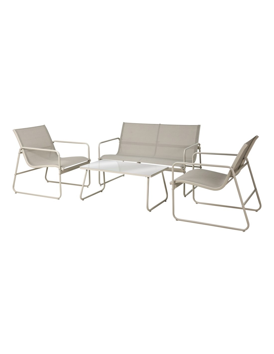 Conjunto de jardín compuesto por mesa con tablero de vidrio 85 x 45 x 38 cm con carga máxima de 20 kg, 2 sillas 75,5 x 59 x 75 cm con carga máxima de 120 kg y banco 75,5 x 115,5 x 75 cm con carga máxima de 220 kg. respaldo y asientos de tela de poliéster con revestimiento de pvc color gris claro y estructura de hierro color blanco, 4 piezas