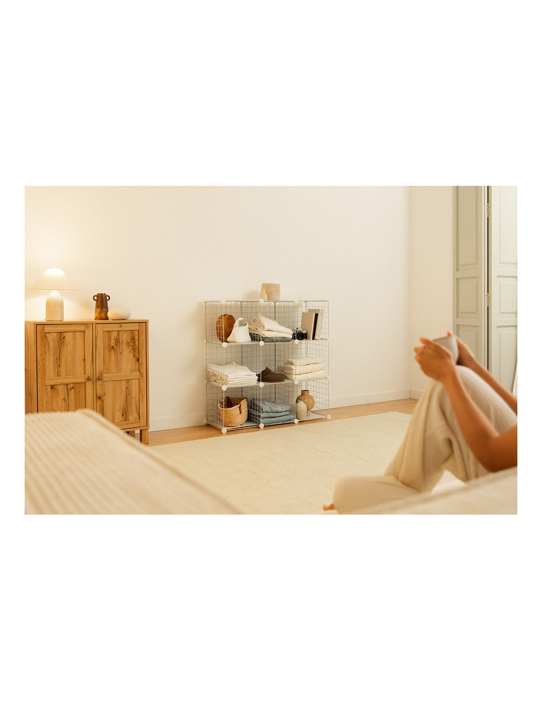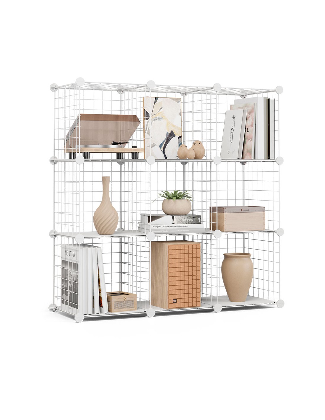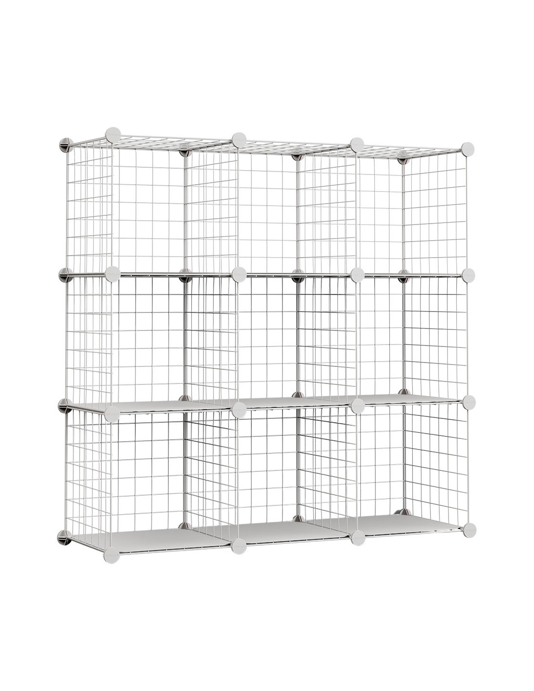 Estantería modular multifuncional de rejilla metálica con 9 módulos. carga máxima de 90 kg. dimensión de cada cubo: 30 x 30 x 30 cm. dimensión de los 9 módulos 2 x 3: 94,5 x 94,5 x 31,5 cm. libre diseño de la composición en vertical, horizontal o en escalera. fácil montaje sin herramienta. incluye martillo de punta blanda