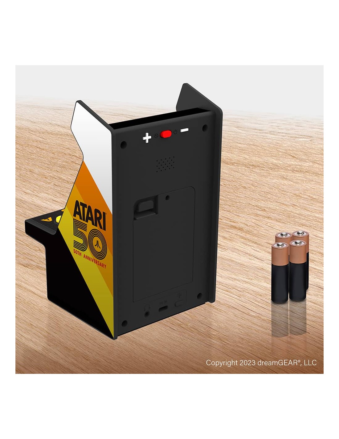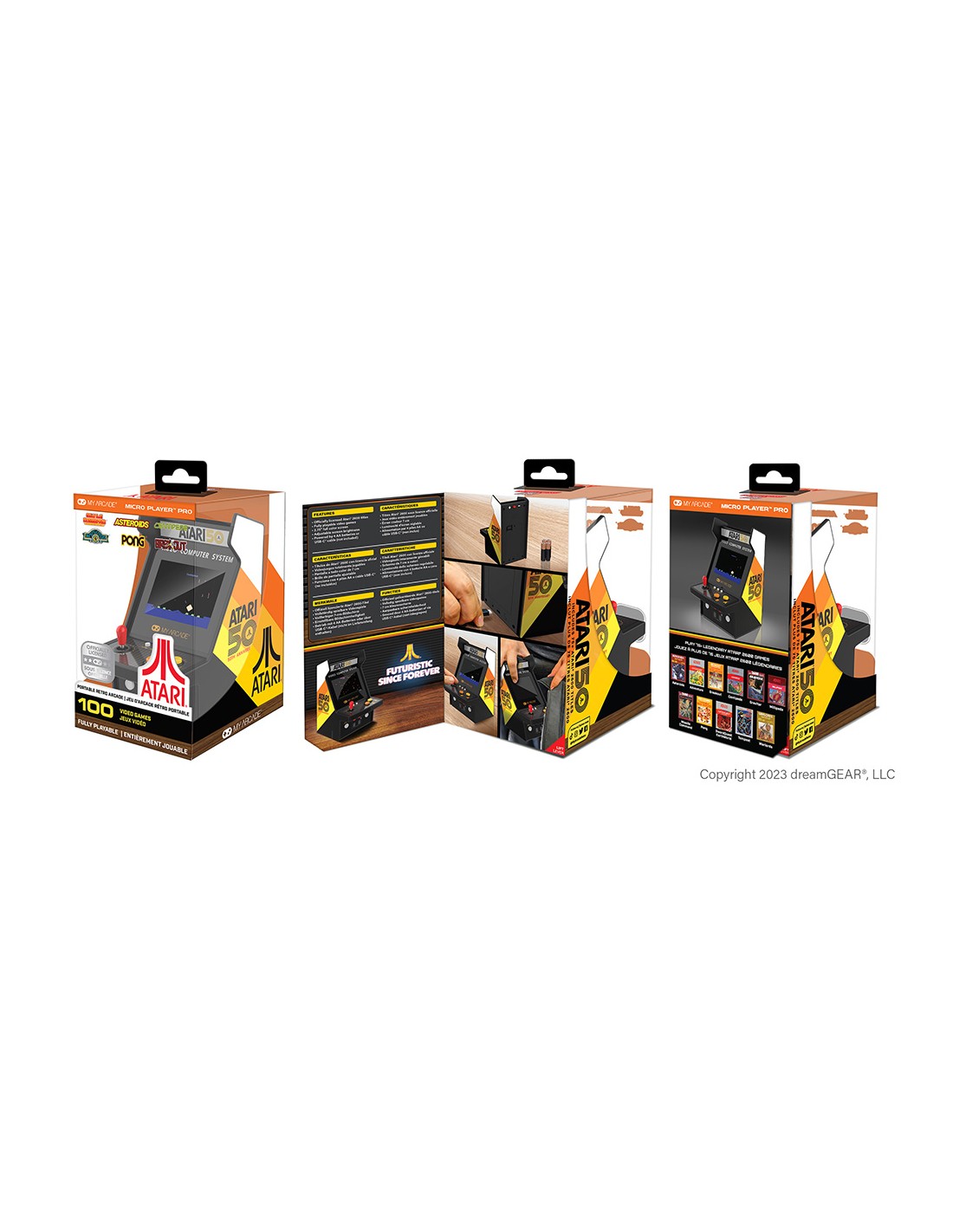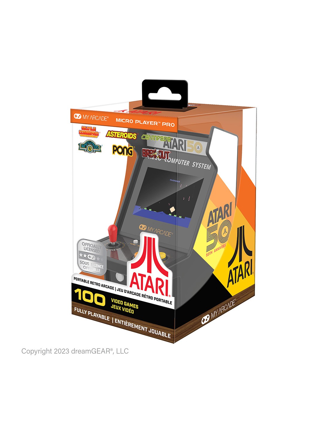 Micro player pro 6,75 inch atari portable retro arcade (100 juegos en 1) título con licencia oficial. pantalla 2,75" de alta resolución a todo color. presenta ilustraciones inspiradas en el gabinete arcade original. contiene 100 juegos, entre ellos: asteroids®, centipede®, millipede®, breakout®, missile command®, tempest® y muchos más. altavoz incorporado con control de volumen. puerto de auriculares de 3,5 mm. brillo de pantalla ajustable. alimentado por 4 pilas aa (no incluidas) o un cable usb-c (no incluido). ideal para cualquier sala de juegos, oficina o vitrina. incluye guía de usuario