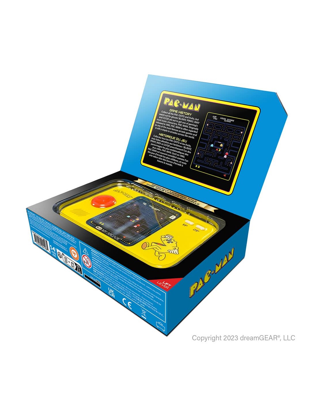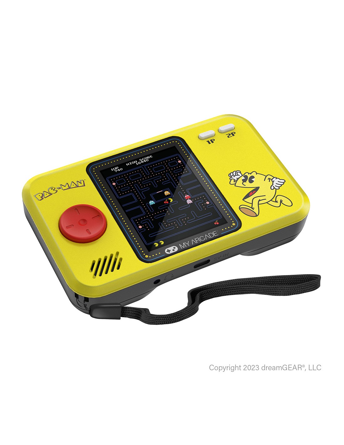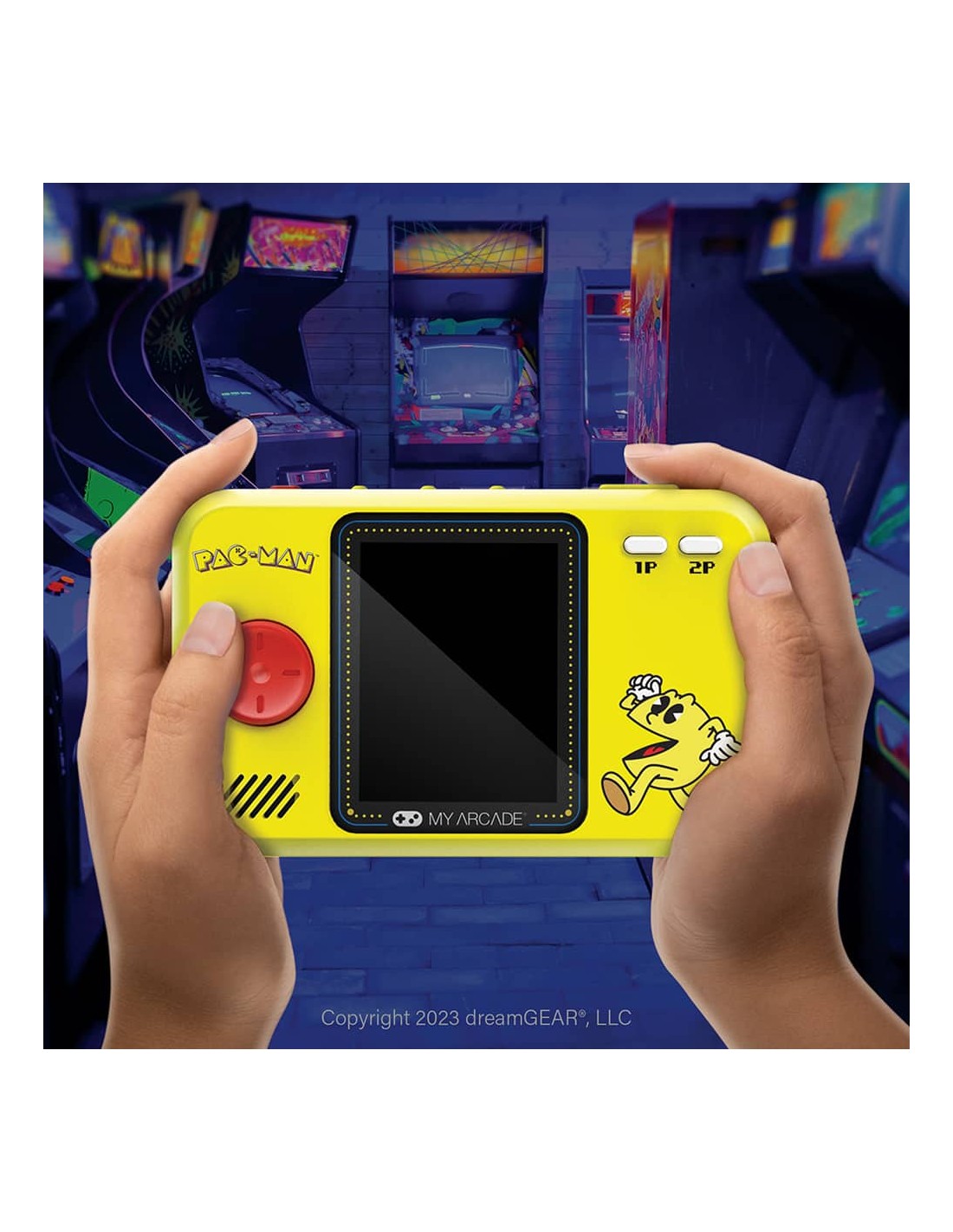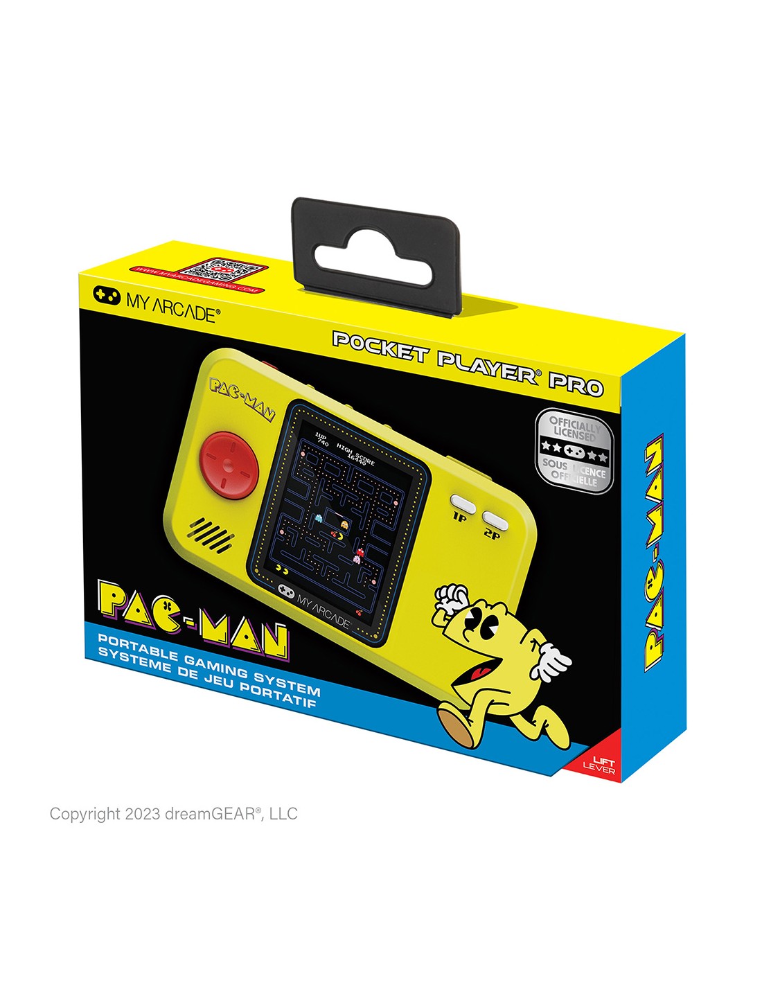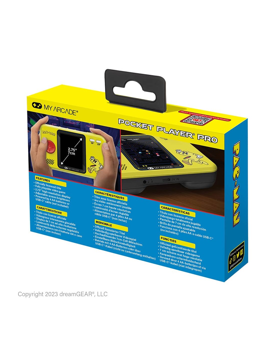 Pocket player pro pac-man portable gaming system título con licencia oficial pantalla 2,75" de alta resolución a todo color. altavoz incorporado con control de volumen. puerto de auriculares de 3,5 mm. brillo de pantalla ajustable. alimentado por 4 pilas aa (no incluidas) o un cable usb-c (no incluido). diseño ergonómico. incluye guía de usuario y lanyard