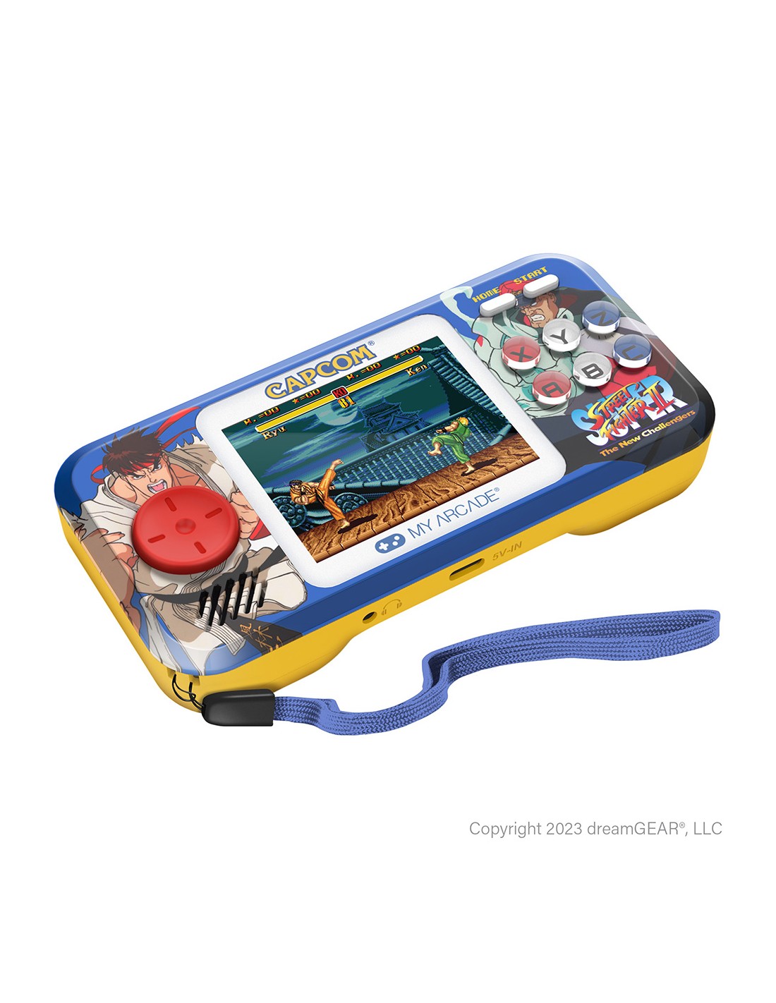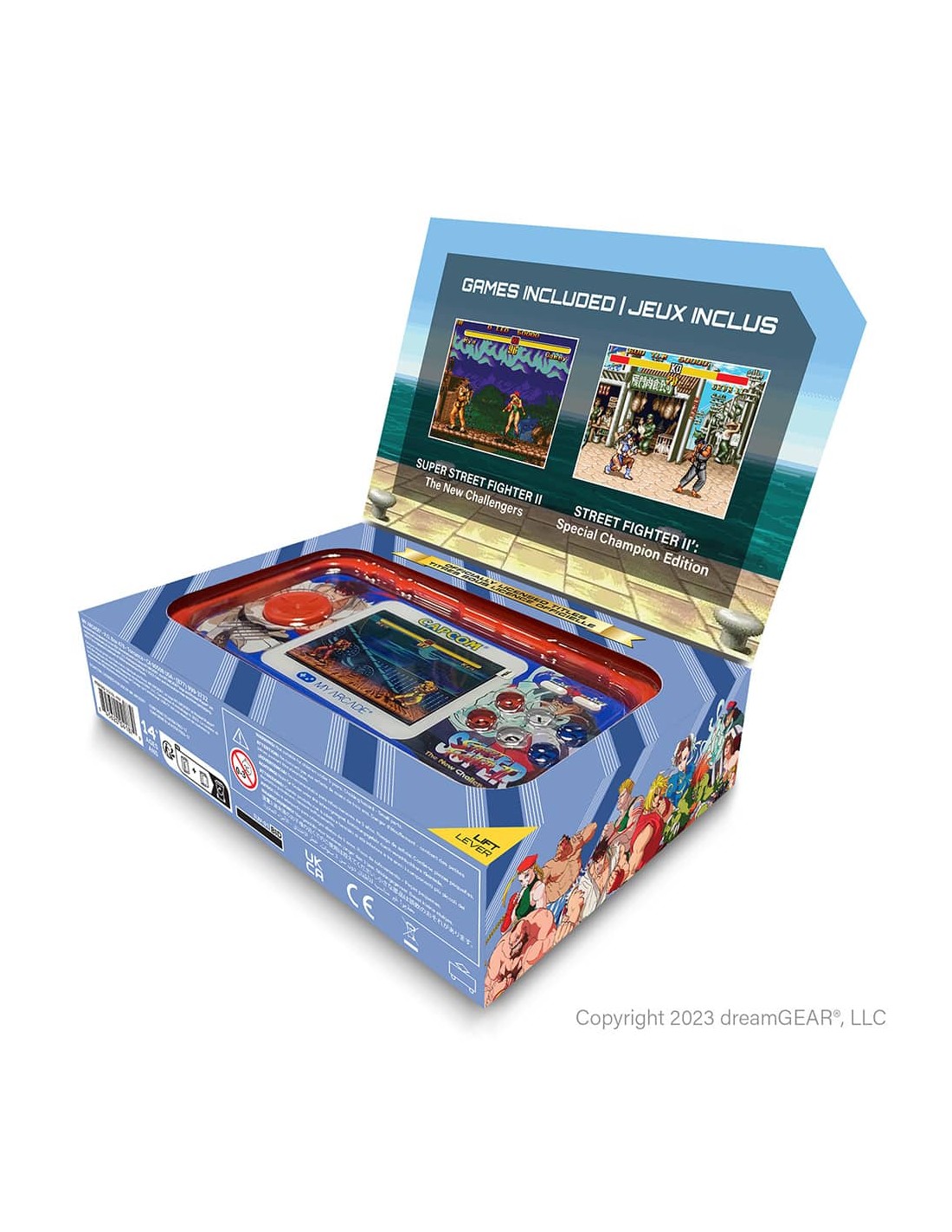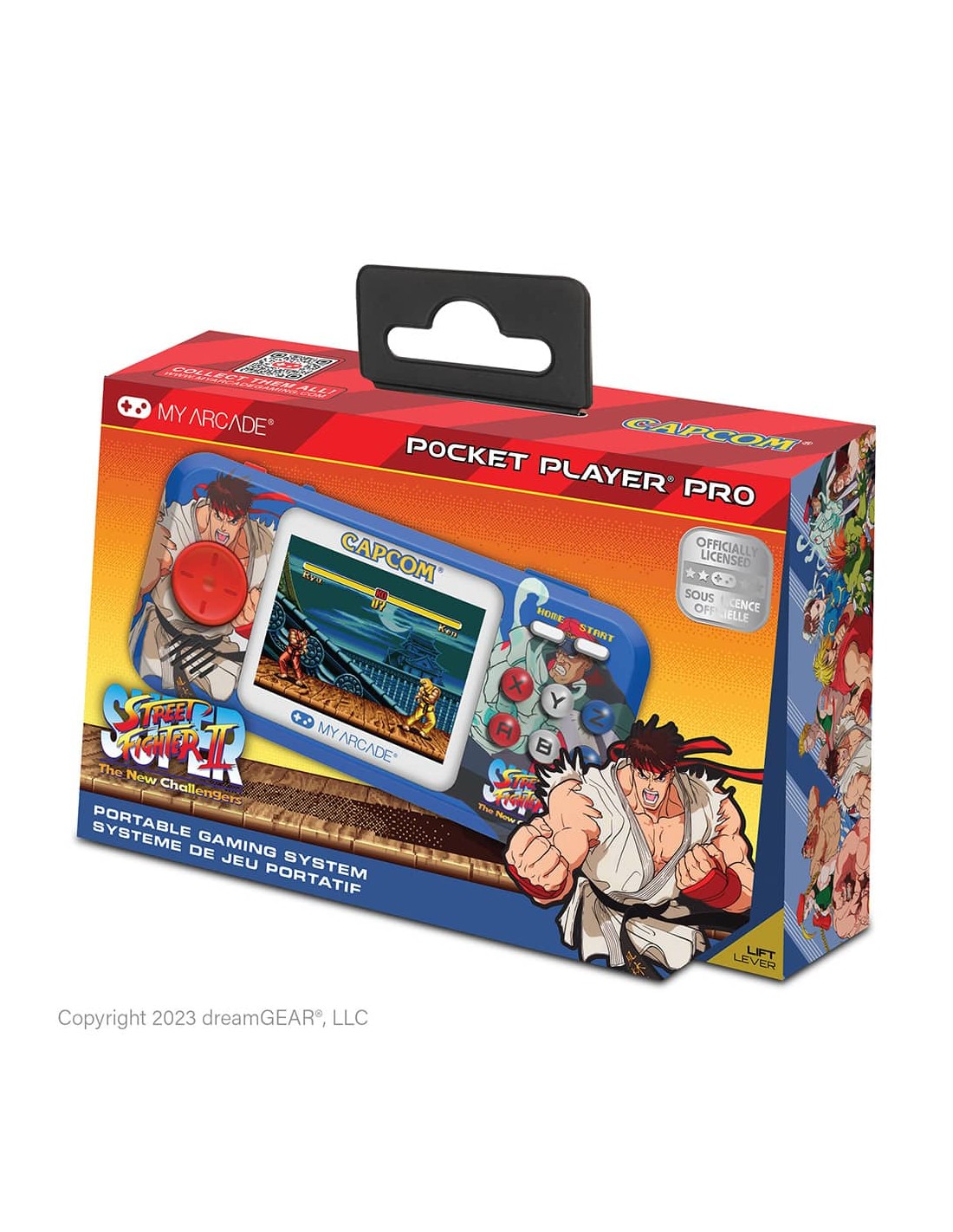 Pocket player pro super street fighter ii portable gaming system (2 juegos en 1) título con licencia oficial pantalla 2,75" de alta resolución a todo color. contiene: super street fighter ii: the new challengers y street fighter ii: special champion edition. altavoz incorporado con control de volumen. puerto de auriculares de 3,5 mm. brillo de pantalla ajustable. alimentado por 4 pilas aa (no incluidas) o un cable usb-c (no incluido). diseño ergonómico. incluye guía de usuario y lanyard