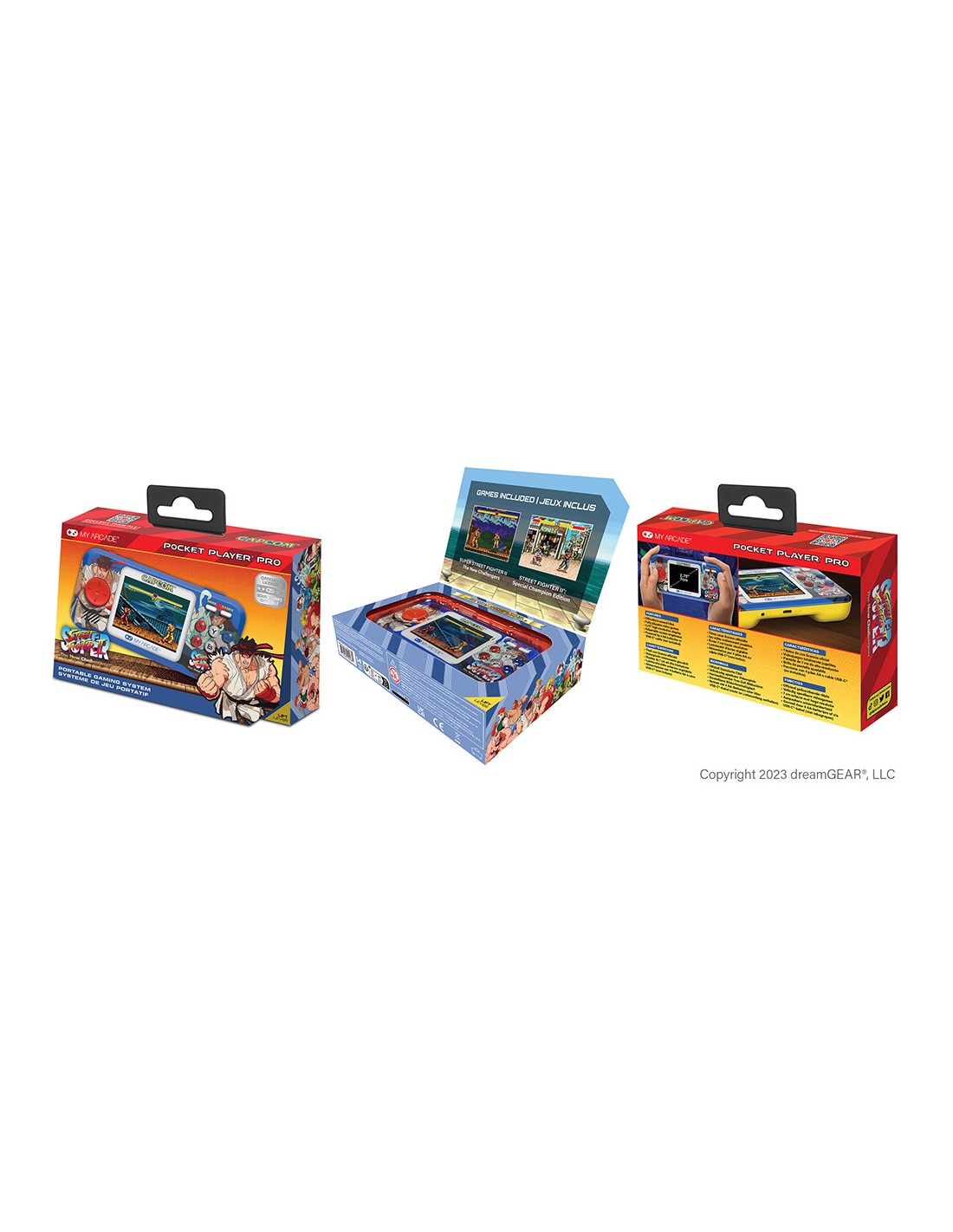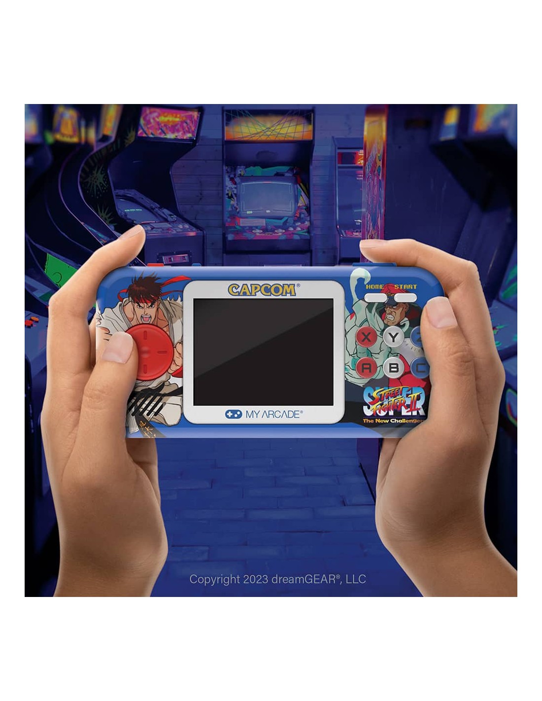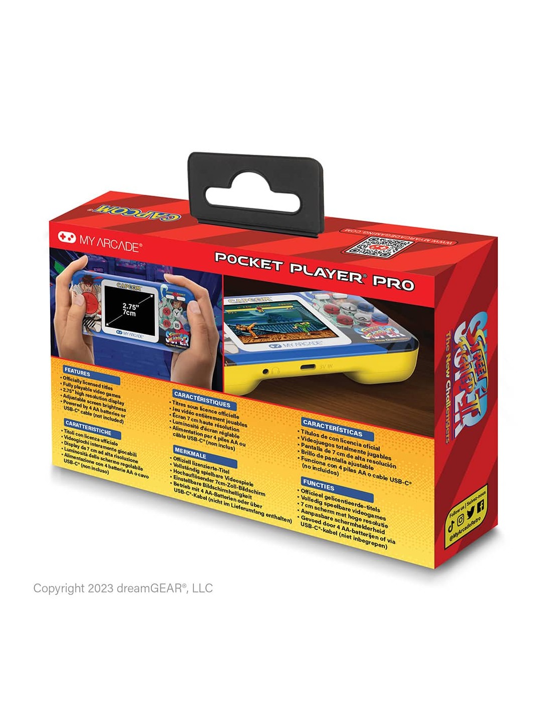 Pocket player pro super street fighter ii portable gaming system (2 juegos en 1) título con licencia oficial pantalla 2,75" de alta resolución a todo color. contiene: super street fighter ii: the new challengers y street fighter ii: special champion edition. altavoz incorporado con control de volumen. puerto de auriculares de 3,5 mm. brillo de pantalla ajustable. alimentado por 4 pilas aa (no incluidas) o un cable usb-c (no incluido). diseño ergonómico. incluye guía de usuario y lanyard