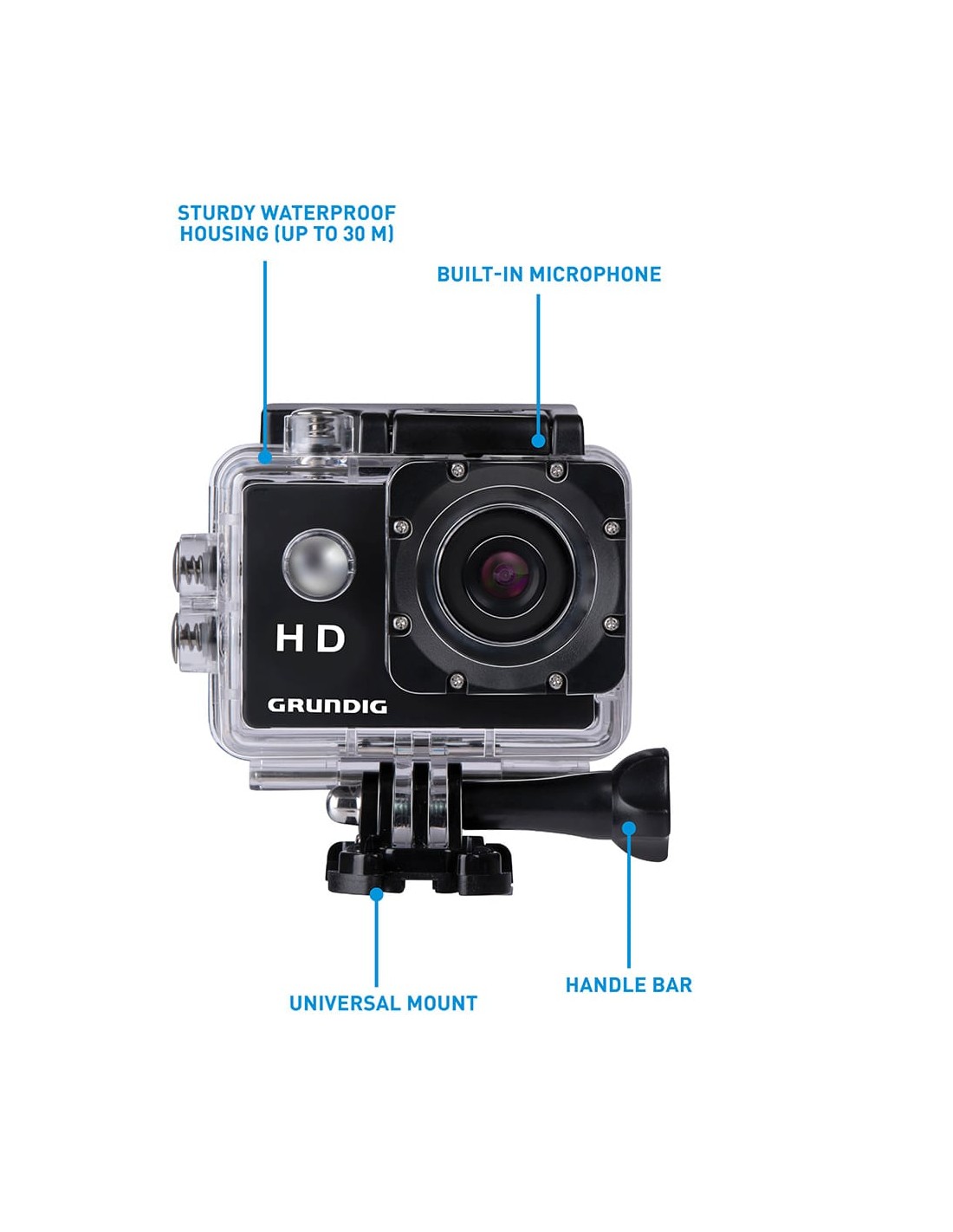 Cámara deportiva impermeable hasta 30 m, con ángulo de visión de 100°, permite obtener imágenes de 5 mp. incluye pantalla lcd de 2" incluye carcasa estanca, soporte para barra, accesorios de montaje, clip, banda autoadhesiva, almohadillas 3m y cable usb tipo c capacidad de bateria de hasta 90 min