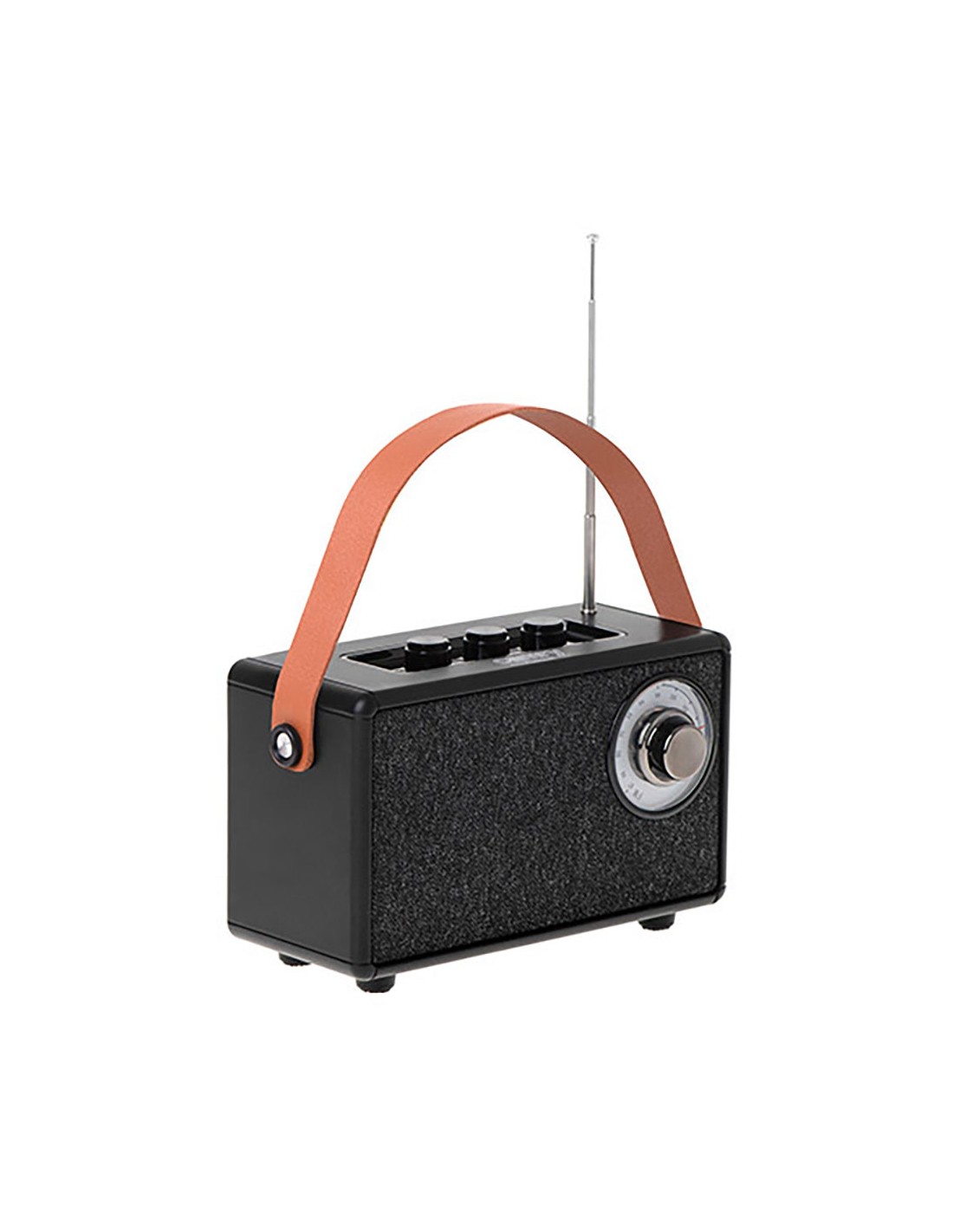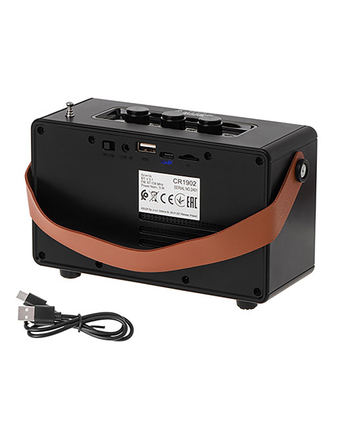 Altavoz bluetooth con radio, cr 1902, función fm fm 87-108 mhz, sintonizador analógico, función auxiliar, función tws conecte dos altavoces para que funcionen como uno solo bluetooth 5,1 reproducción sd card, usb, mp3 soporte wav, 1500 mah, carga usb-c cable incluido, carga en dos horas 5w 5 horas de reproducción (50% volumen) color negra con asa polipiel marrón 16 x 7 x 10,5 cm