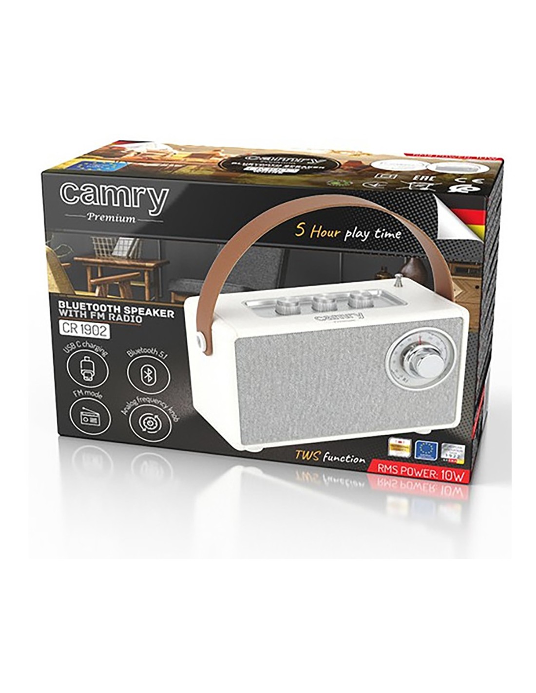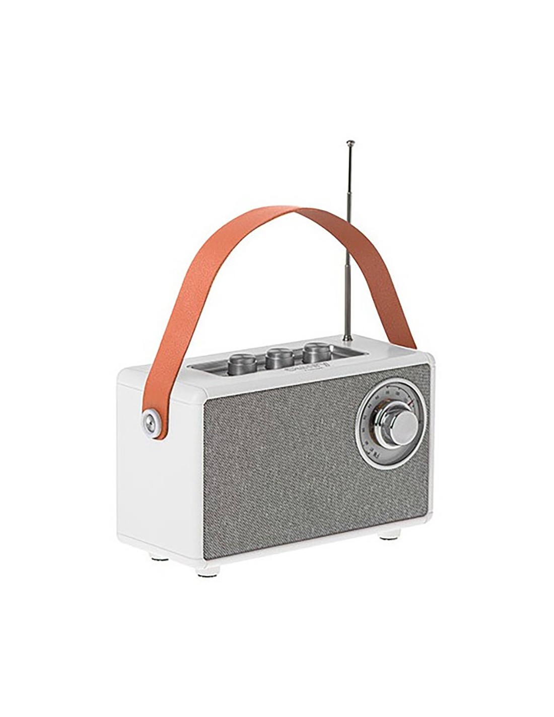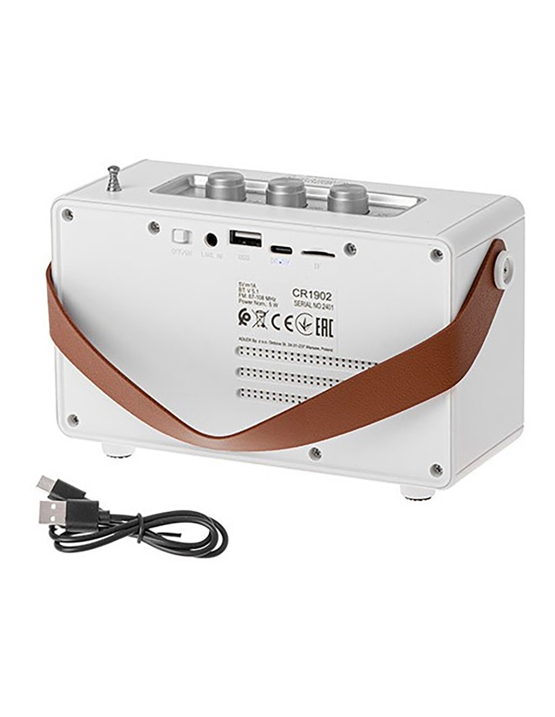 Altavoz bluetooth con radio, cr 1902, función fm fm 87-108 mhz, sintonizador analógico, función auxiliar, función tws conecte dos altavoces para que funcionen como uno solo bluetooth 5,1 reproducción sd card, usb, mp3 soporte wav, 1500 mah, carga usb-c cable incluido, carga en dos horas 5w 5 horas de reproducción (50% volumen) color blanca con asa polipiel marrón 16 x 7 x 10,5 cm