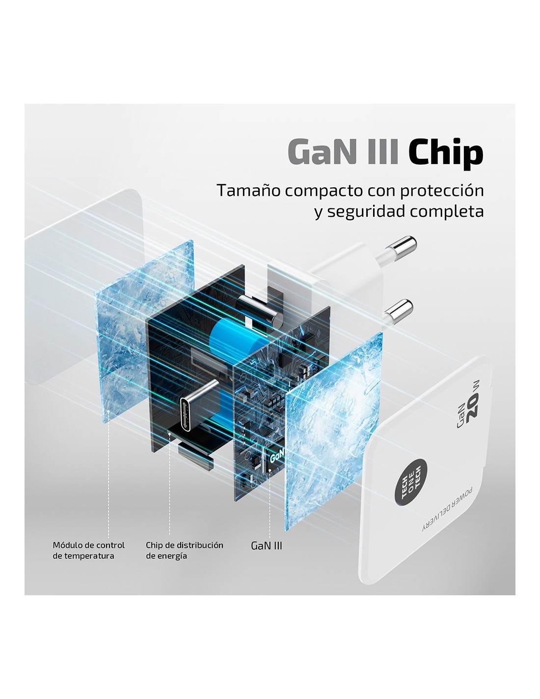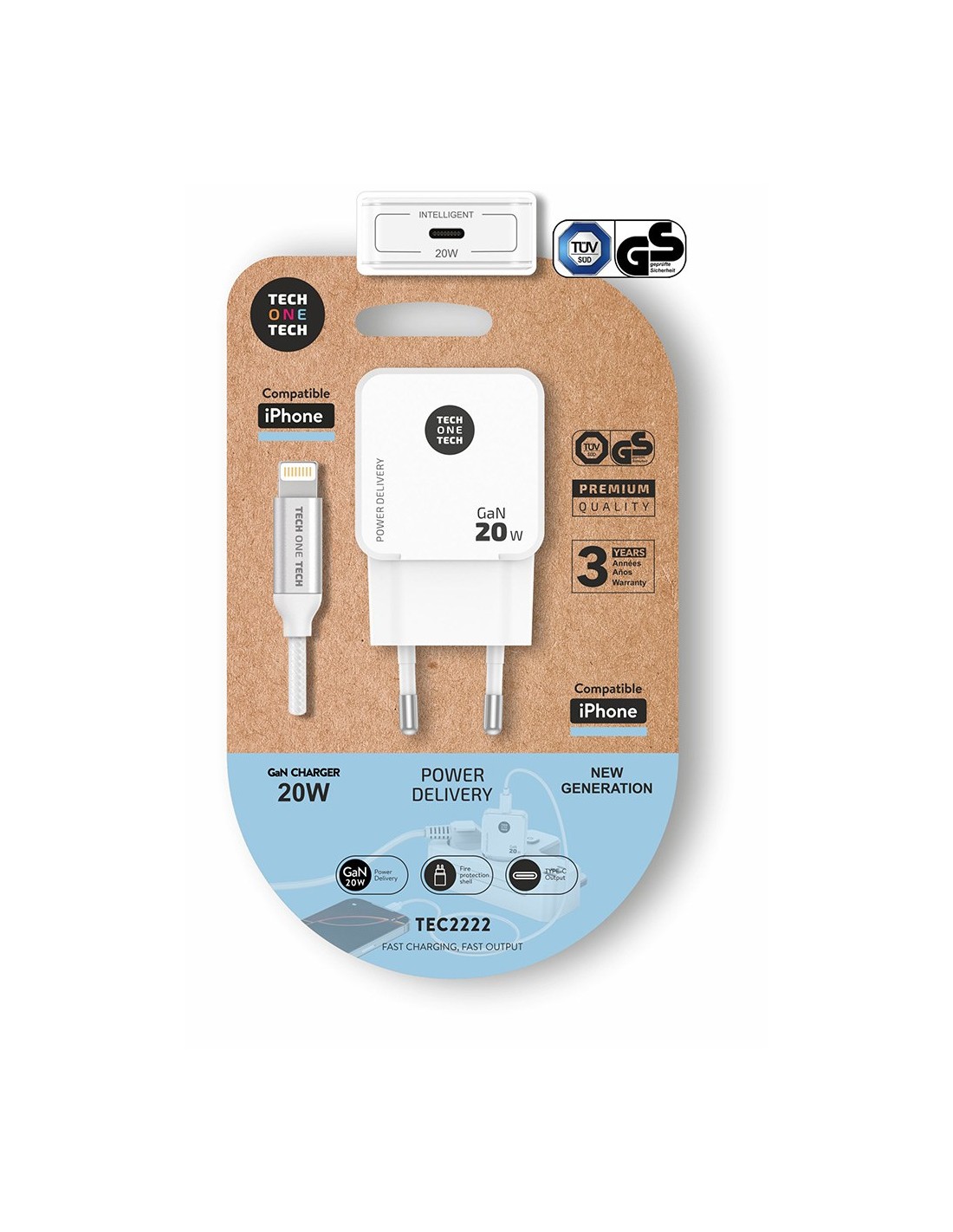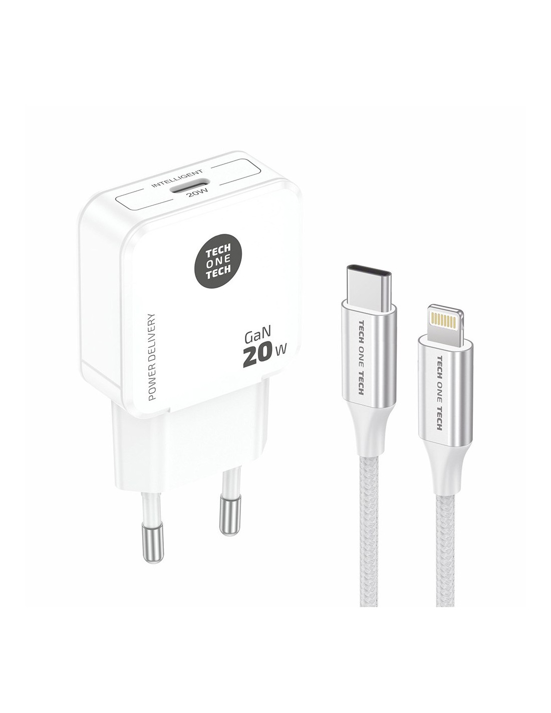 Cargador ultrarrápido gan power delivery 3.0 (pd) 20 w hasta un 400% más rápido que un cargador estándar de 5 w, apple lightning 3a, puertos de salida inteligente que se comunica con el dispositivo cargado, suministrando la potencia necesaria y requerida, smart recognition, fire retardant shell cumple con norma tüv gs, ce, fcc, raee y rohs. multiprotecciones contra sobrecarga y cortocircuito previenen efectivamente los posibles daños a tus dispositivos incluye cable usb-c de datos y carga rápida tec2203 apple 1 m de nylon recubierto, trenzado, reforzado, antitorsión y abrasión. tensión de salida: 5v-3a / 9v-2.2a / 12v-1.67a 100 - 240v ~ 50-60hz color blanco 78 x 40 x 25 mm