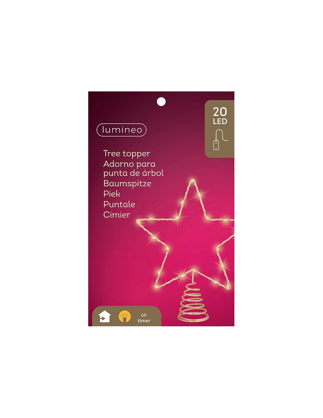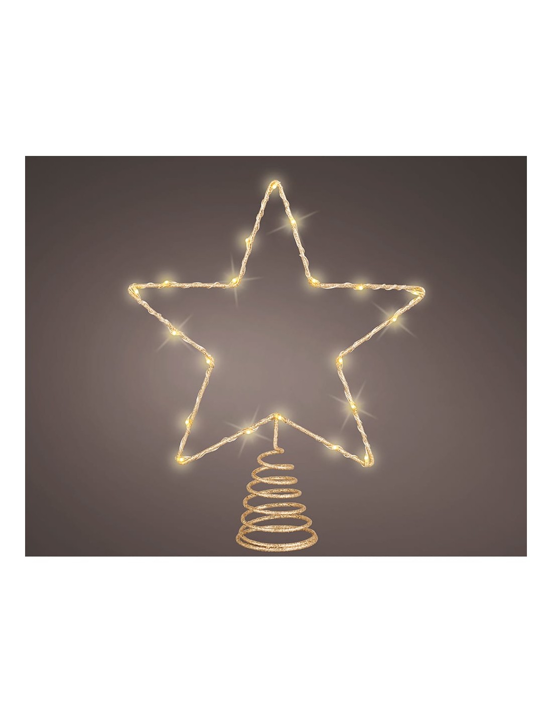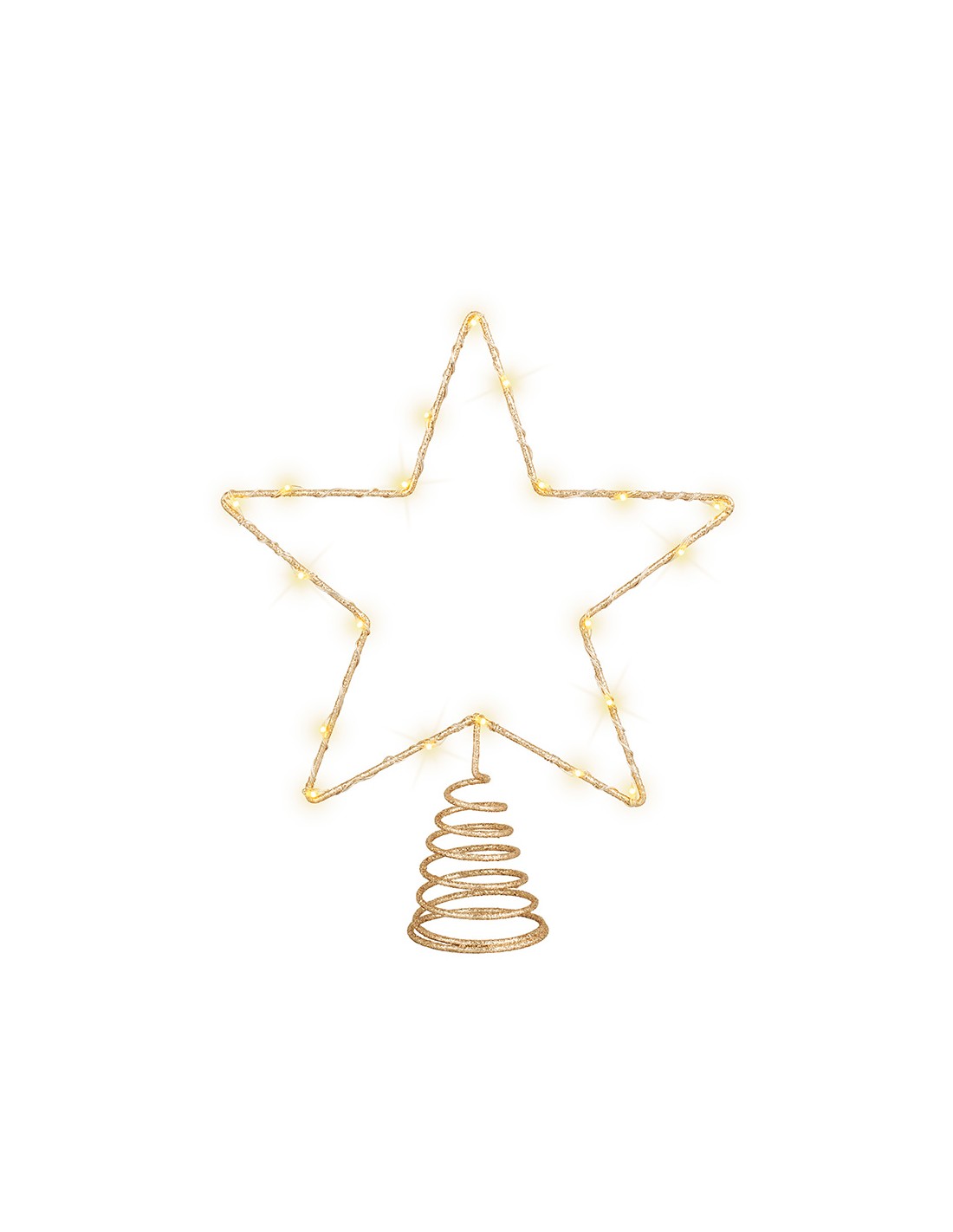 Adorno en forma de estrella para punta de árbol. color: dorado, material: metal, microled, función: fija. 20 led, color led: luz cálida. uso: interior, con temporizador: 6 h encendido/ 18 h apagado. funciona con pilas 2 x aa ( no incluidas). medidas: 23 x 6 x 25,5 cm
