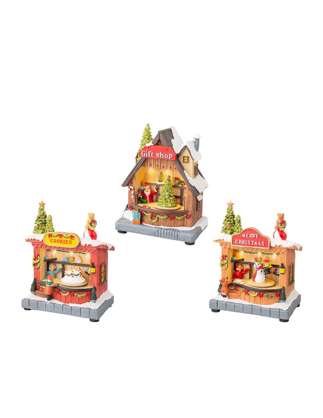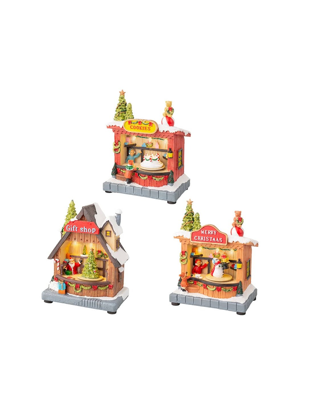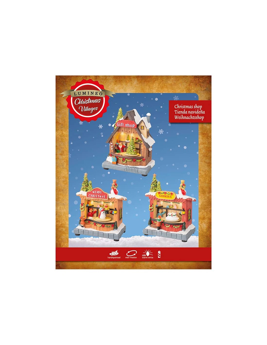 Escena navideña con movimiento (sin sonido) y luz led temática de tiendas pintada a mano color led: luz cálida. uso: interior funciona con pilas 3 x aa (no incluidas), transformador opcional modelos variados, medidas: 14,30 x 10,00 x 17,50 cm