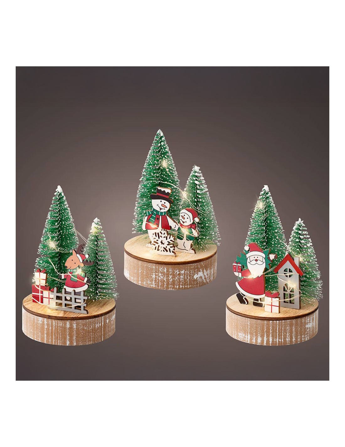 Figura de madera decorativa motivos navideños con 5 leds, luz cálida, para uso interior, con función de temporizador 6 h encendido / 18 h apagado, funciona con pilas 2 x aaa (no incluidas), modelos surtidos, medida: ø8 x 12 cm, presentado en expositor de 9 uds