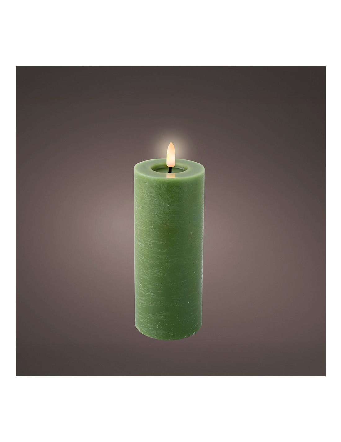 Vela de cera led, efecto llama, color verde, superficie lisa, acabado rústico medidas: ø7 x 19 cm. uso: interior. color led: luz cálida con temporizador 6 h encendida/18 h apagada autonomía: 250 h funciona con pilas 2 x aaa (no incluidas)