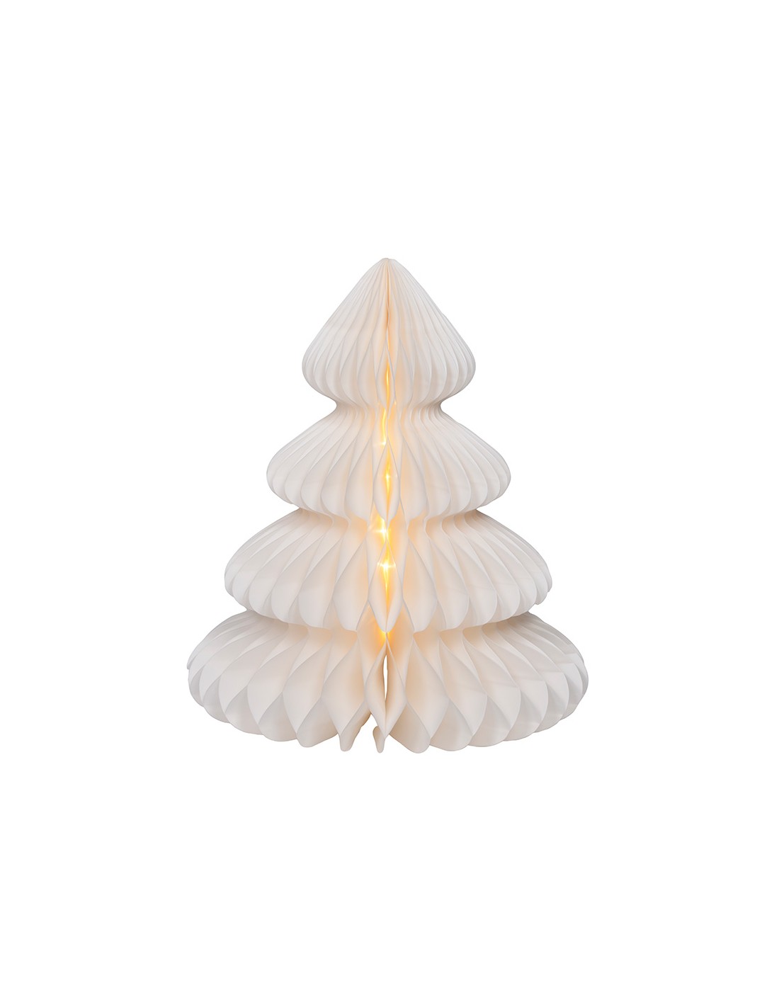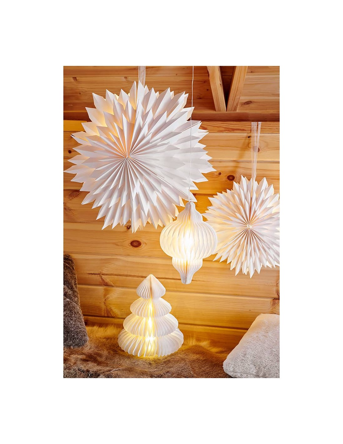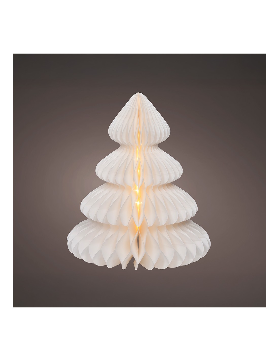 Árbol blanco de papel, 40 leds luz cálida fija, material: papel fsc mix 100%, para interior, funciona con pilas 3 x aa (no incluidas), con temporizador 6 h encendida/18 h apagada, medidas: ø42 x 48 cm