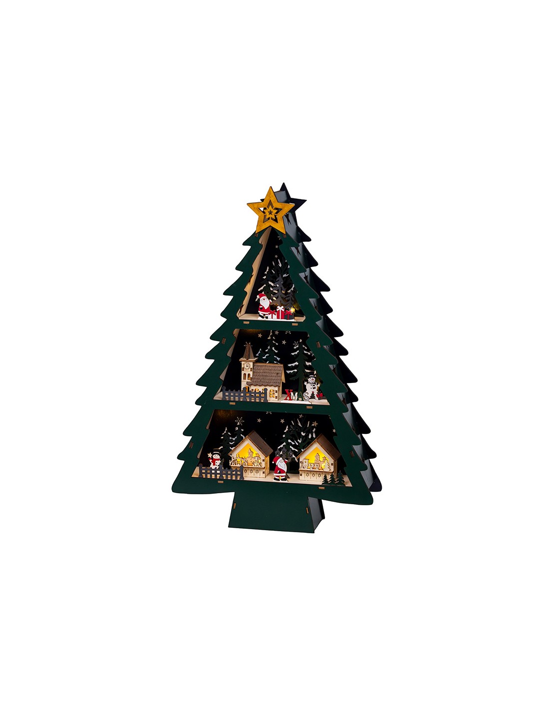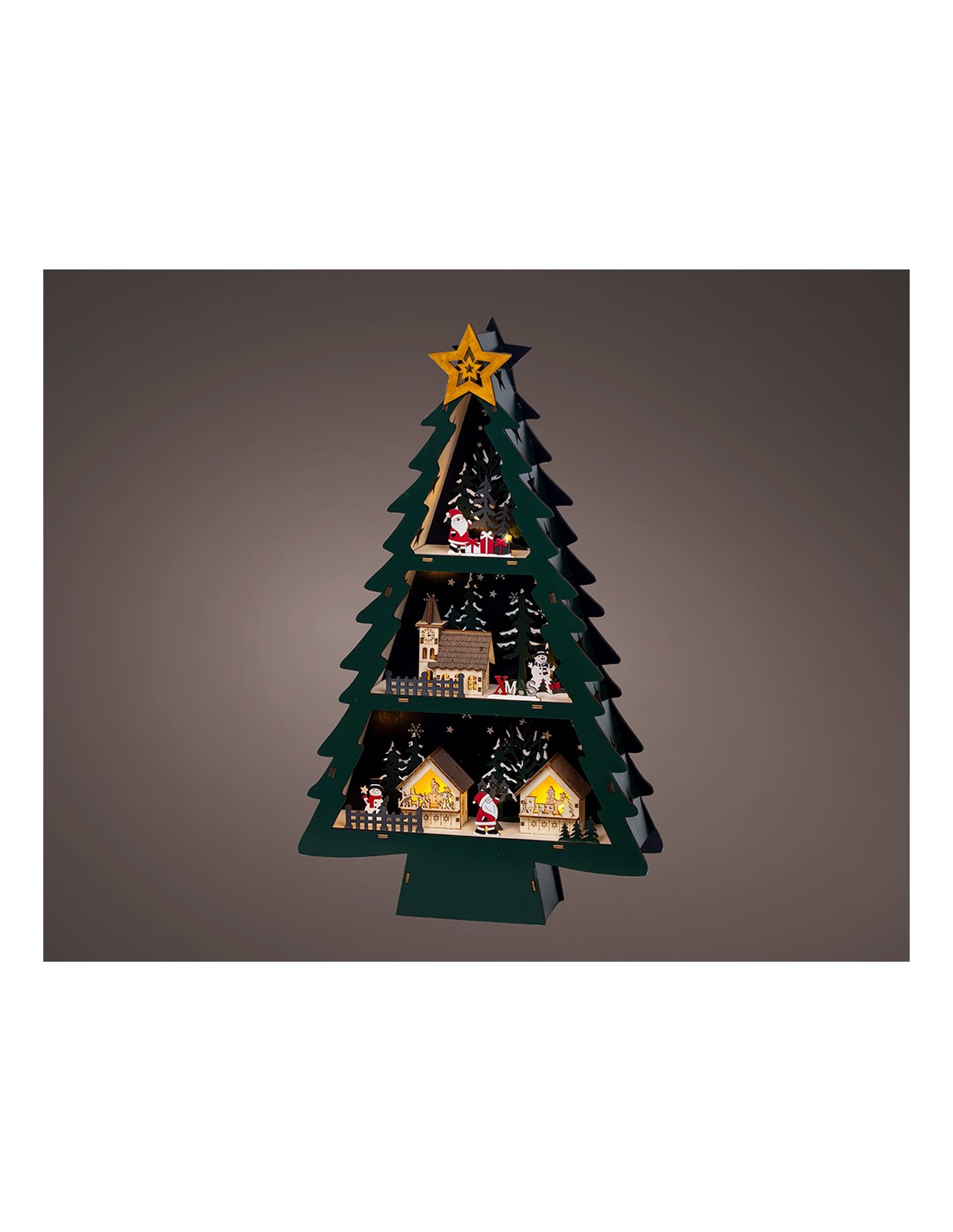 Escena navideña en árbol con 10 leds. material: madera contrachapada. función: fija. uso:interior. color led: luz cálida. con temporizador 6 h encendido 18 h apagado, funciona con pilas 2 x aa (no incluidas), medidas: 33 x 9 x 55 cm