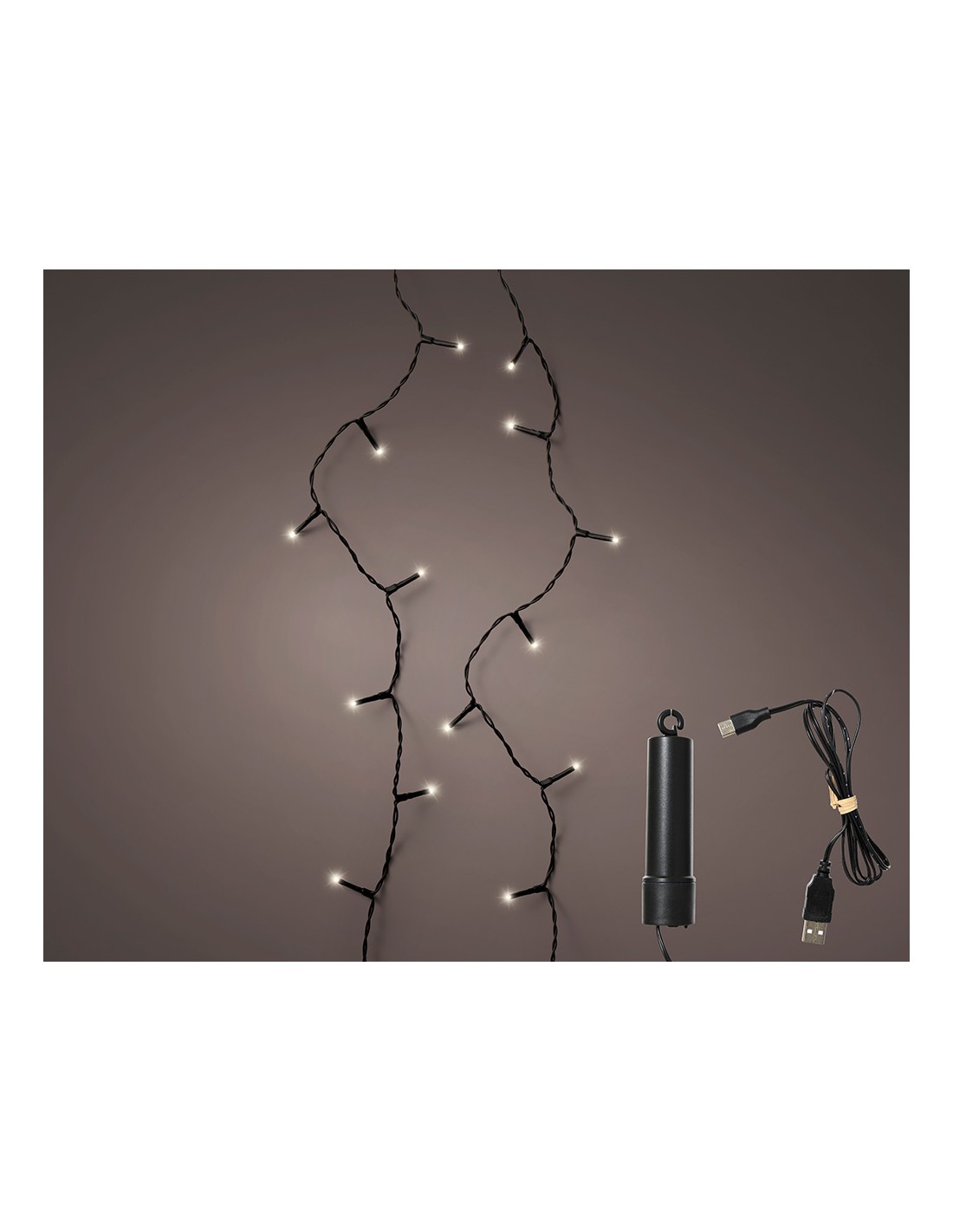 Guirnalda recargable 100 leds, luz cálida, exterior ip44, cable negro, 8 funciones de efecto intermitente, incluyendo modo fijo. funciona con batería 7 v 1500 mah. duración estimada de batería 10 días cable alimentación 30 cm distancia entre la primera bombilla y la última: 7,4 m, distancia entre bombillas 7,5 cm, largo total 7,7 m, temporizador: 8 h encendido / 16 h apagado