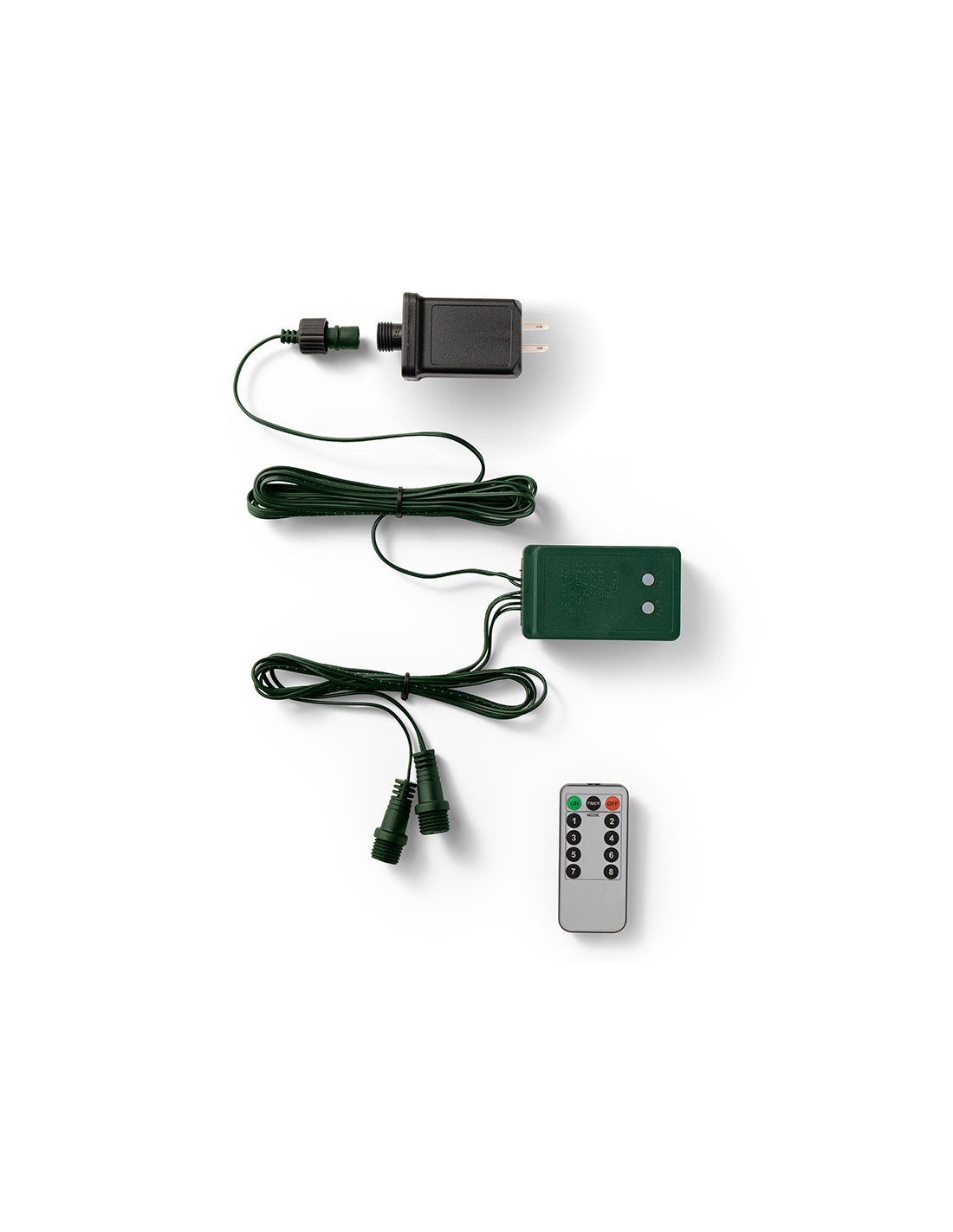Transformador y controlador para leds connect verde con control remoto para exterior de 5 m. cable verde, 220 - 240 v 50/60 hz, con 8 funciones de efecto intermitente, función estática incluida, transformador de 24 w para conectar hasta 6000 leds, temporizador: 8 h encendido / 16 h apagado