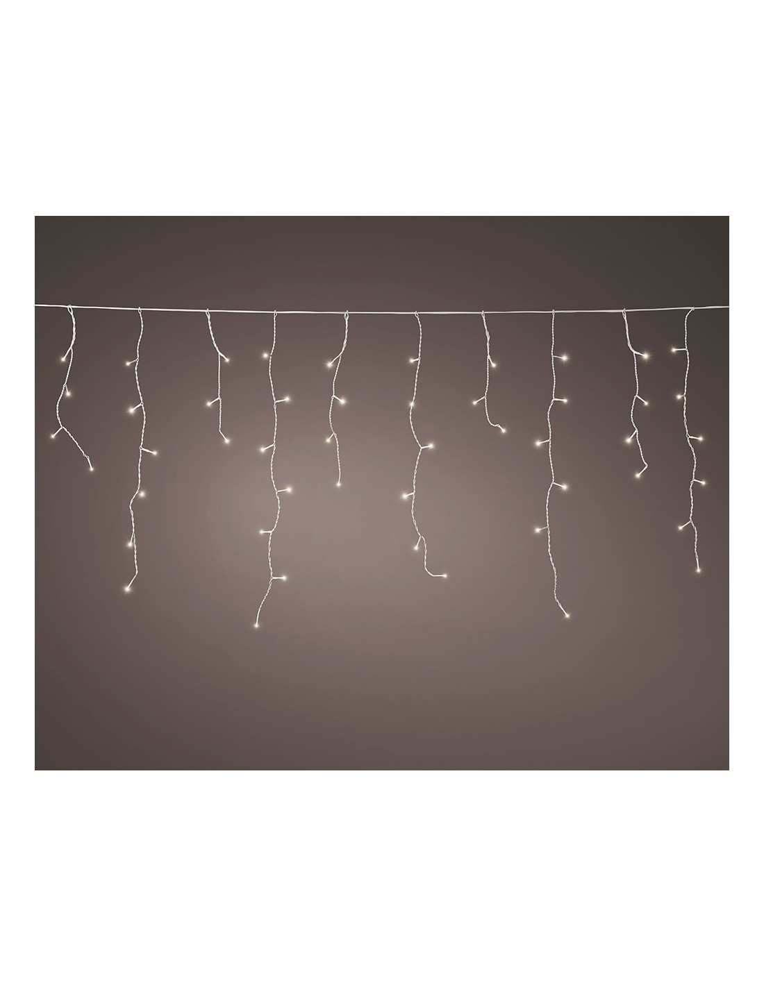 Cortina led de carámbano connect (interconectable) multifunción 250 leds luz cálida con efecto intermitente 220 - 240 v 50/60 hz, ip44, cable blanco, permite conectar hasta 3000 leds con el transformador de 12 w, 8 funciones, adaptador ce, cable alimentación 5 cm, distancia entre tiras colgantes 16 cm, longitud caida tiras máx. 70 cm, distancia entre la primera y la última tira 7,35 m, largo total 12,35 m temporizador: 8 h encendido / 16 h apagado, incluye transformador 12 w