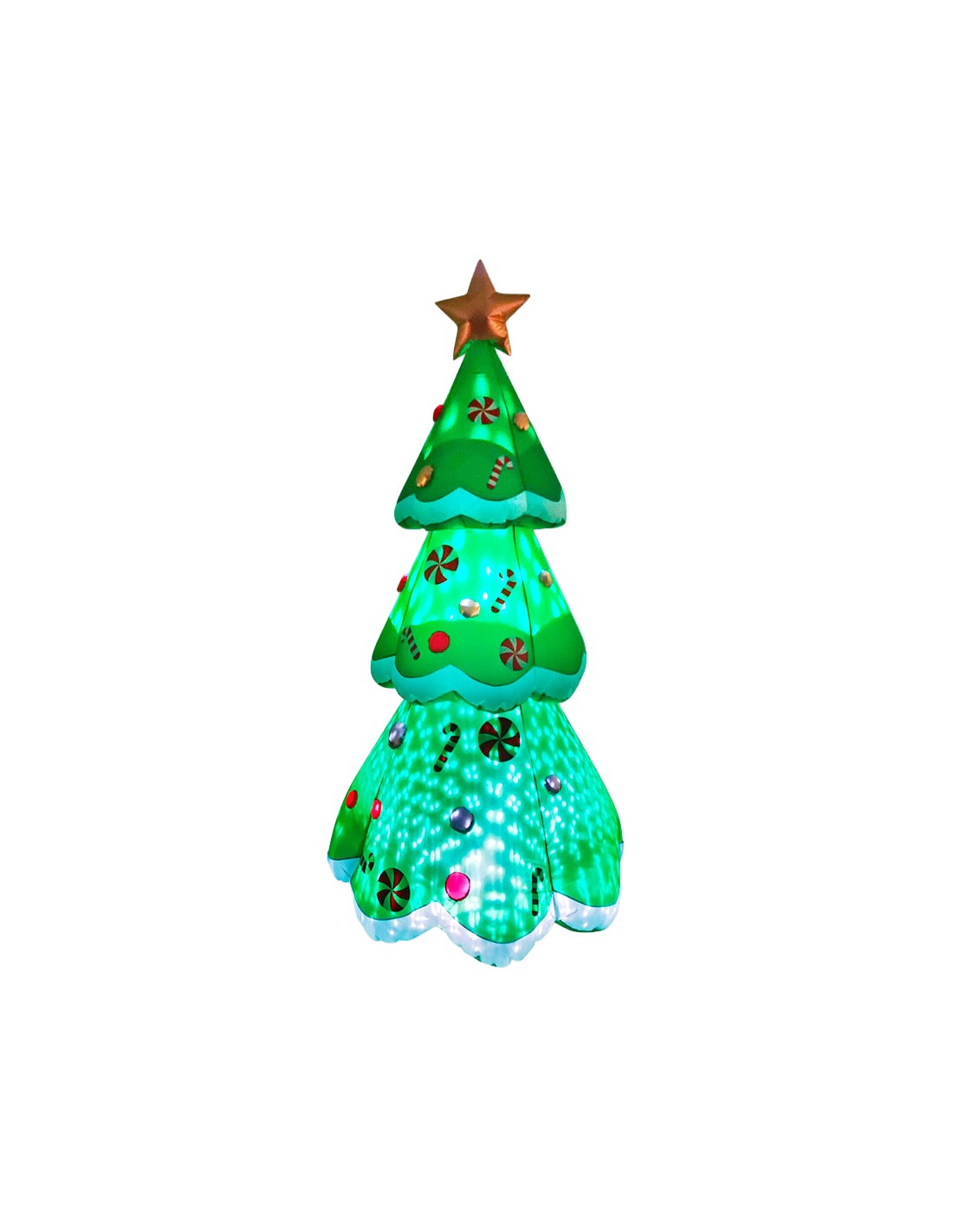 Arbol de navidad hinchable con iluminación led 12 v, 12 w, 220 - 240 v ~50/60 hz , para exterior ip44, con adaptador y ventilador, material poliéster / polipropileno, cable 2 m, contiene 3 estacas y 3 cuerdas para poder fijarlo, dimensiones: 110 x 110 x 240 cm