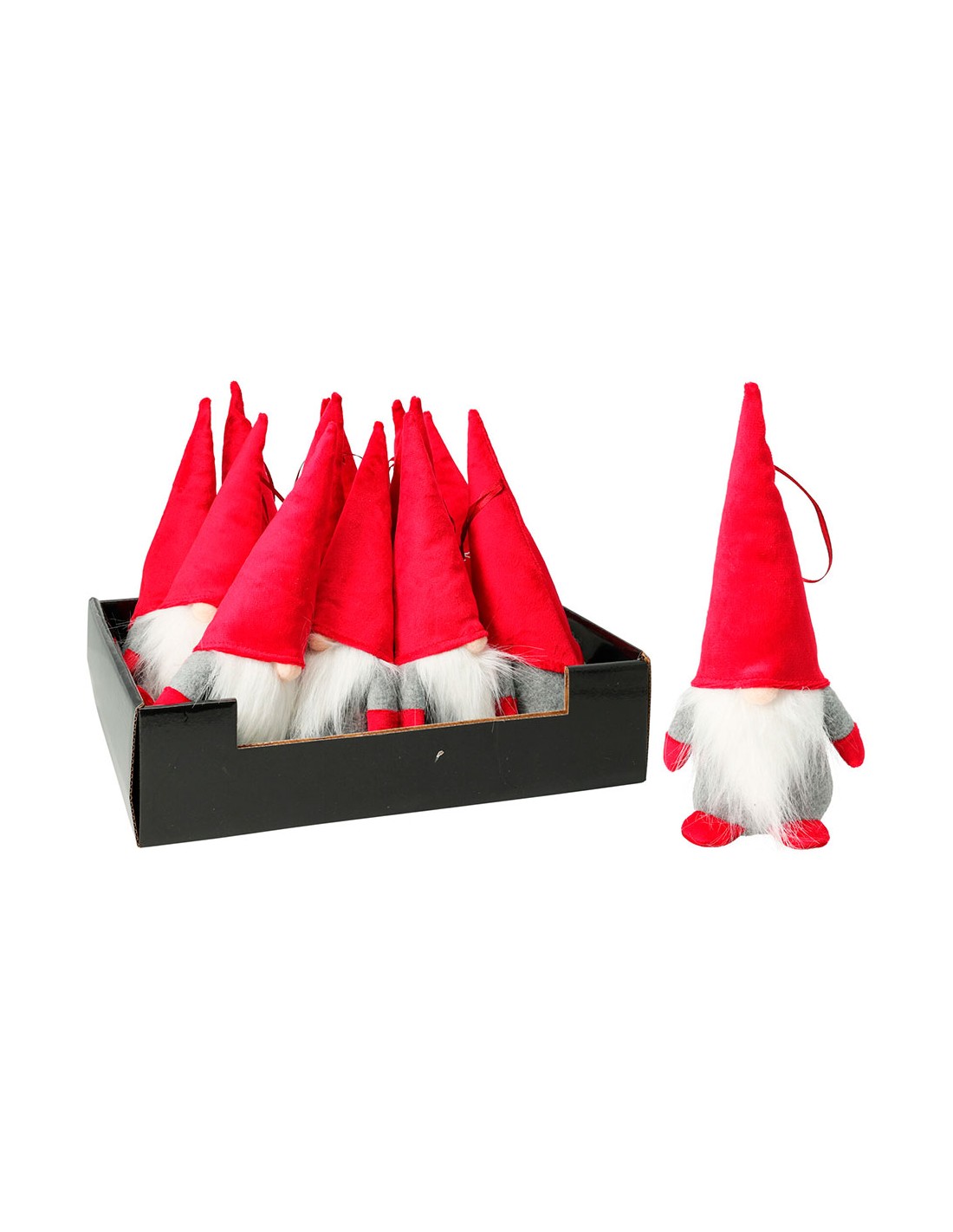 Gnomo gris con gorro rojo de terciopelo, material poliéster, espuma, con cinta para colgar. dimensiones 8 x 22 cm
