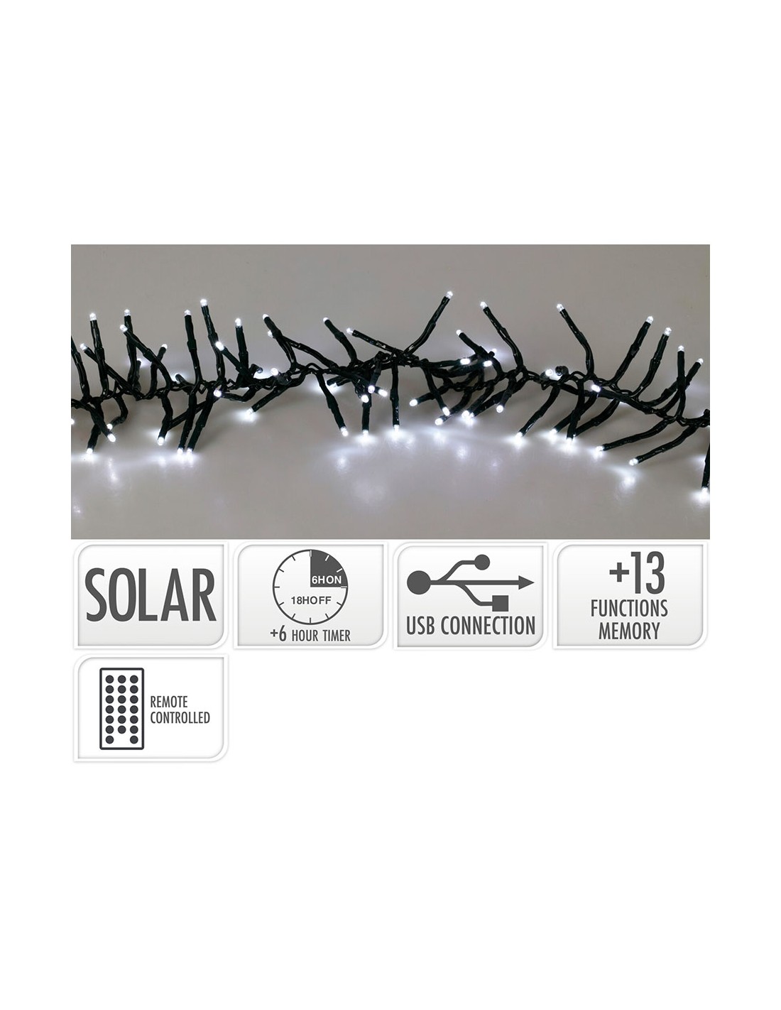 Guirnalda solar recargable, 768 led blanco. ip44, panel solar 24v 230 mha. 13 funciones y función de temporizador. se puede cargar por cable usb (incluido). batería recargable no reemplazable li-ron 3,7v. cable 3 m, longitud total 5,6 m. mando a distancia bateria cr2025 (incluido). carga 6 h aprox, tiempo de iluminación 40 h