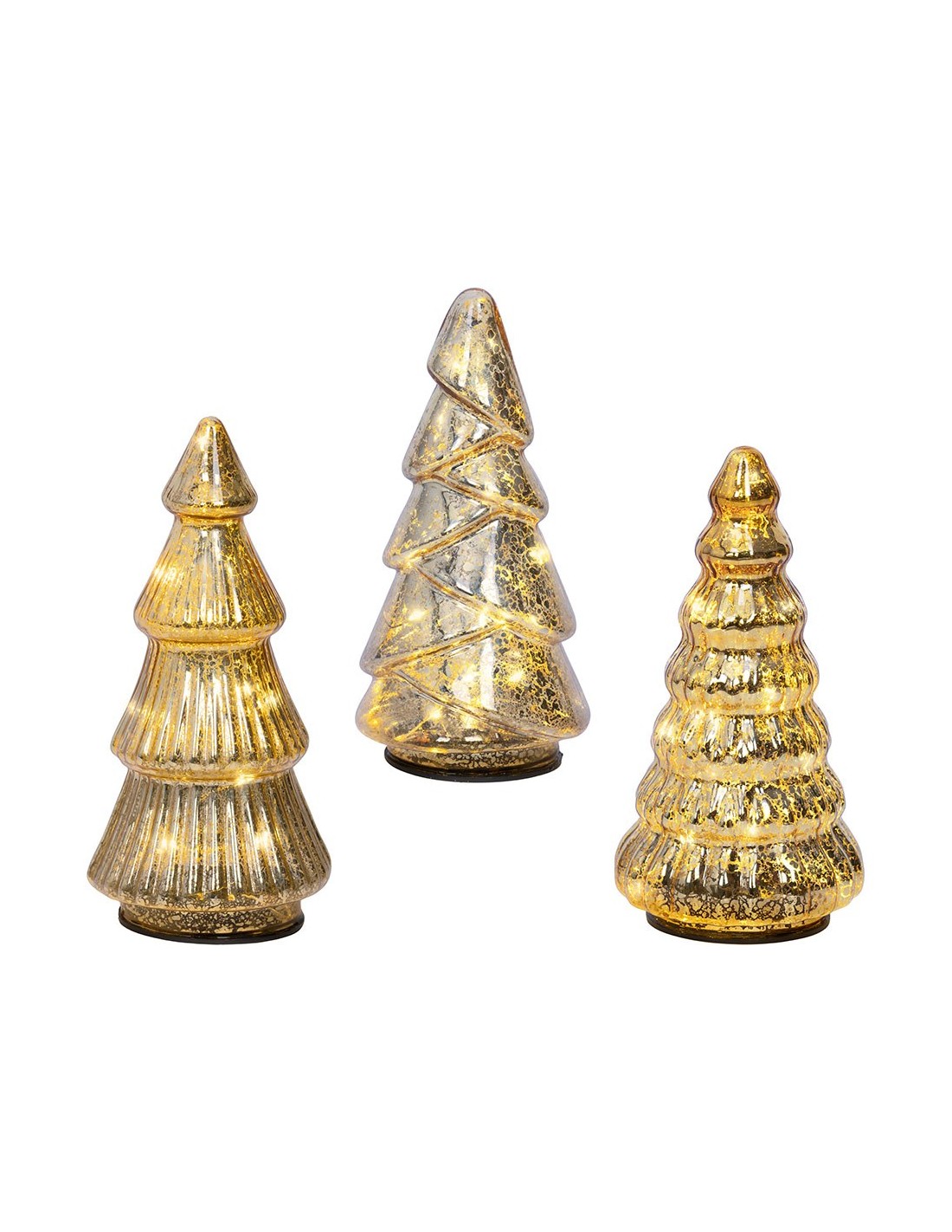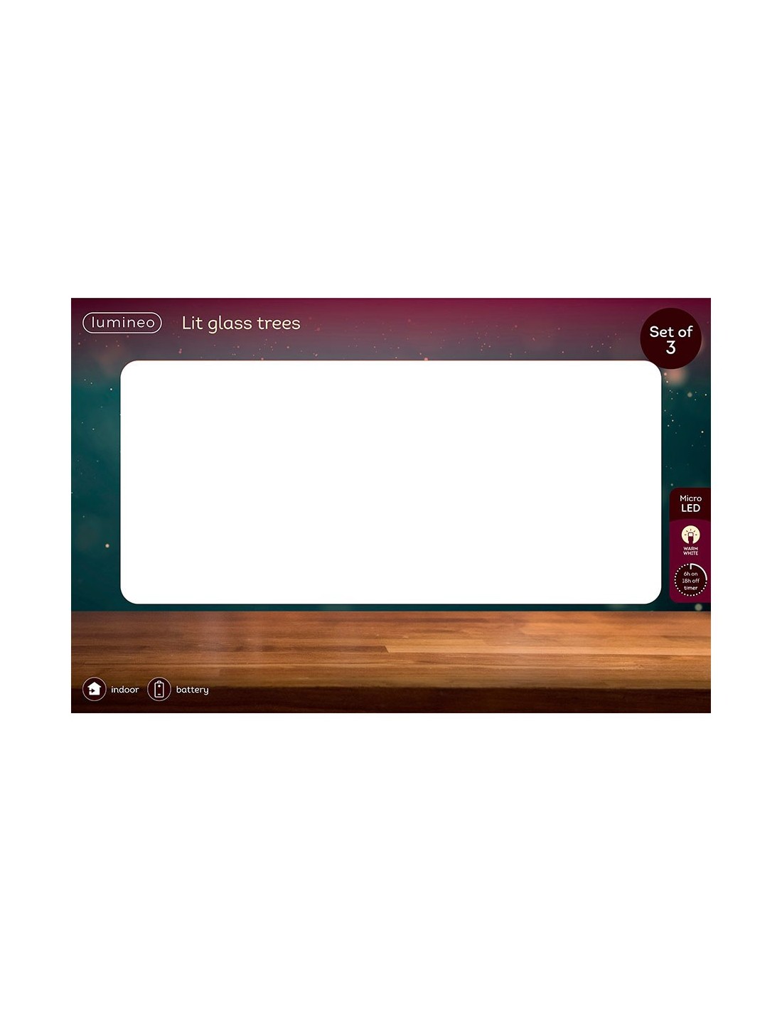 Árbol de vidrio con micro led, luz fija cálida, uso interior, modelos variados, 3 uds. temporizador: 6 h encendido / 18 h apagado. medidas: ø9 x 17,5 cm. funciona con pilas 2 x aaa (no incluidas)
