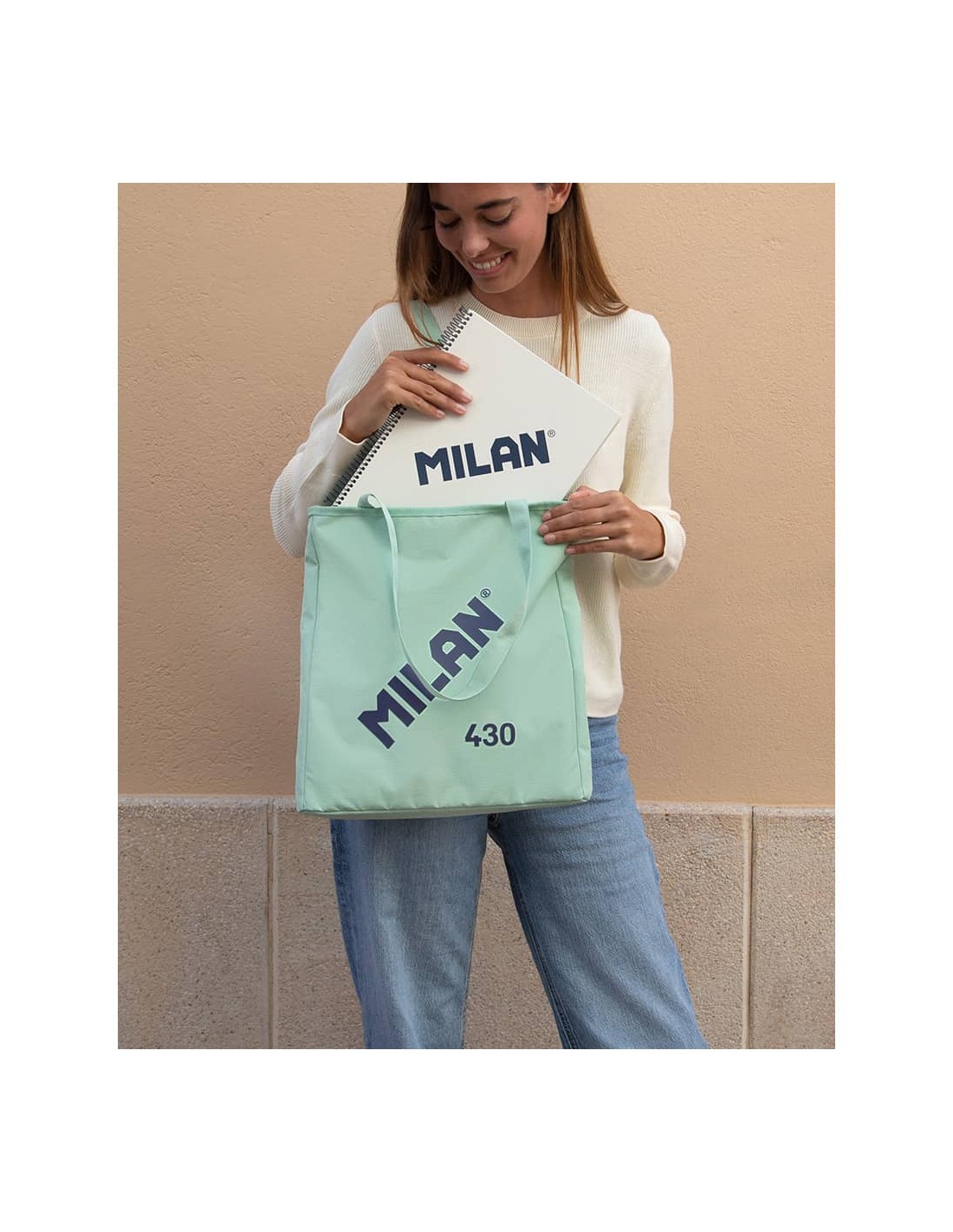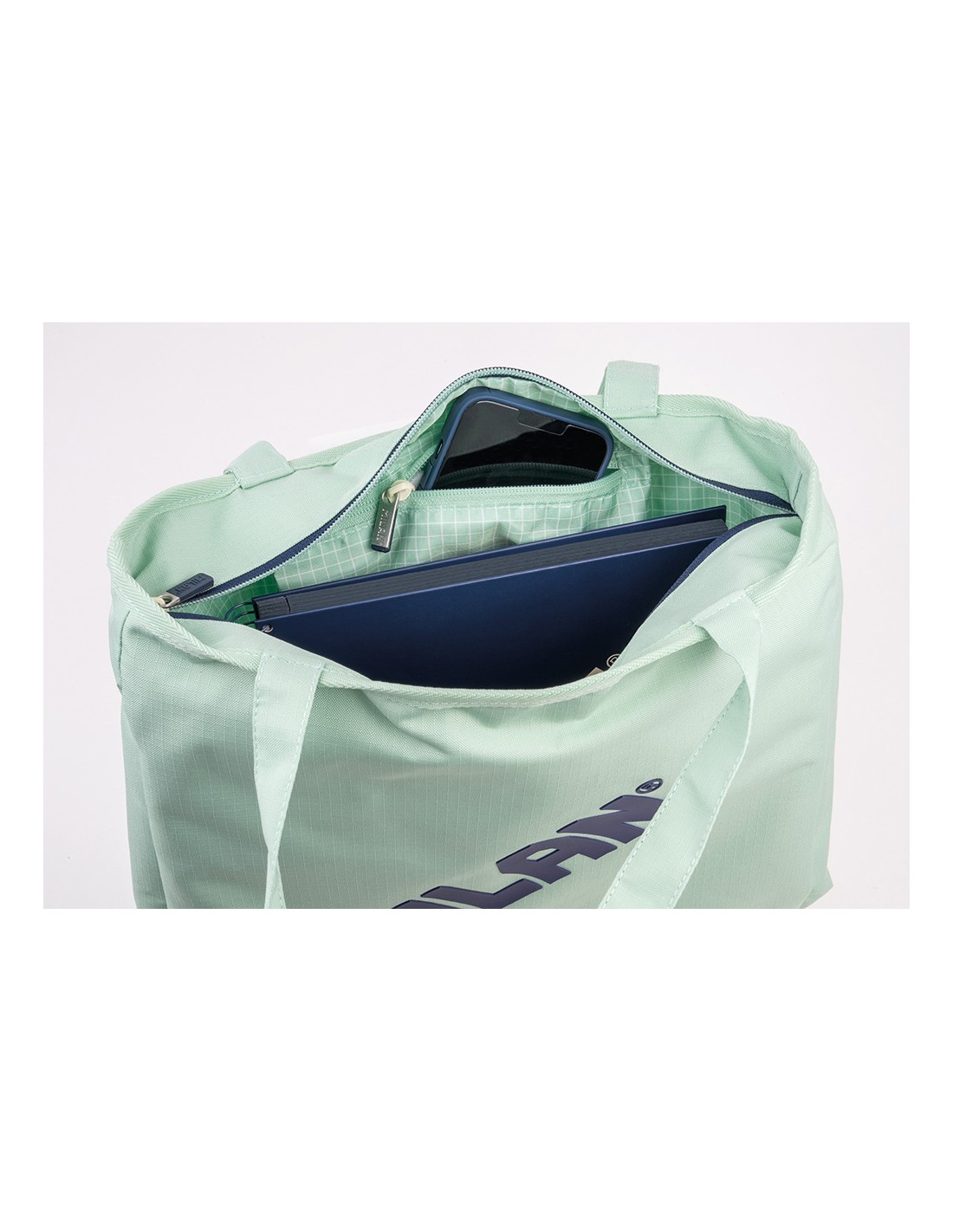Bolso shopper verde. cuenta con un compartimento principal que incluye un bolsillo interior, ambos con cierre mediante cremallera. ideal para llevar lo necesario para el día a día. el tejido 'ripstop' es ligero y resistente a la rotura. utiliza una técnica especial que teje hilos gruesos de refuerzo a intervalos regulares en un patrón entrecruzado. forro interior verde estampado con una cuadrícula que evoca la forma de las gomas milan. composición: poliéster. capacidad: 7,5 l. medidas: largo asa: 27 cm 38 x 36 x 6,5 cm