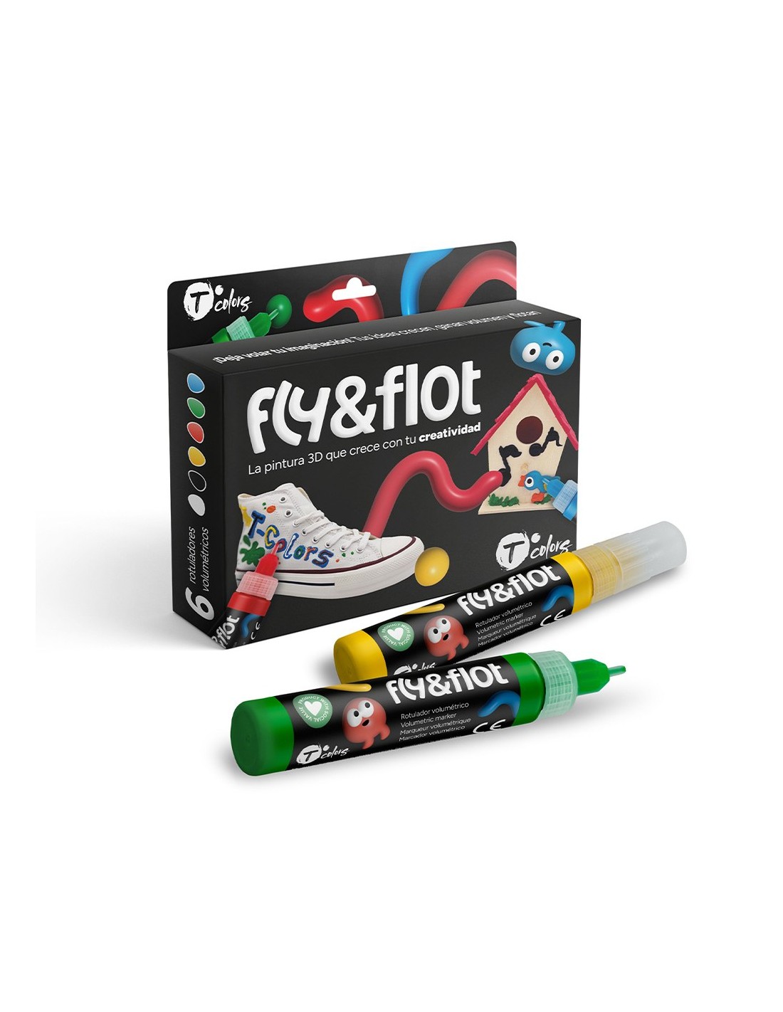 Rotuladores de pintura acrílica dimensional a base de agua que crea efectos con relieve, serie fly & flot, contiene: 6 rotuladores de 25 ml, guía de aplicación, 2 bases de soporte y 1 plantilla lista para usar. uso en frío, funciona en muchas superficies como cartón, plástico, tela, flota en el agua, secado al aire libre en 24 h