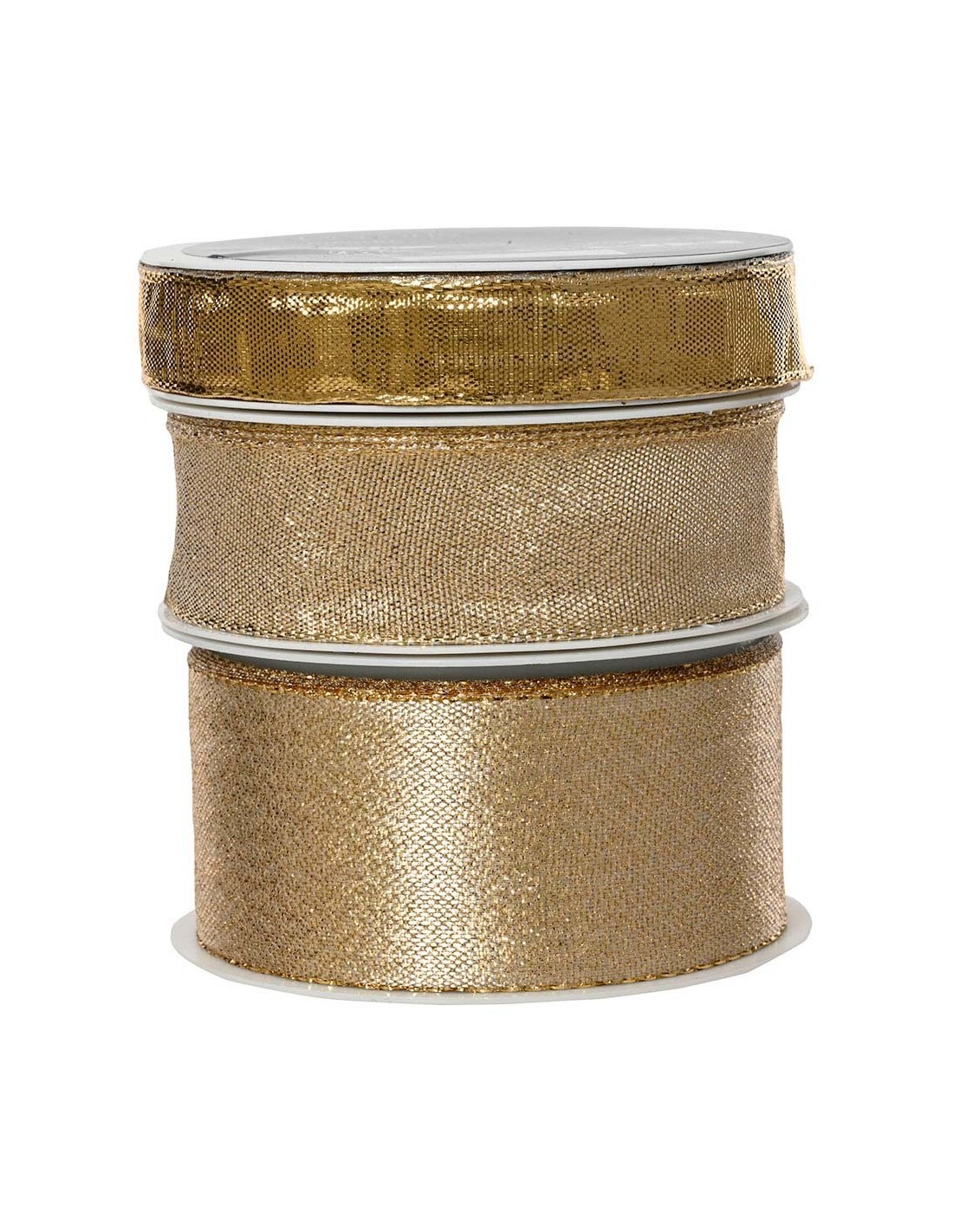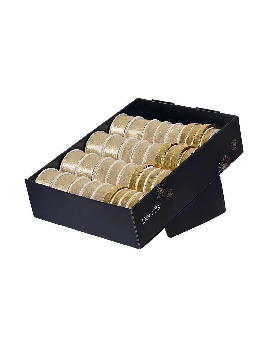 Cinta poliéster dorada modelos variados. medidas: 4 x 200 cm, 2,5 x 300 cm y 1,5 x 400 cm. presentado en expositor de 36 uds