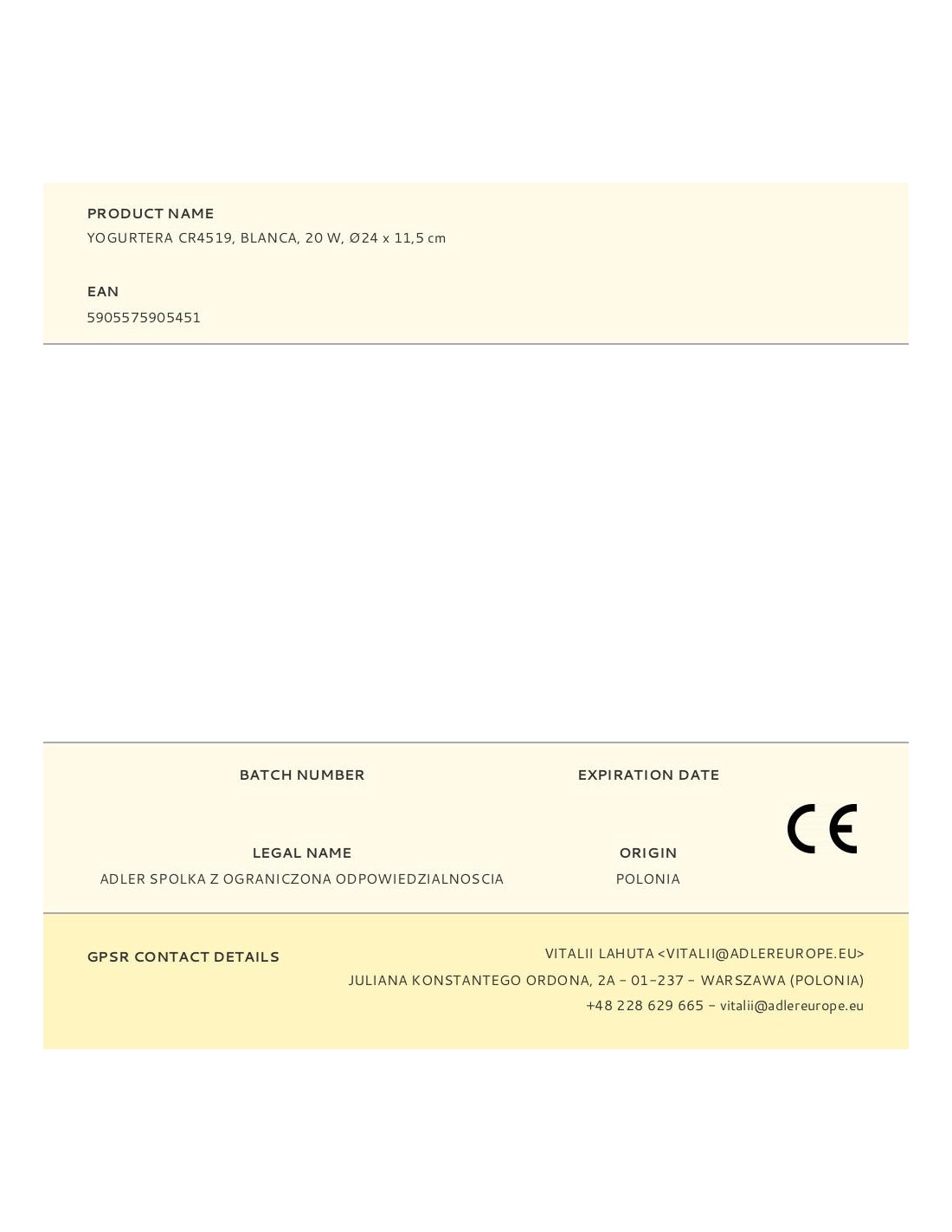 Yogurtera cr4519, blanca, 20 w, ø24 x 11,5 cm