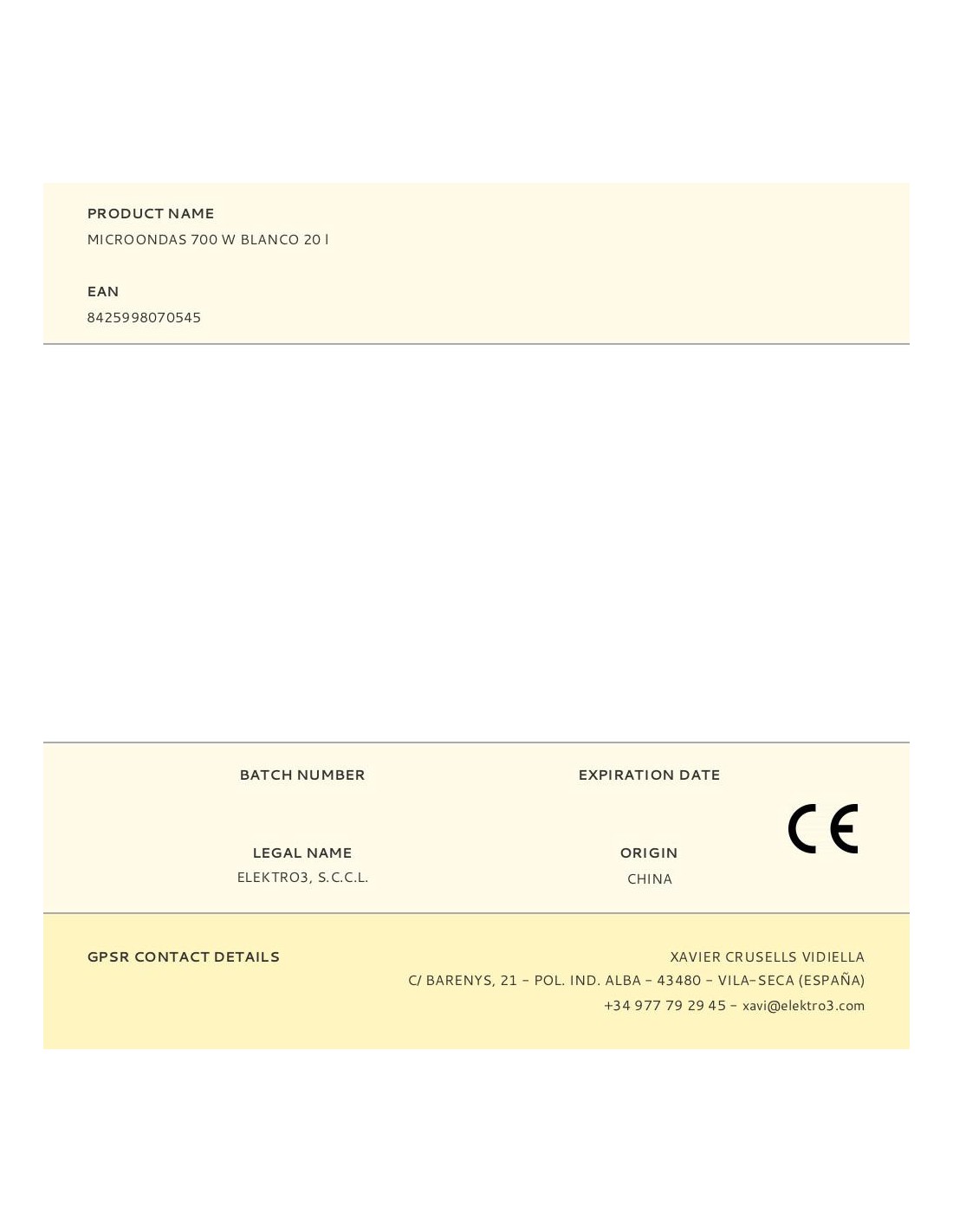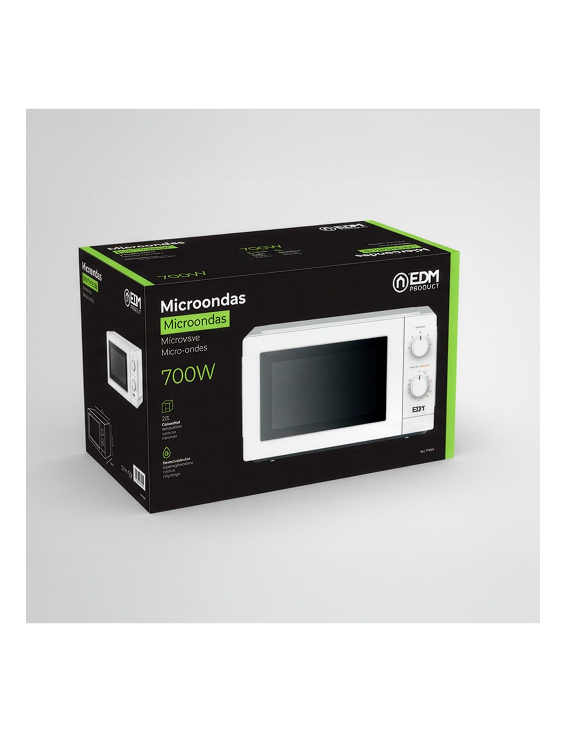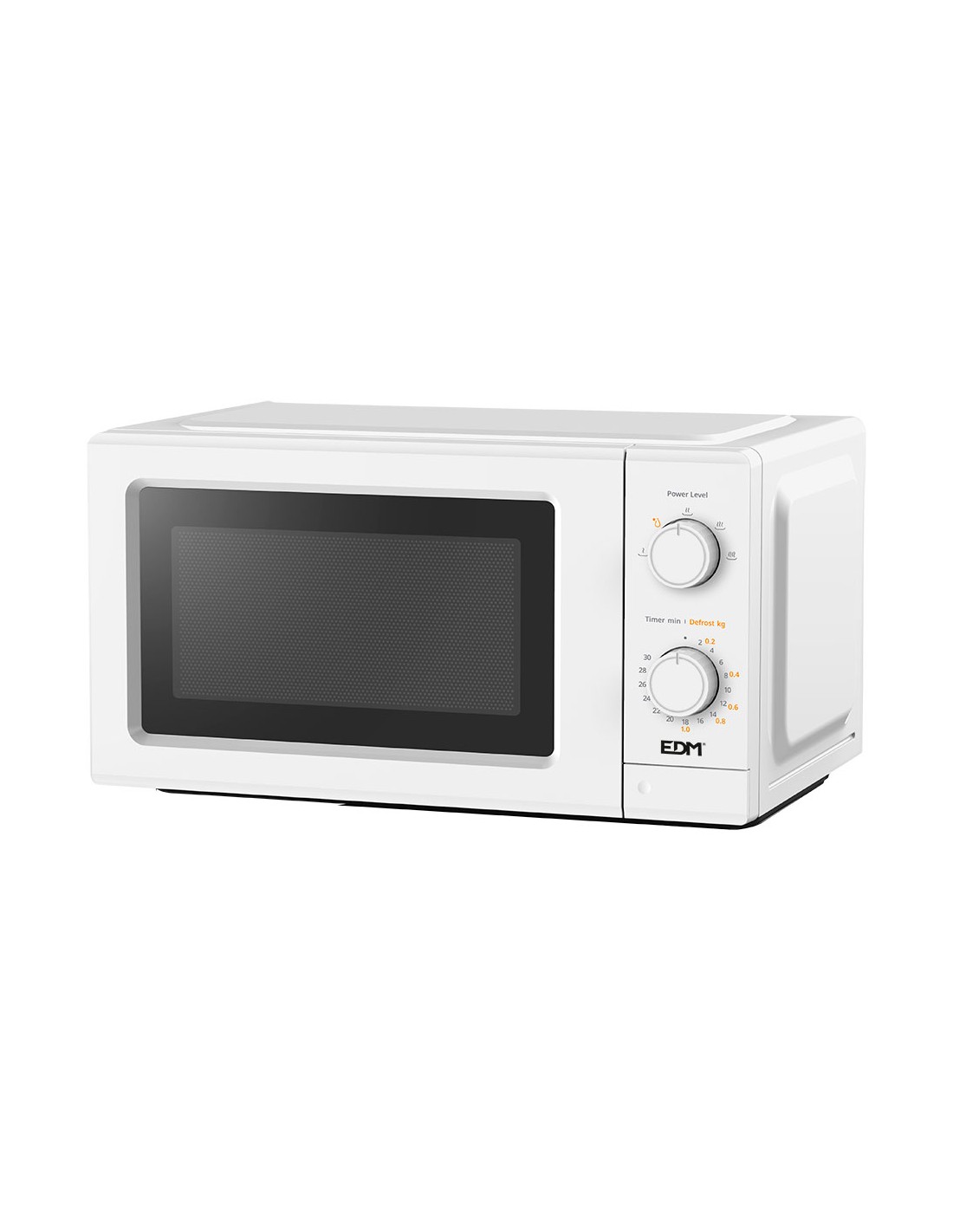 Microondas 700 w blanco, capacidad 20 l, 230 v ~ 50 hz ac. 5 niveles (4 niveles + 1 función descongelación). función de descongelación con elección por peso o tiempo, temporizador hasta 30 min (con timbre), plato giratorio de ø24,5 cm, base antideslizante. dimensiones 43,4 x 32,9 x 24,1 cm