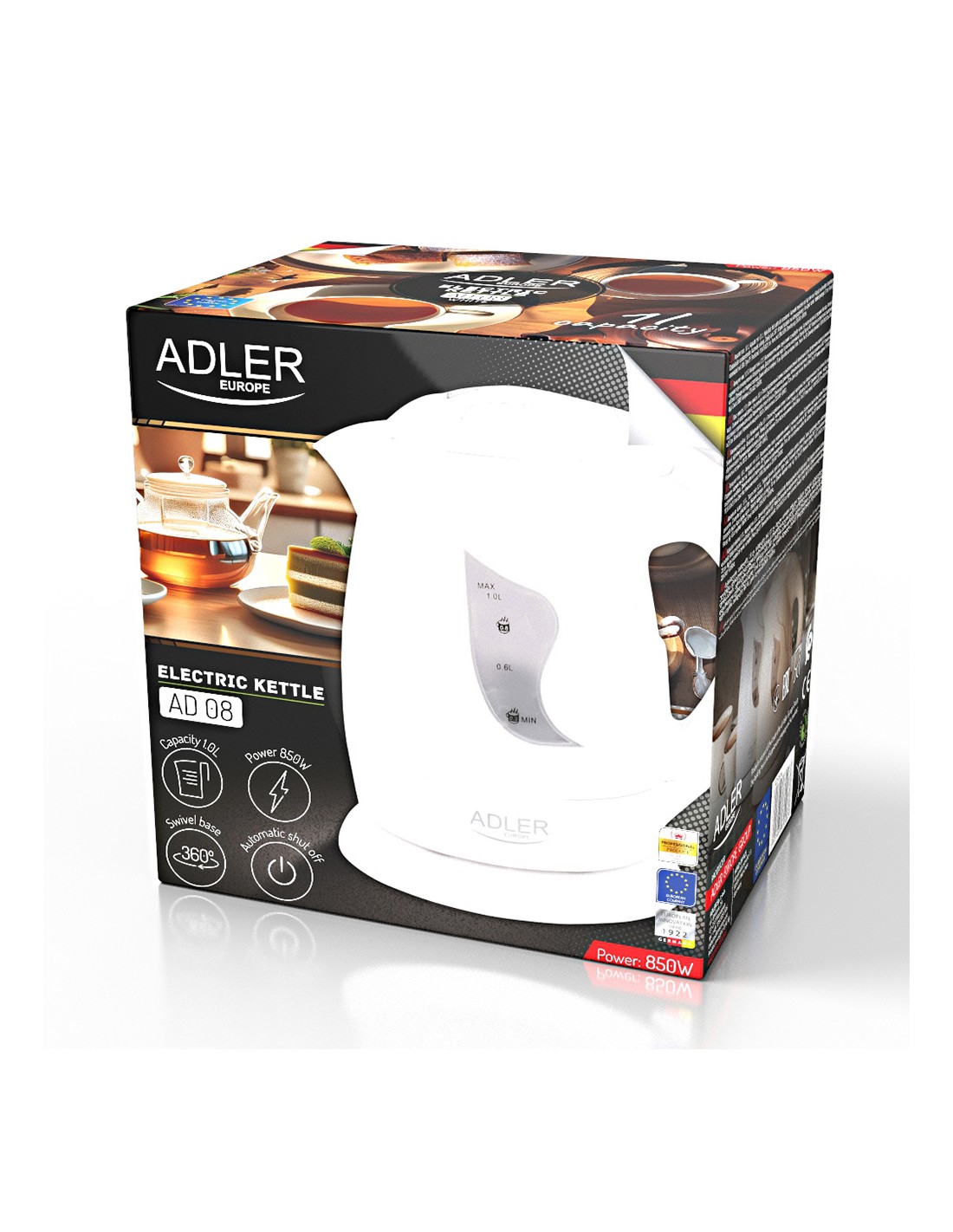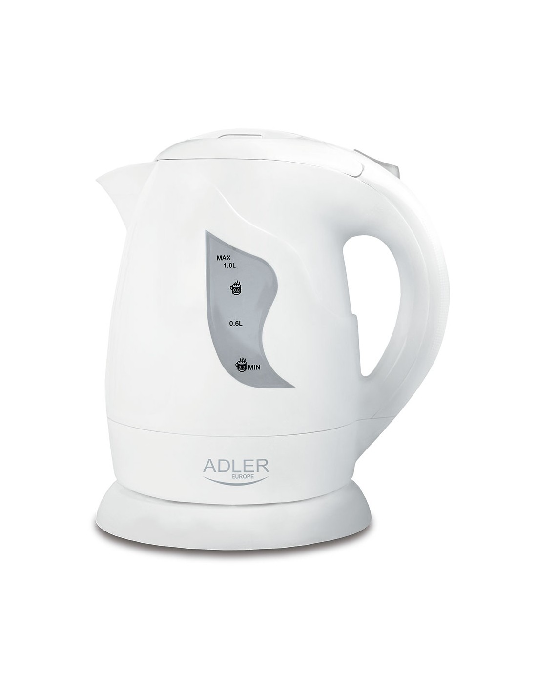 Hervidor de agua ad 08, 850 w, capacidad máxima 1 l, mínima 0,3 l elemento calefactor plano de acero inoxidable, protección contra ebullición sin agua filtro que detiene los depósitos de cal, luz indicadora, indicador de nivel de agua de doble cara, apagado automático, base giratoria 360°, botón de apertura de tapa, carcasa polipropileno, compartimento de almacenamiento para el cable de alimentación, longitud del cable 66 cm 220-240 v~50-60 hz 21 x 19 x 15 cm