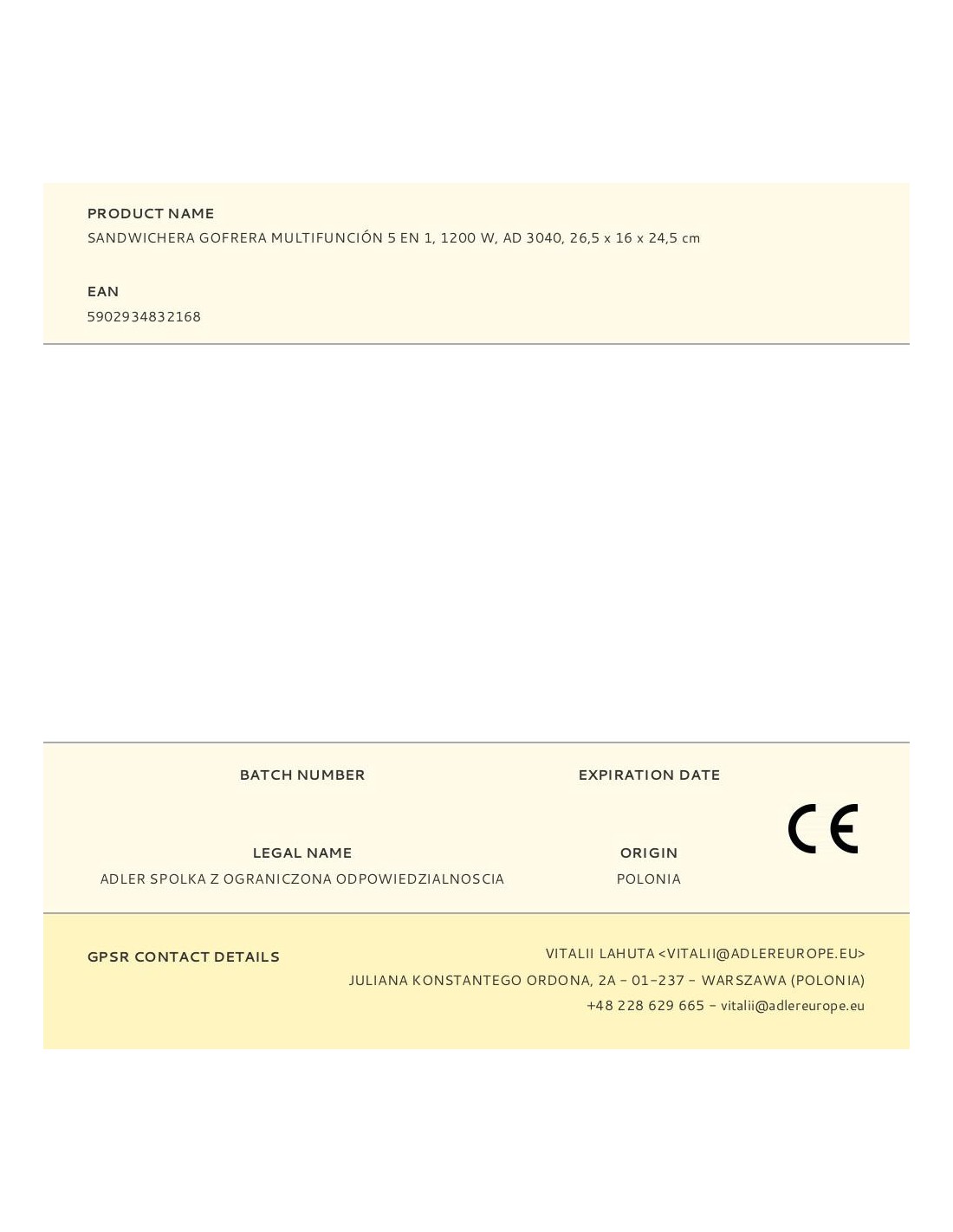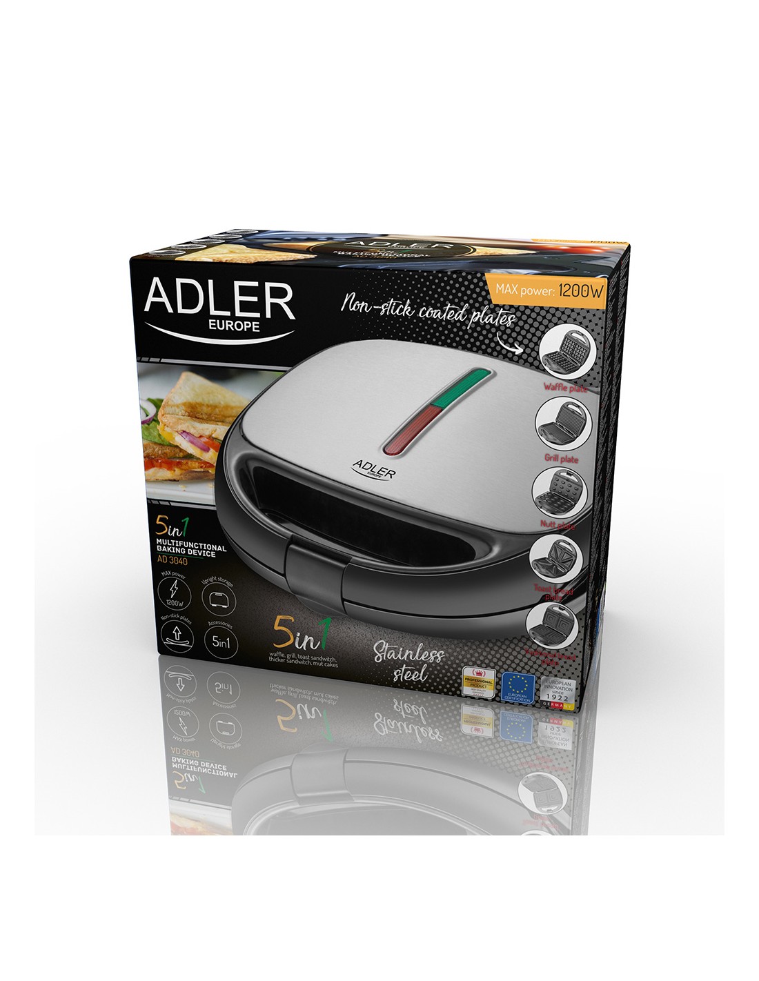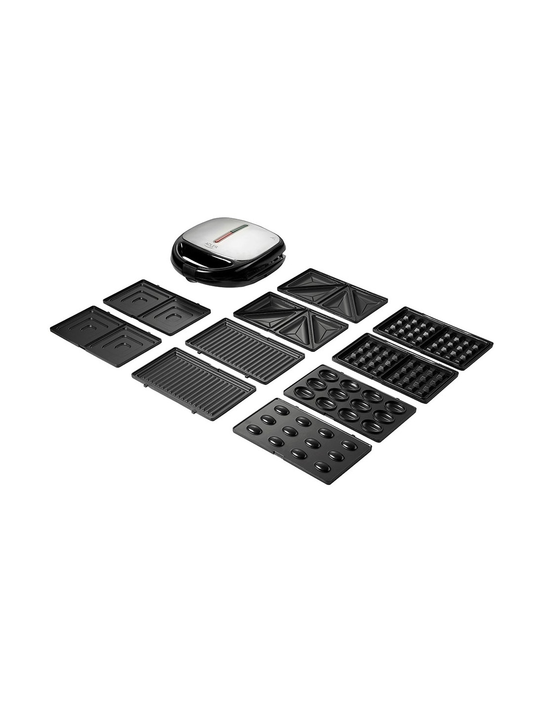 Sandwichera multifunción 5 en 1 ad 3040 1200 w incluye 5 placas de acero antiadherente intercambiables: sandwich pan tostado (triangulares), sandwich tradicional (cuadradas), parrilla de contacto, gofres, molde forma de nuez asas termoaislantes, dos luces indicadoras: encendido y calentando, patas de goma antideslizantes, sistema de fijación de placas sencillo, protección sobrecalentamiento, potencia: nominal 800 w, máxima 1200 w 220-240 v~50-60 hz 26,5 x 16 x 24,5 cm