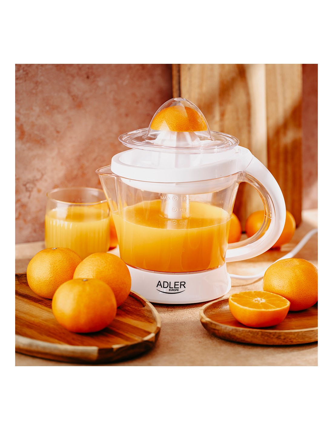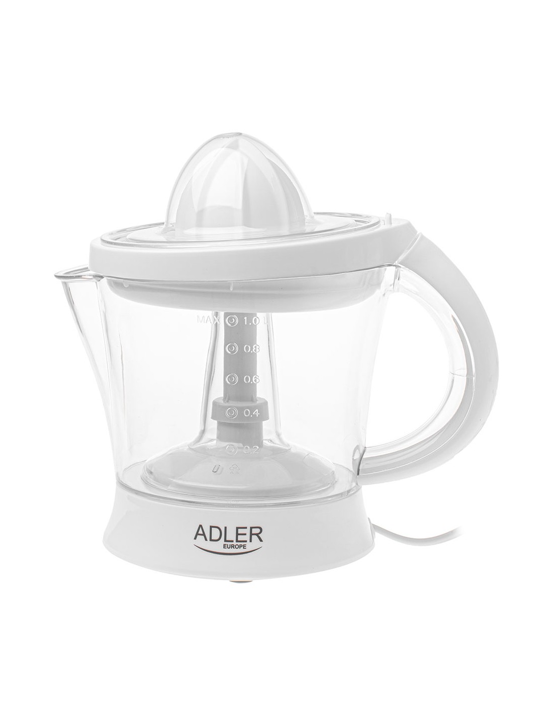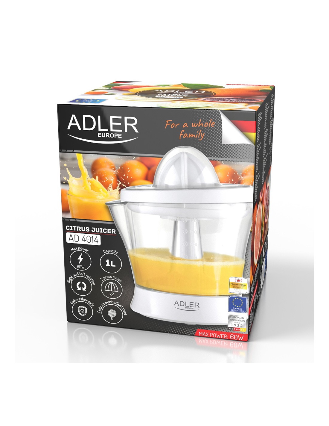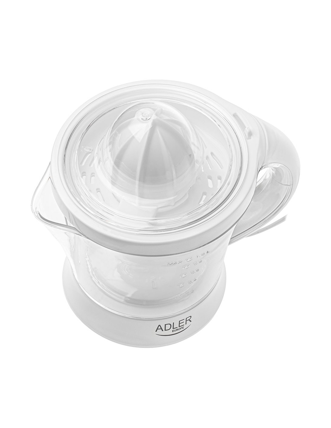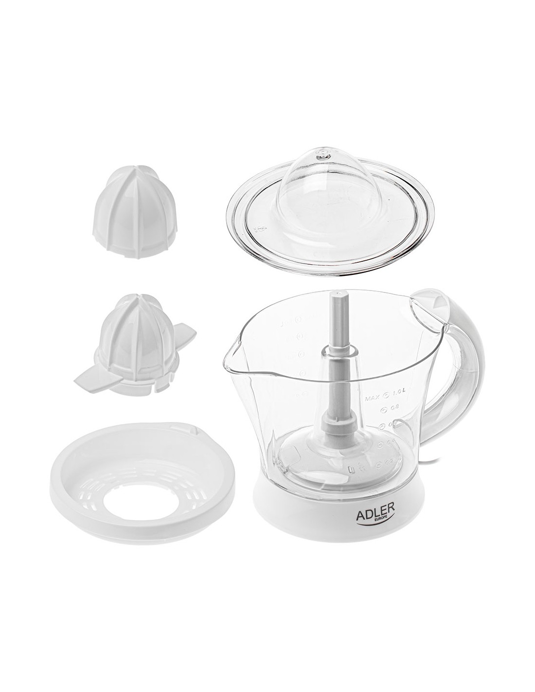 Exprimidor ad 4014, blanco, 60 w dos conos exprimidores intercambiables para frutas cítricas pequeñas y grandes, arranque y parada automáticos, giro izquierda y derecha, regulación de la cantidad de pulpa en el jugo, tapa de jarra, cable retráctil, apto para lavavajillas, capacidad 1l, potencia: nominal 40 w, máxima 60 w 220-240 v~50-60 hz 17 x 17,5 x 21,5 cm