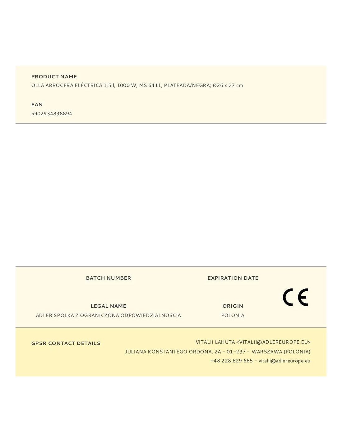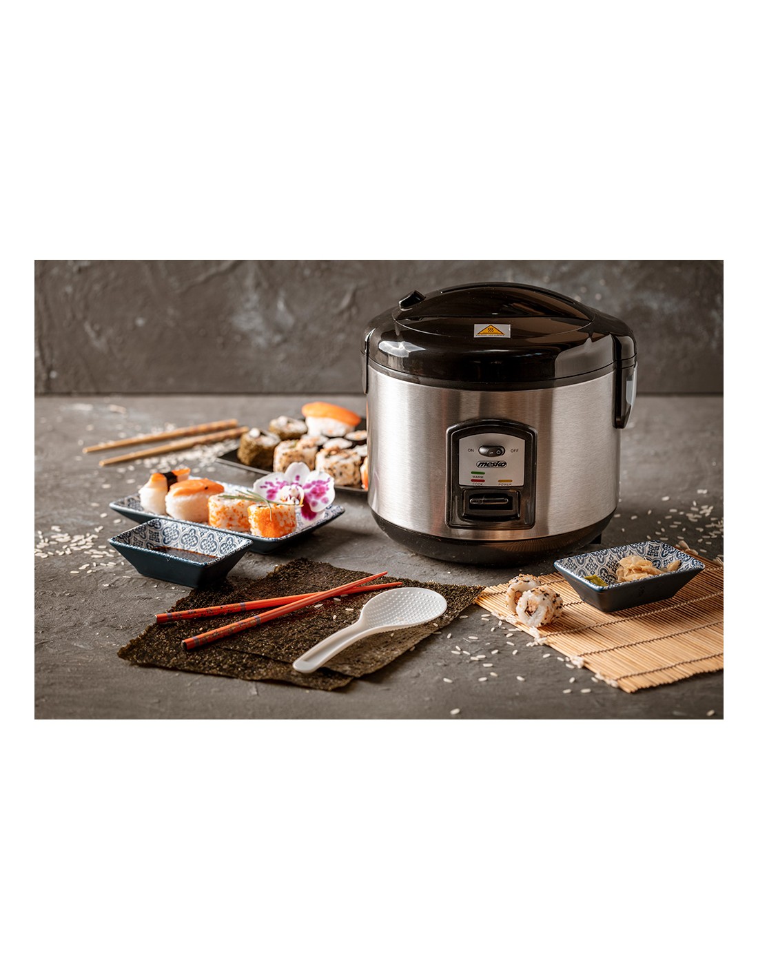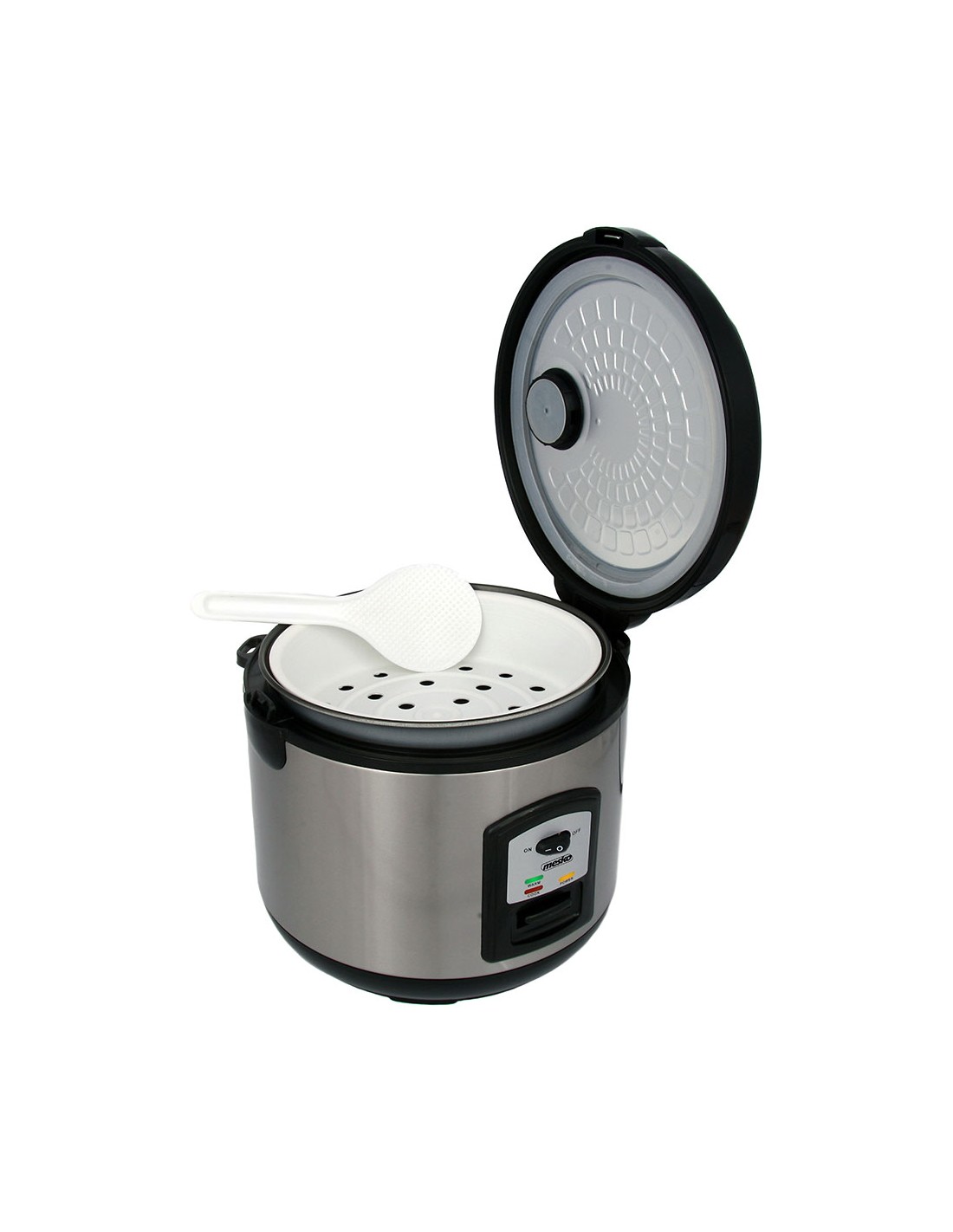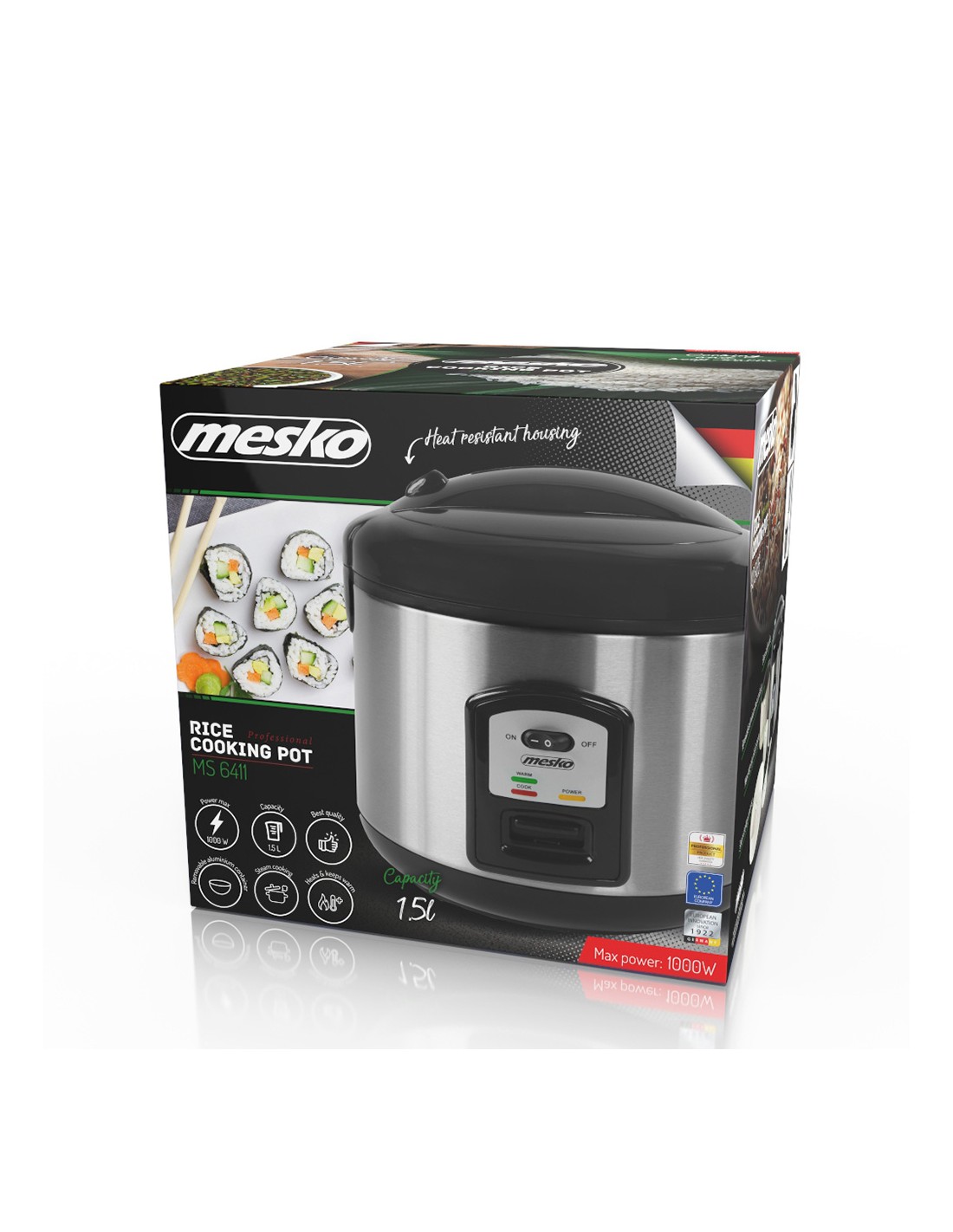 Olla arrocera ms 6411 1000 w 1,5 l carcasa resistente al calor, contenedor interior extraíble, 2 funciones: cocinar y mantener caliente, tapa de seguridad con válvula de liberación de vapor, soportes antideslizantes, incluye taza medidora y cuchara contenedor ø21,2 x 11 cm potencia: nominal 500 w, máxima 1000 w longitud de cable 119 cm 220-240 v~50-60 hz ø26 x 27 cm