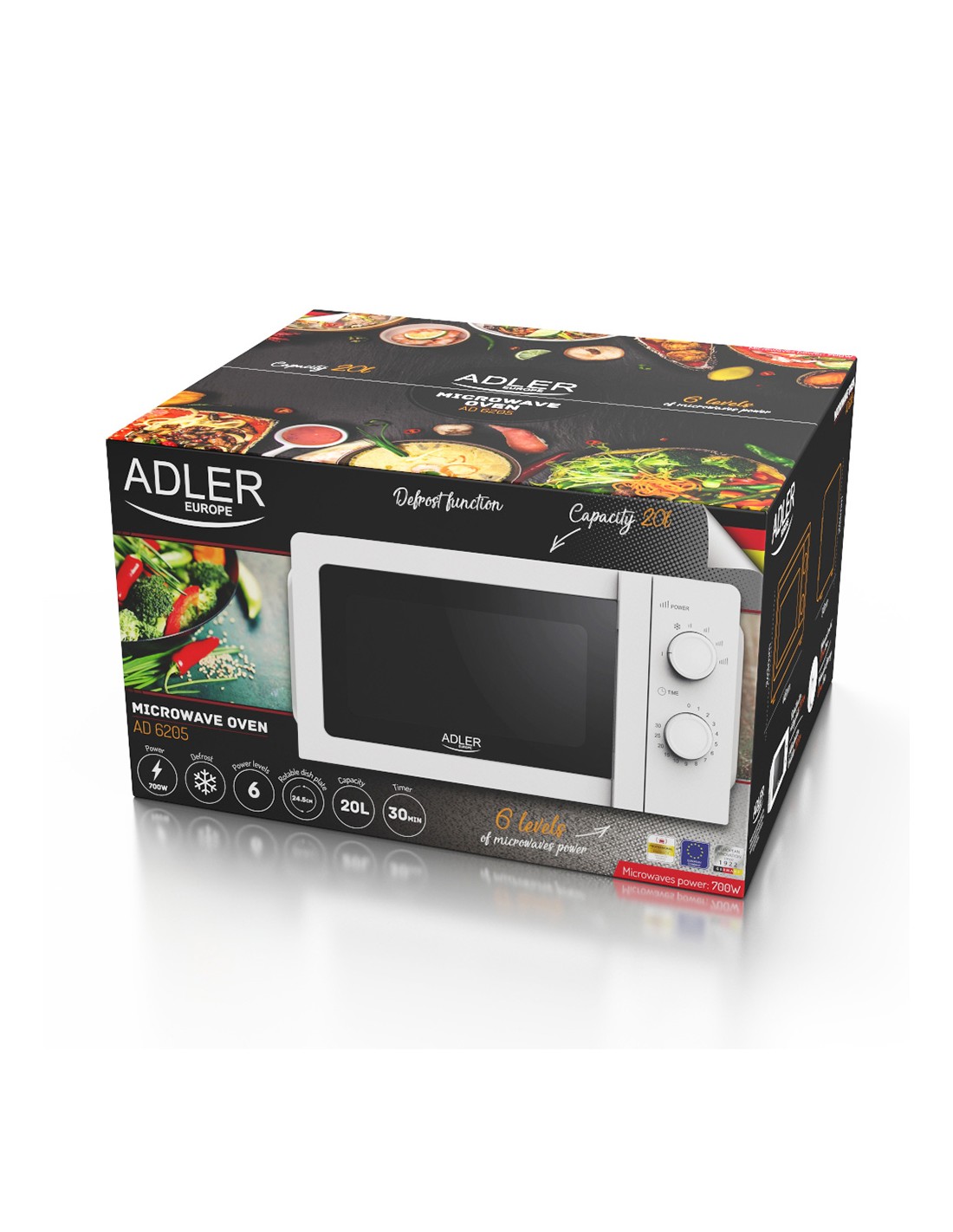 Microondas ad 6205, 700 w, 20 l 5 niveles de potencia + función descongelación, control mecánico, temporizador hasta 30 minutos, plato giratorio de ø24 cm, iluminación interior longitud de cable 102 cm 220-240 v~50-60 hz 44,6 x 34 x 24,3 cm