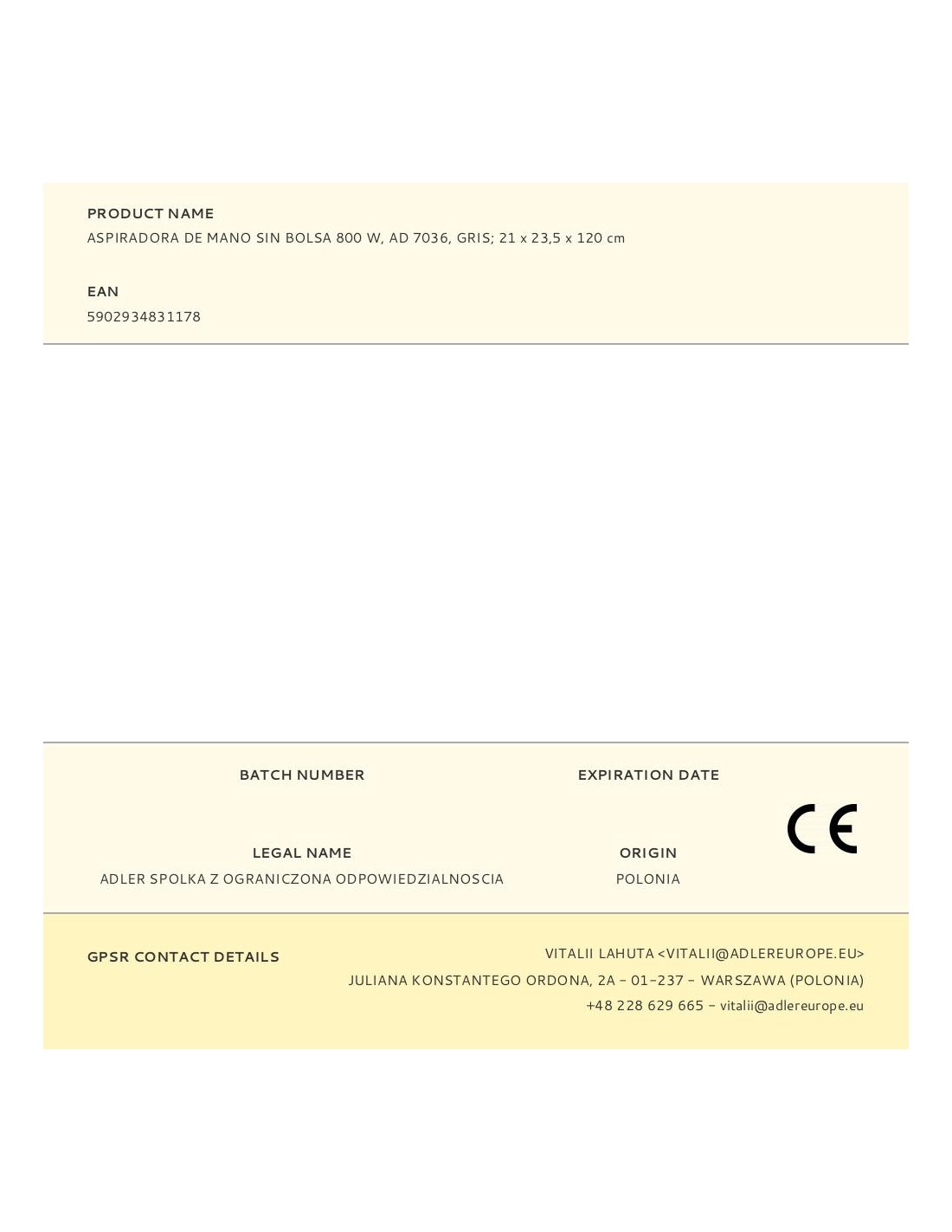 Aspiradora escoba ad 7036 con cable sin bolsa 800 w cable de alimentación de 5,5 m, área de trabajo de 7 m, incluye 3 cabezales, recipiente de plástico y filtro aptos para limpieza con agua, capacidad depósito de polvo 1,5 l, sensor térmico que protege el dispositivo contra el sobrecalentamiento, 220-240 v~50-60 hz 21 x 23,5 x 120 cm