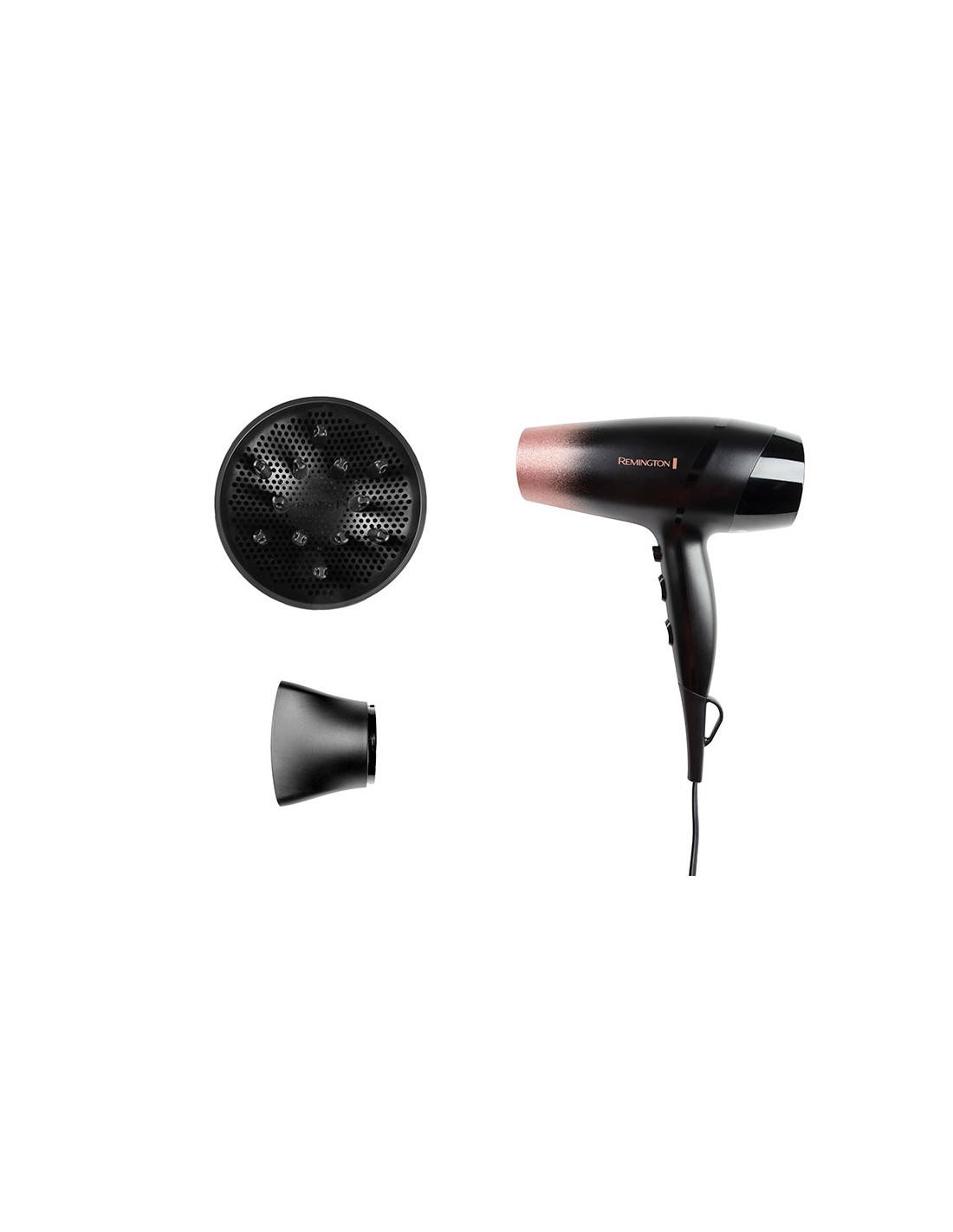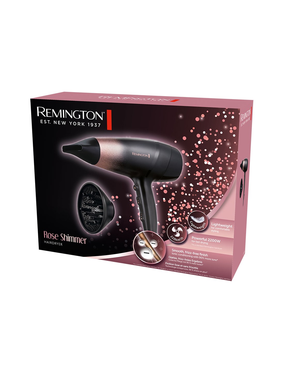 Secador de cabello rose shimmer con acondicionamiento iónico para un acabado suave y brillante. potencia de 2200 w con caudal de aire de 110 km/h para un secado rápido. ligero, para usar con mayor comodidad. dispone de 3 temperaturas y 2 velocidades. rejilla con revestimiento de cerámica. ráfaga de aire frío. incluye rejilla trasera desmontable fácil de limpiar, gancho para colgar y difusor