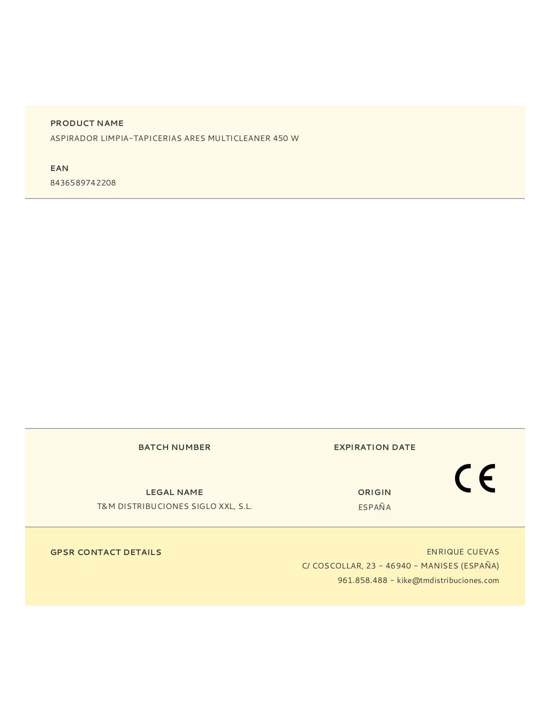 Aspirador limpia-tapicerías ares multicleaner 450 w. pensado para aspirar tapicerías, alfombras, sofás y colchones. potencia de succión: 13 kpa. tanque extraíble de agua limpia 1,8 l tanque extraíble de agua sucia 0,9 l longitud manguera: 1,5 m cable de alimentación de 5 m nivel de ruido 80 db. función especial de autolimpieza integrada. incluye: cabezal para mascotas, cepillo multiusos, soporte para accesorios y funda de autolimpieza