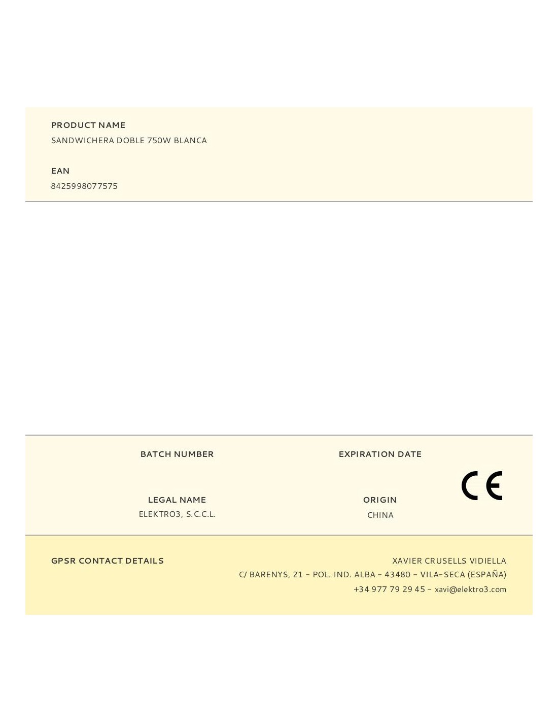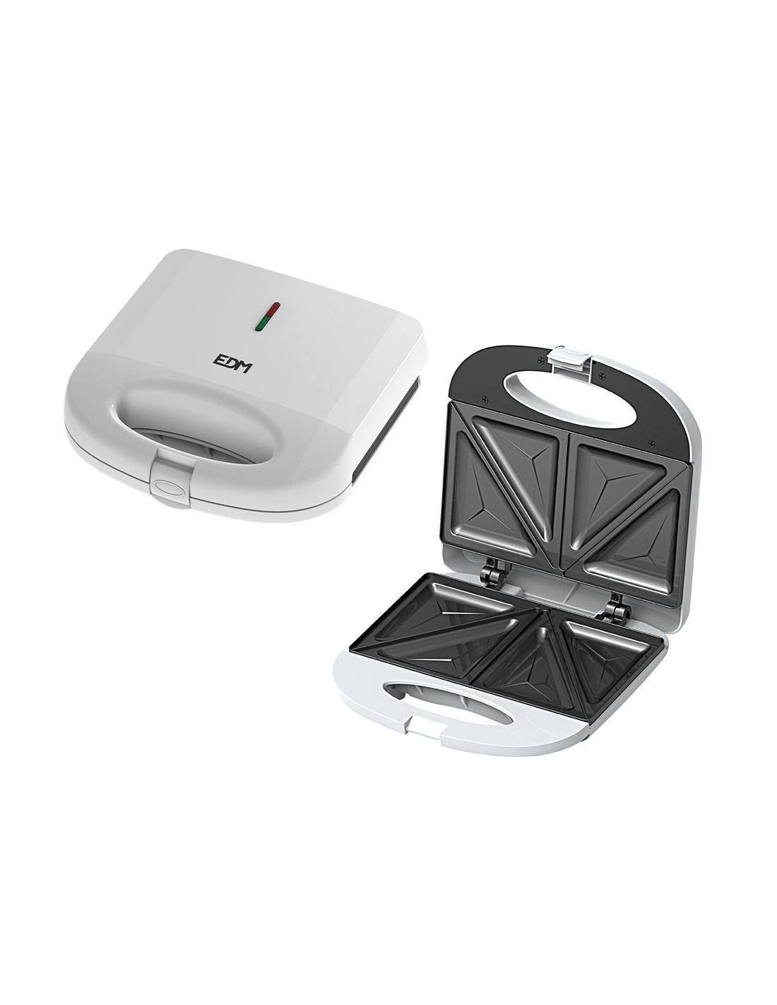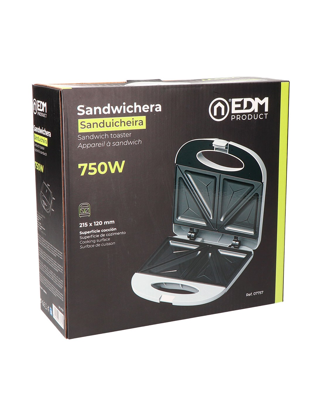 Sandwichera doble, potencia 750 w. superficie y asa de toque frío, superficie antiadherente, fácil limpieza, cierre de seguridad, control de sobrecalentamiento, 220 - 240 v ~ 50/60 hz. medidas: 21,7 x 21,6 x 8,5 cm, acabado en color blanco