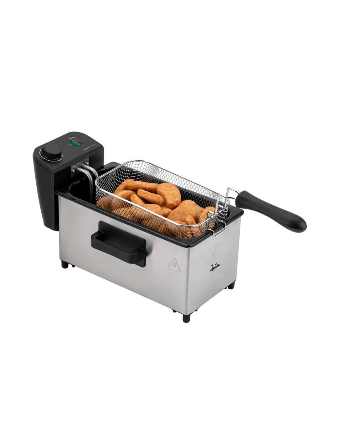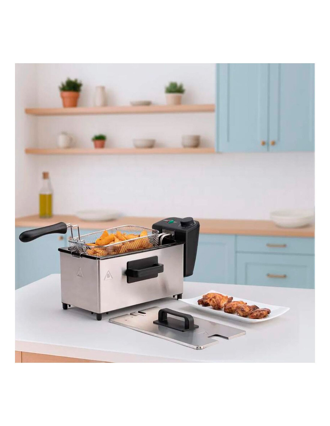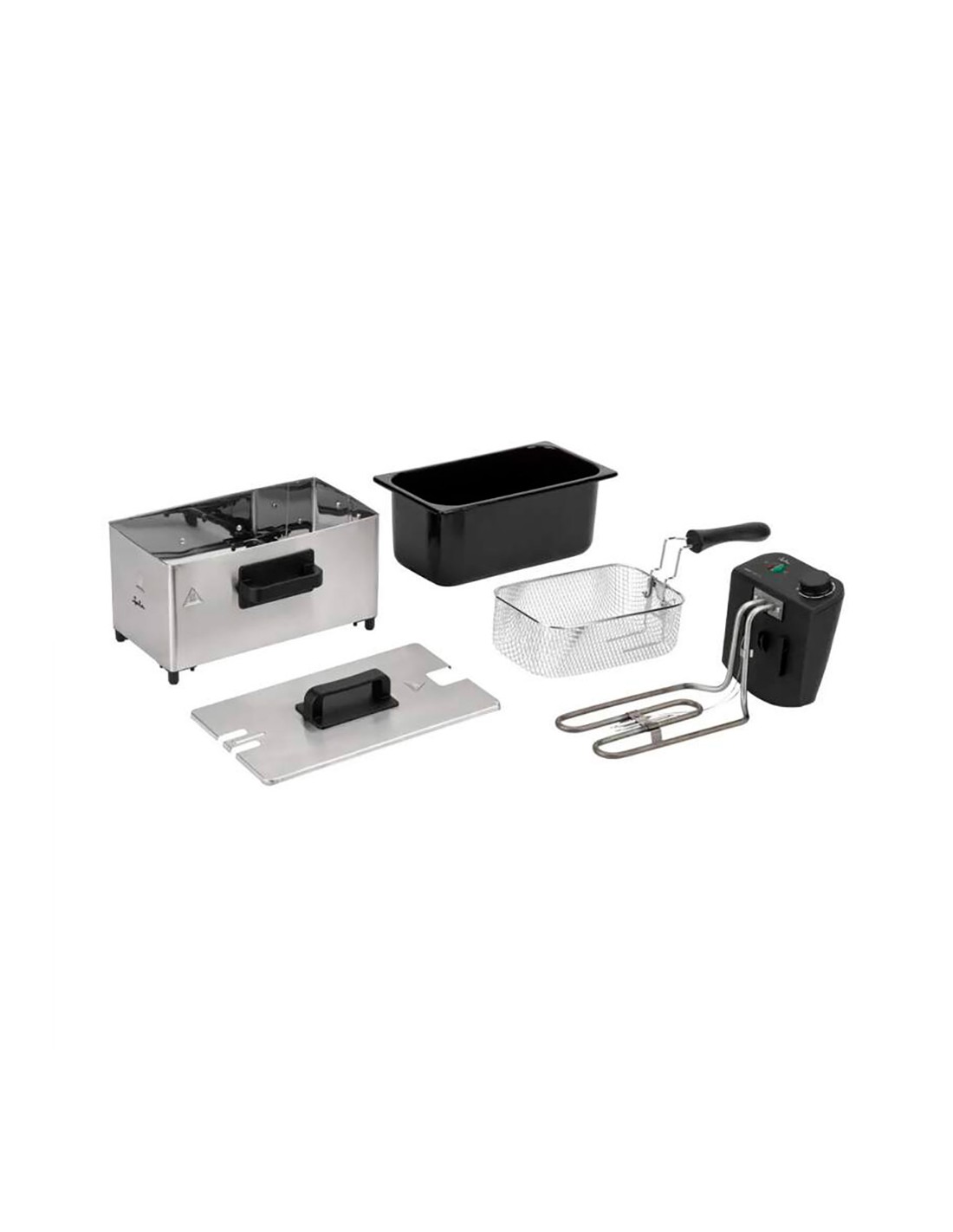 Freidora 3 l, 2000 w, 230 v, con resistencia inox sumergida, cuerpo de acero inoxidable, cestillo con mango abatible, cuba esmaltada extraíble, 100% desmontable para su fácil limpieza, termostato de temperatura regulable, sistema cool zone antimezcla de sabores, protección sobrecalentamiento, indicadores luminosos de encendido y preparado, tapa inoxidable con asa, apta para colocar durante la fritura, asas laterales y base antideslizante